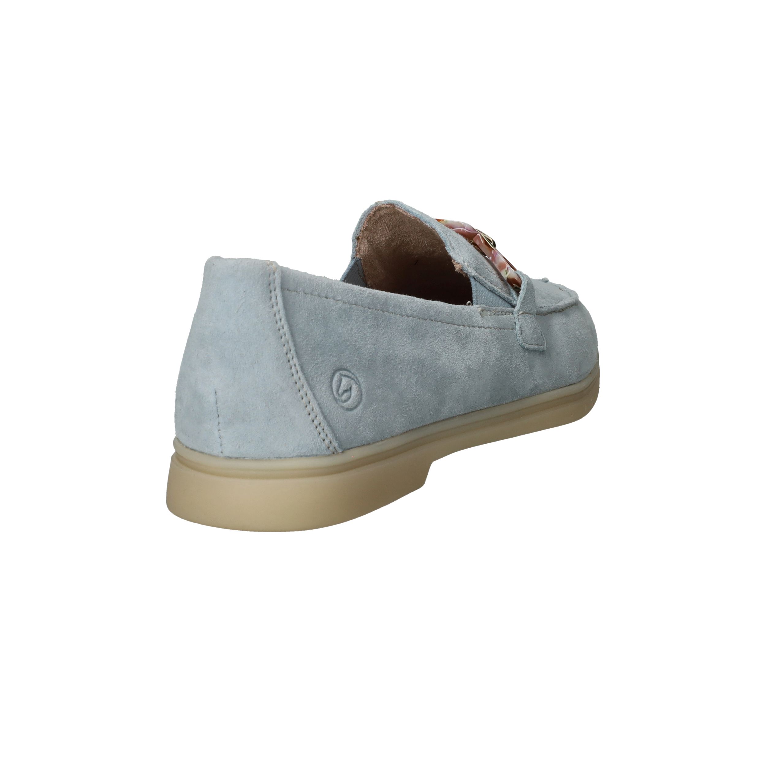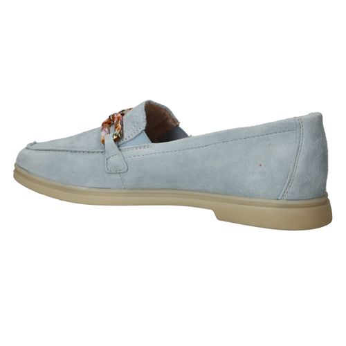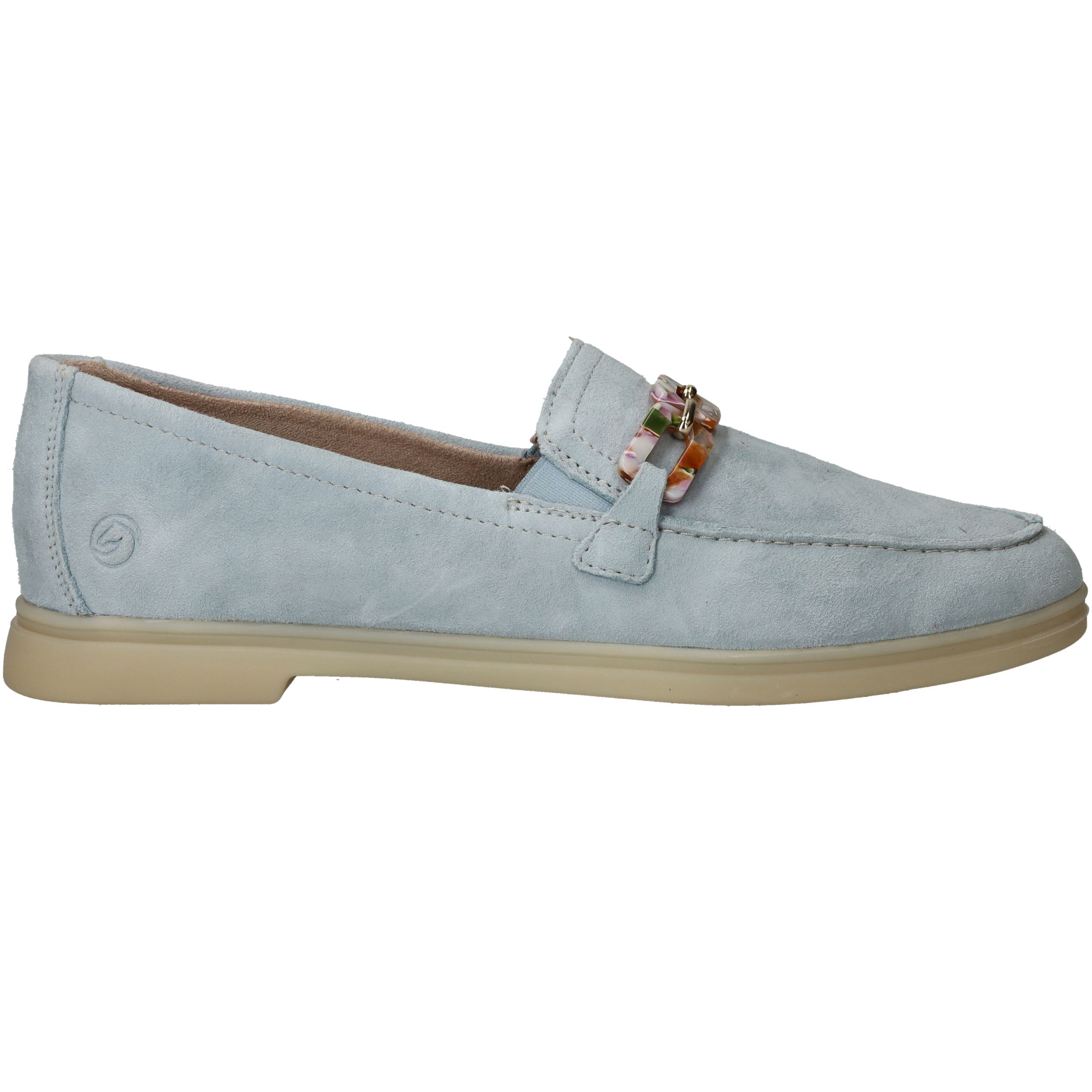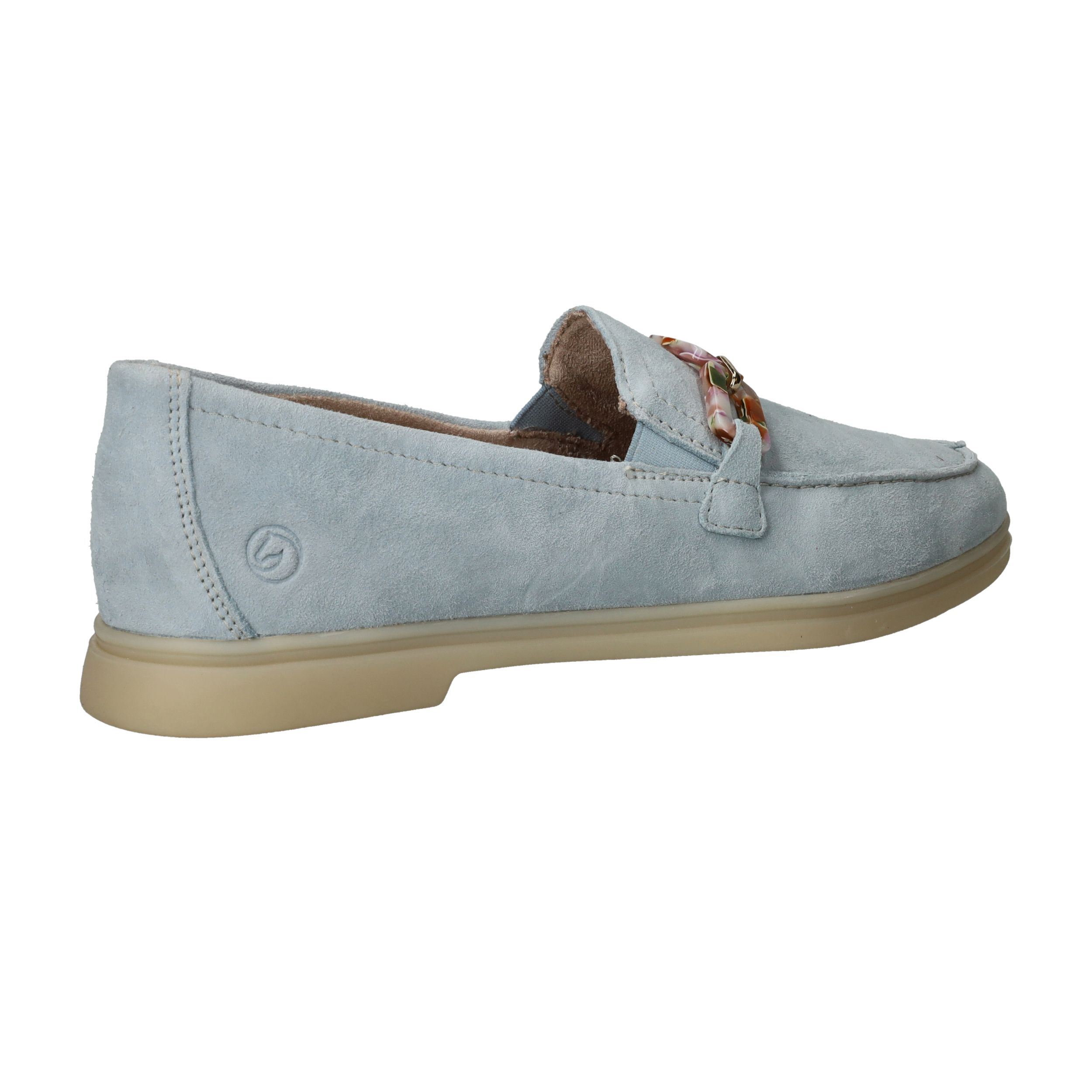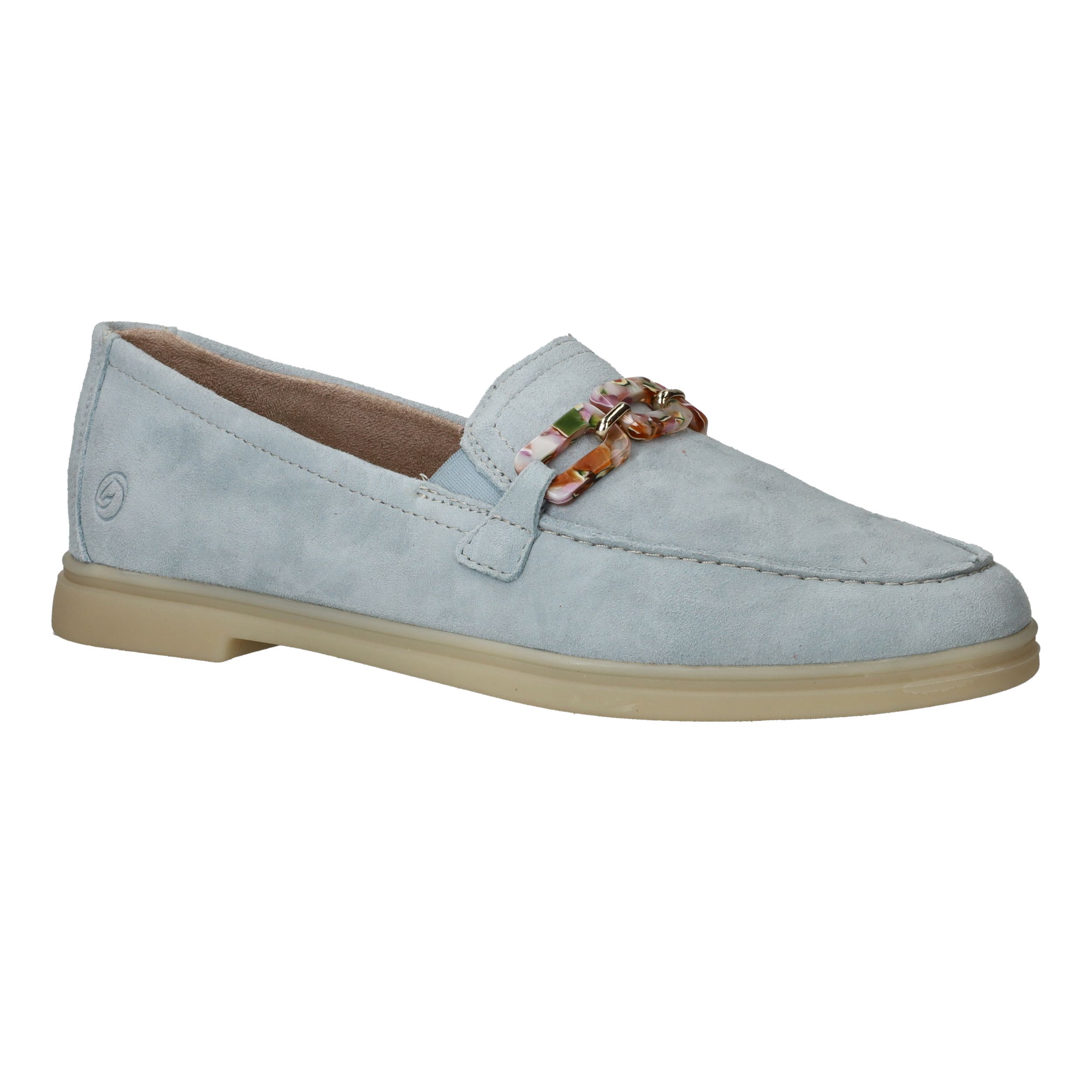 De prachtige lichtblauwe kleur van deze Remonte loafer staat goed bij een jeans! De instapper is afgewerkt met fleurige schakels.