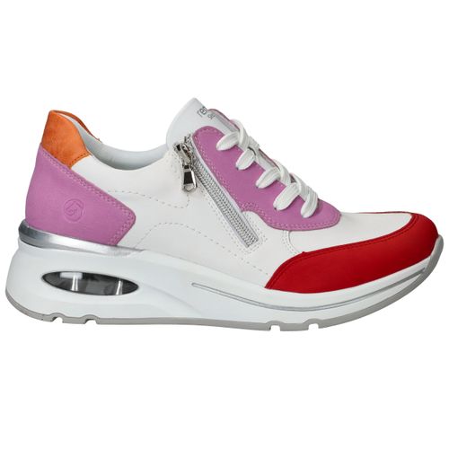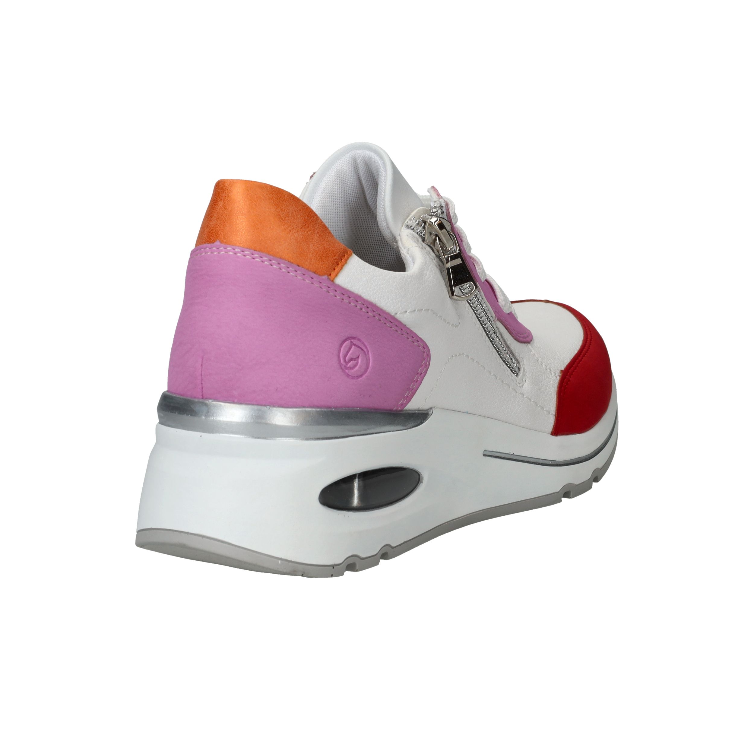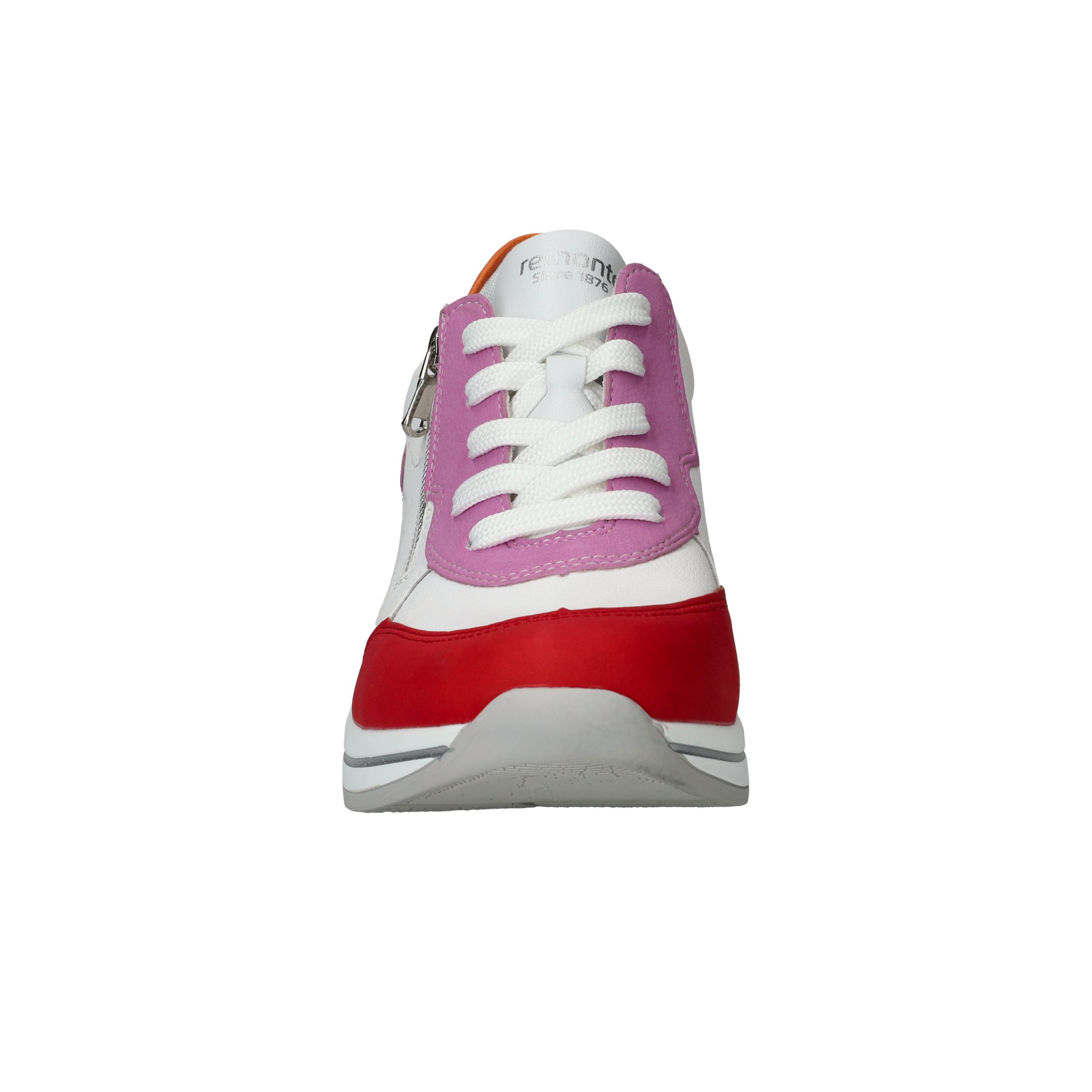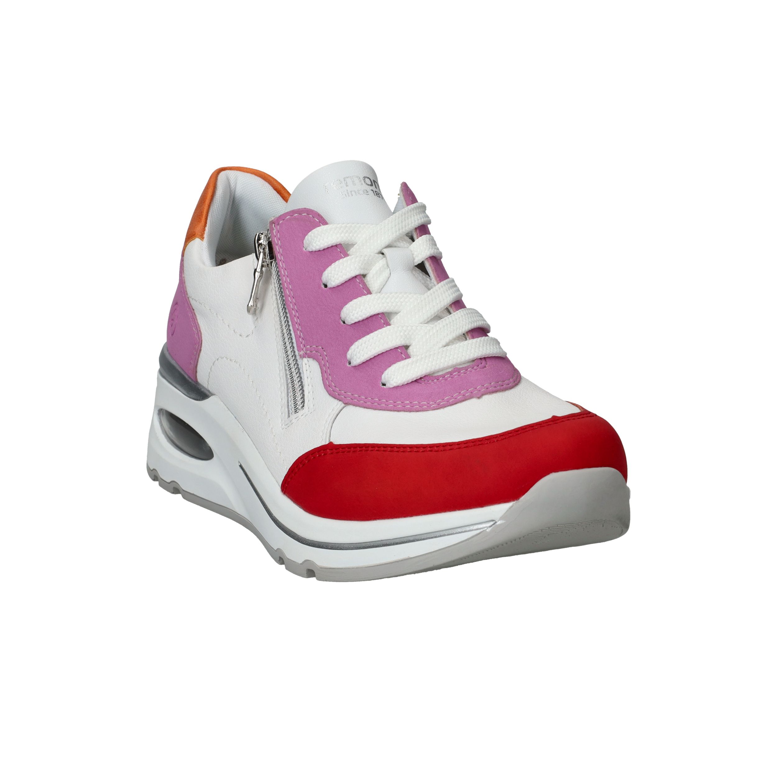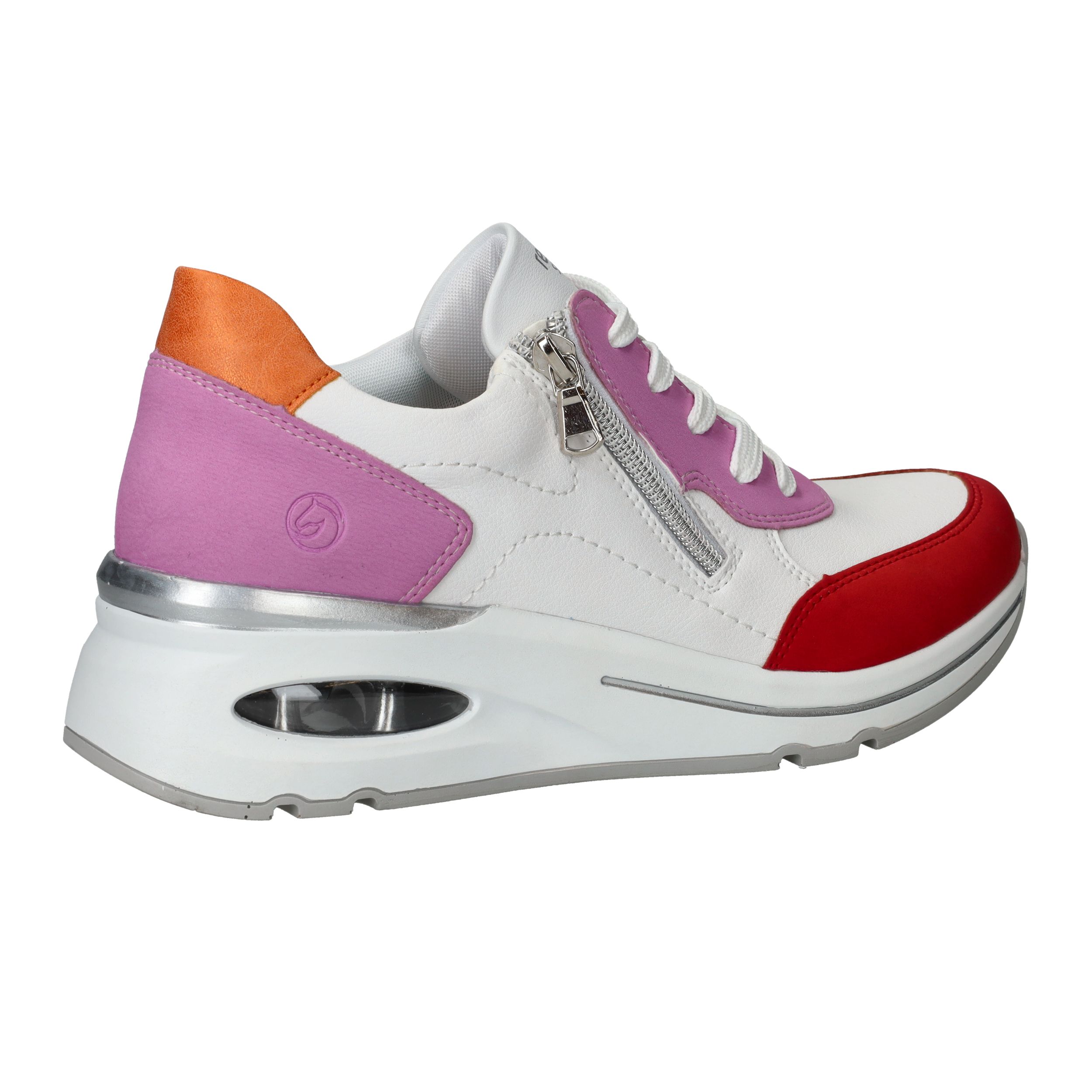 Deze sportieve witte Remonte sneaker heeft vrolijke kleurvlakken in roze, rood en oranje.