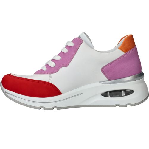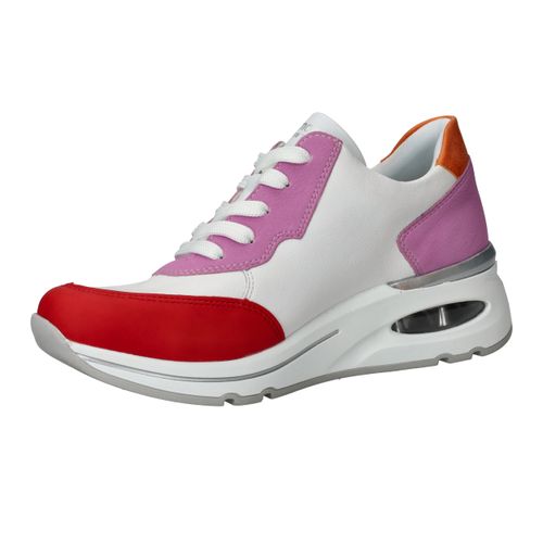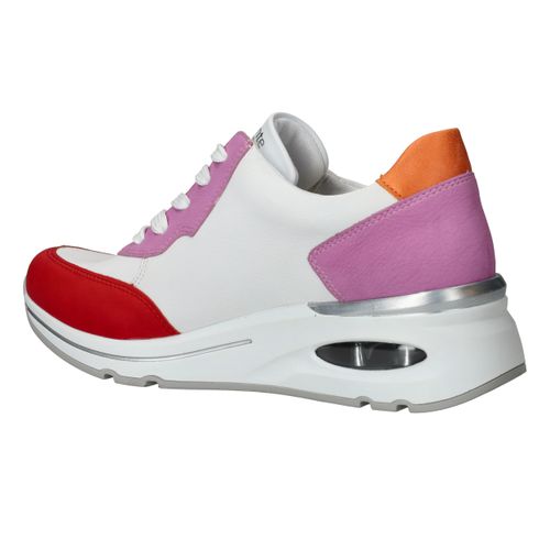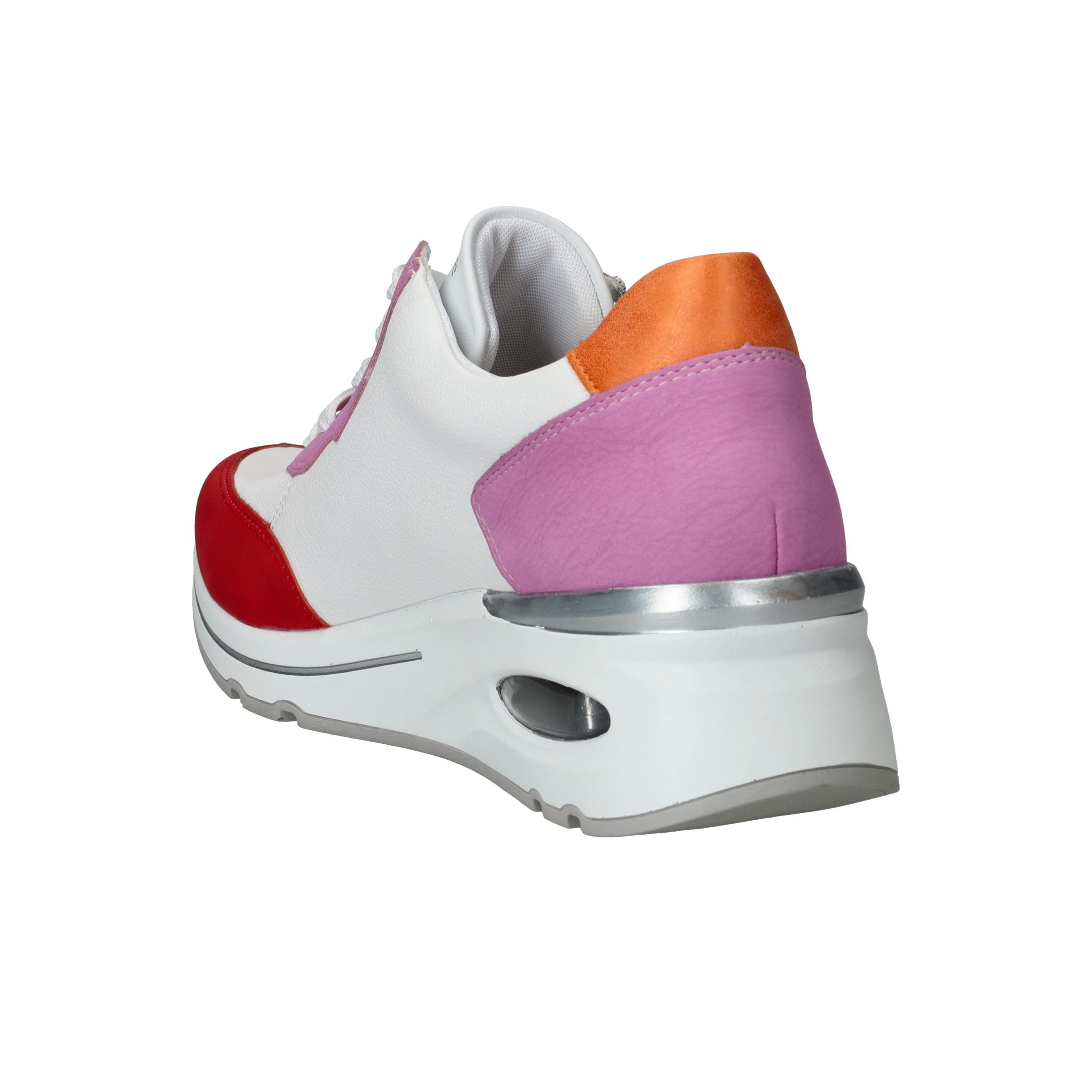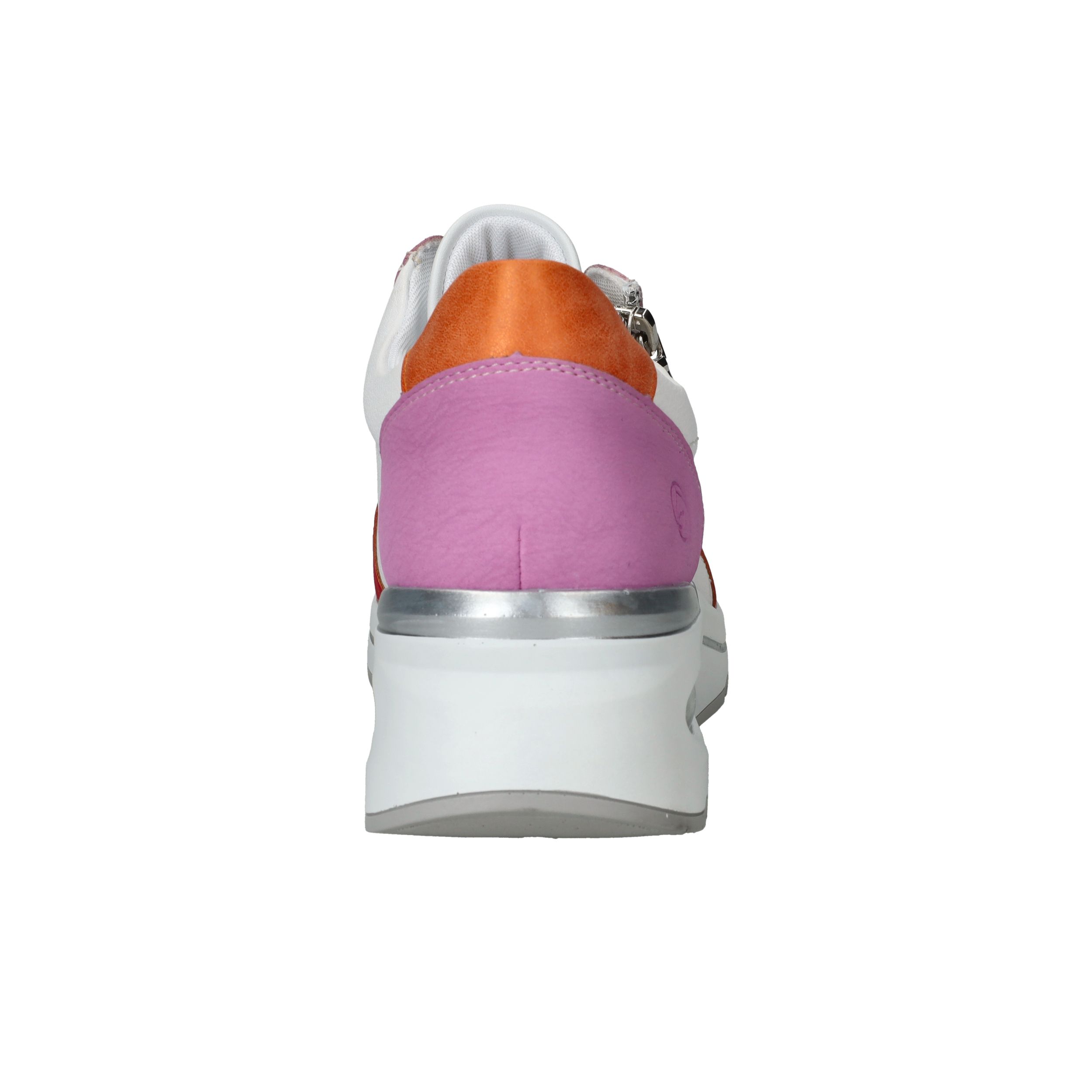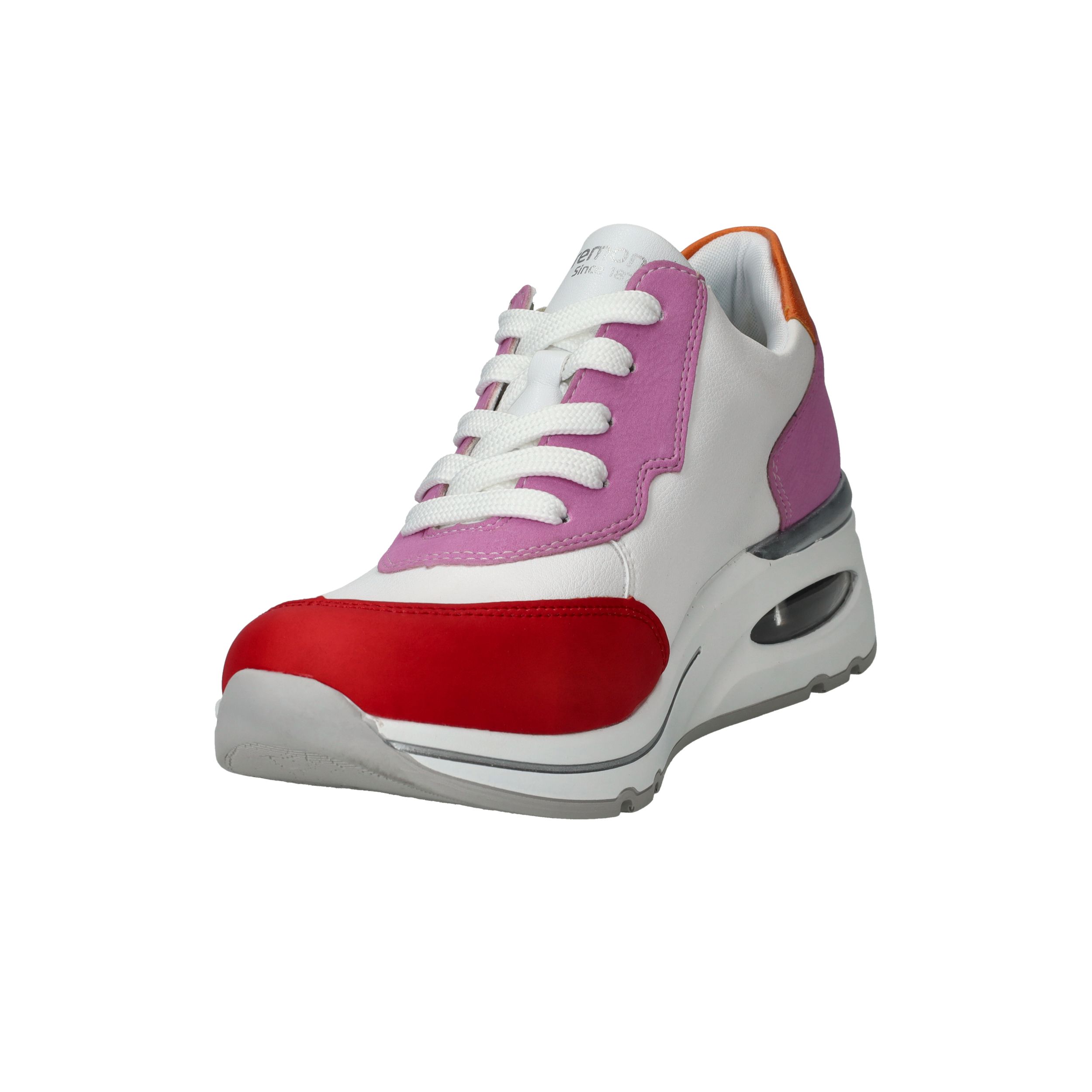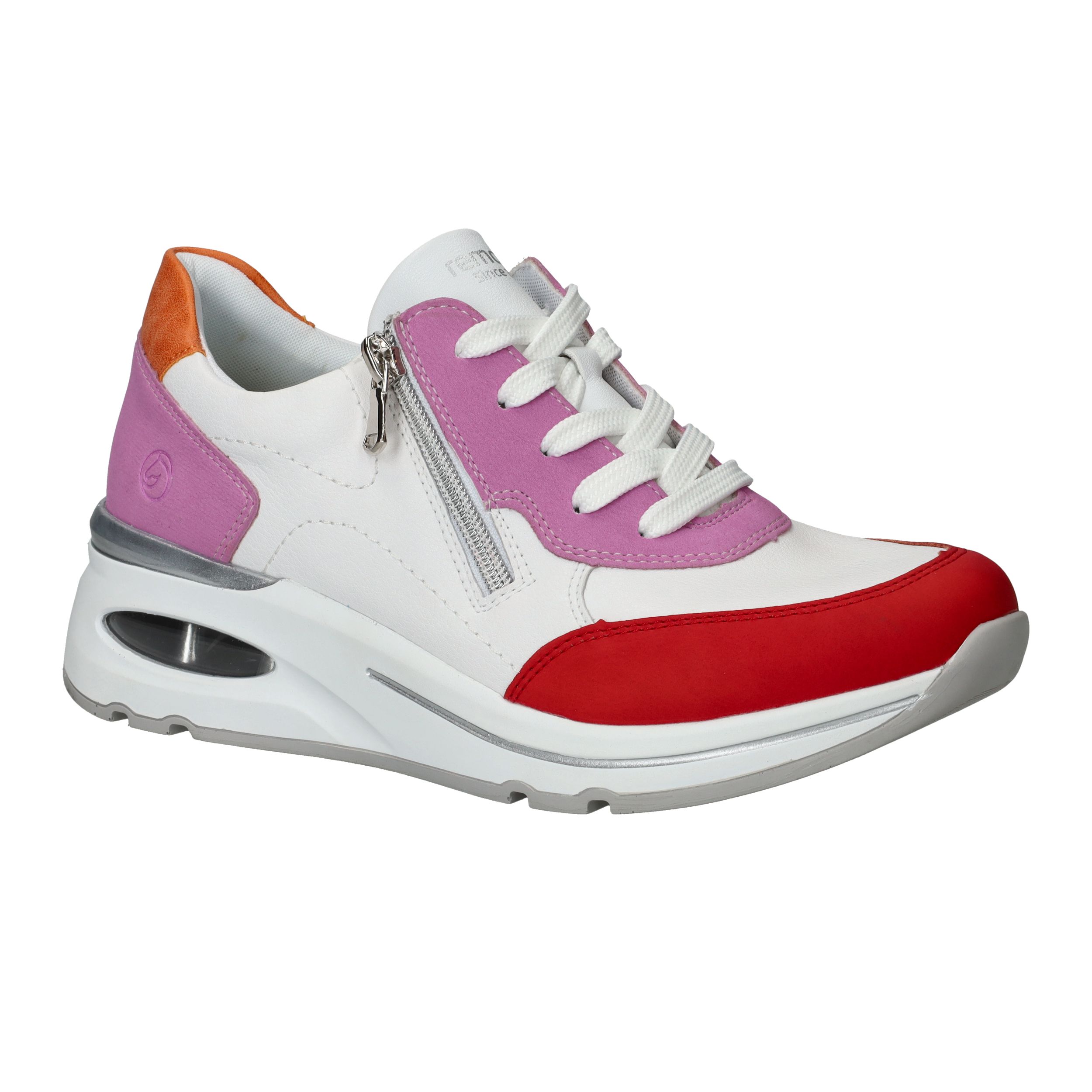 Deze sportieve witte Remonte sneaker heeft vrolijke kleurvlakken in roze, rood en oranje.