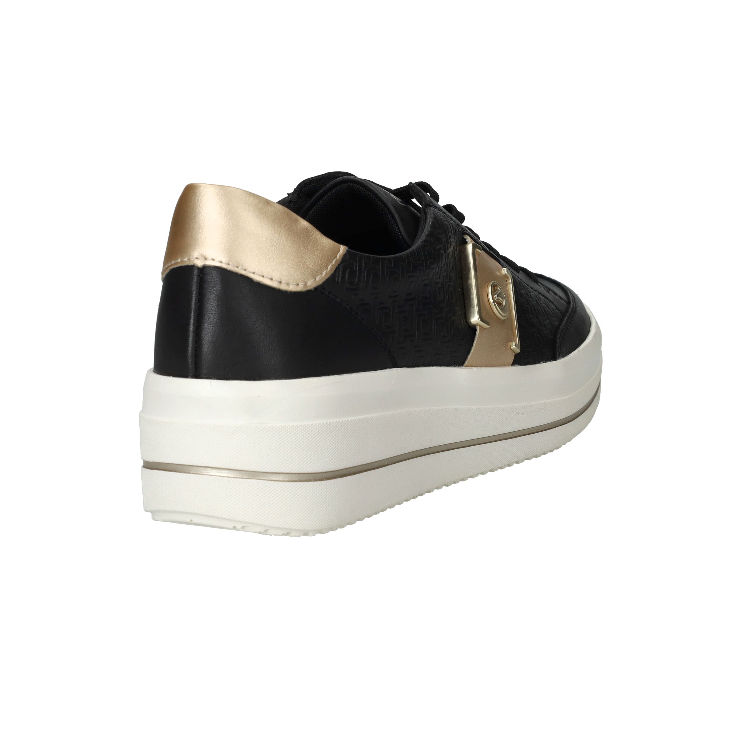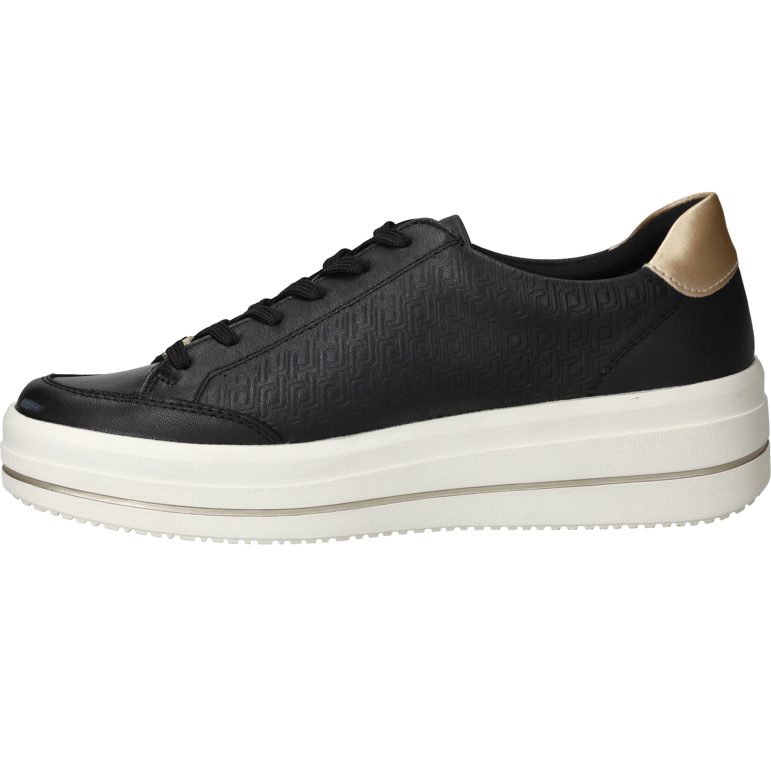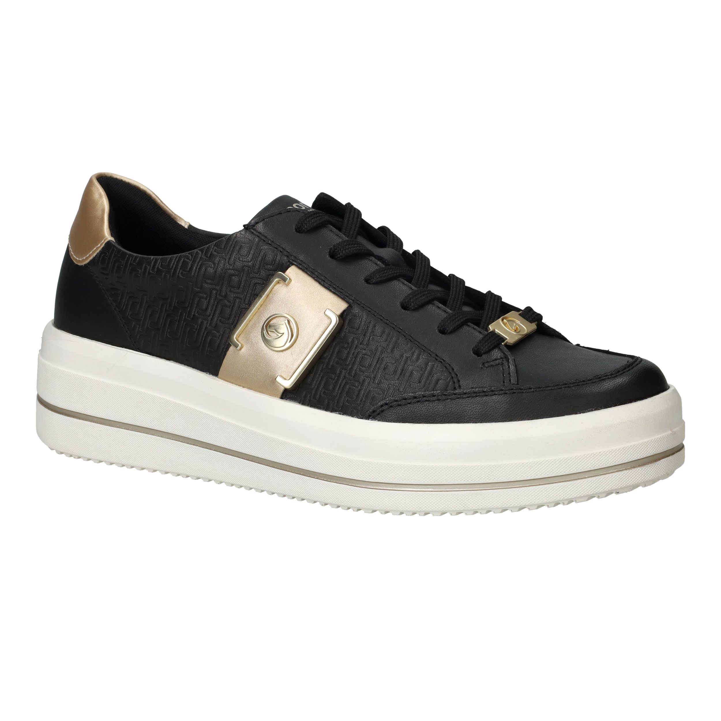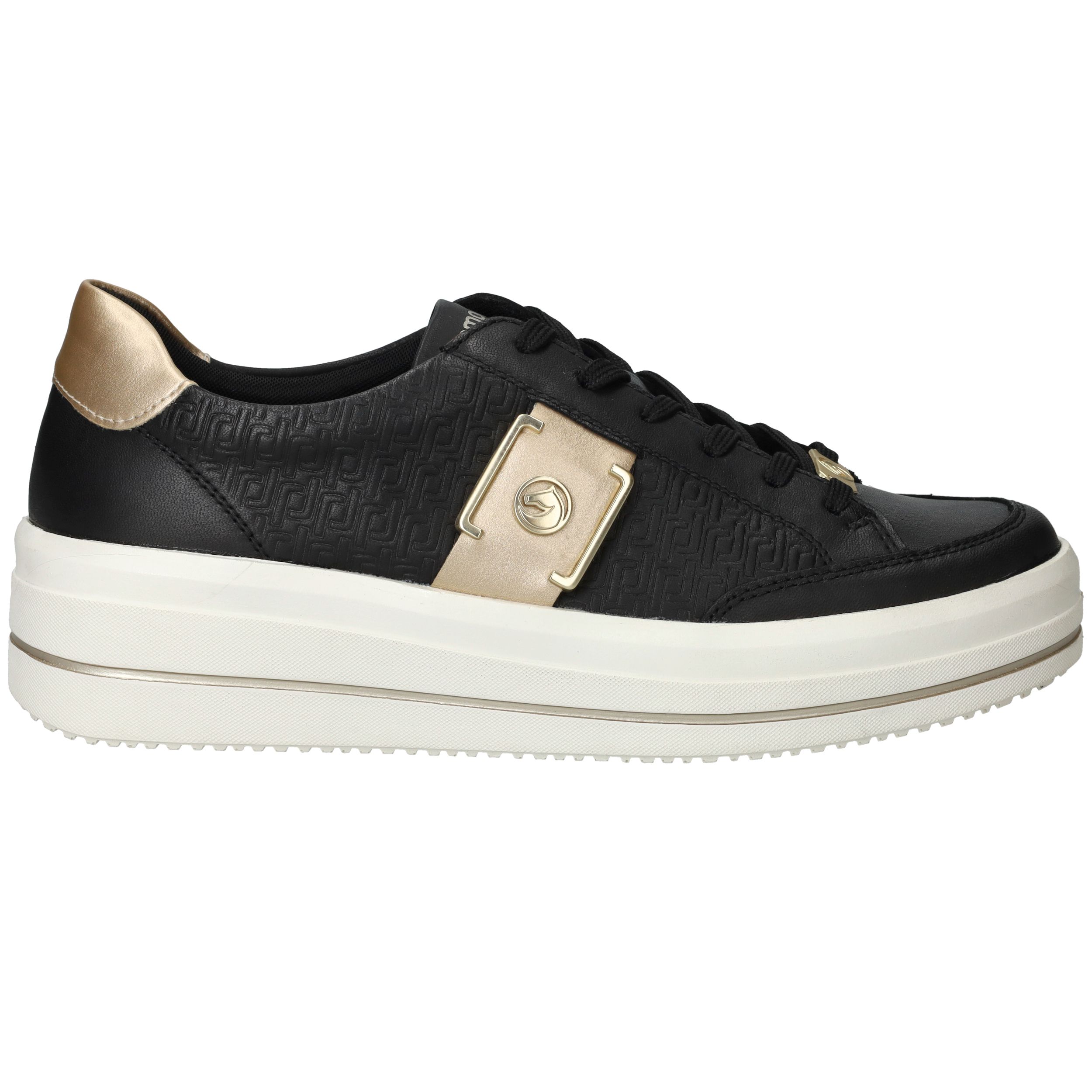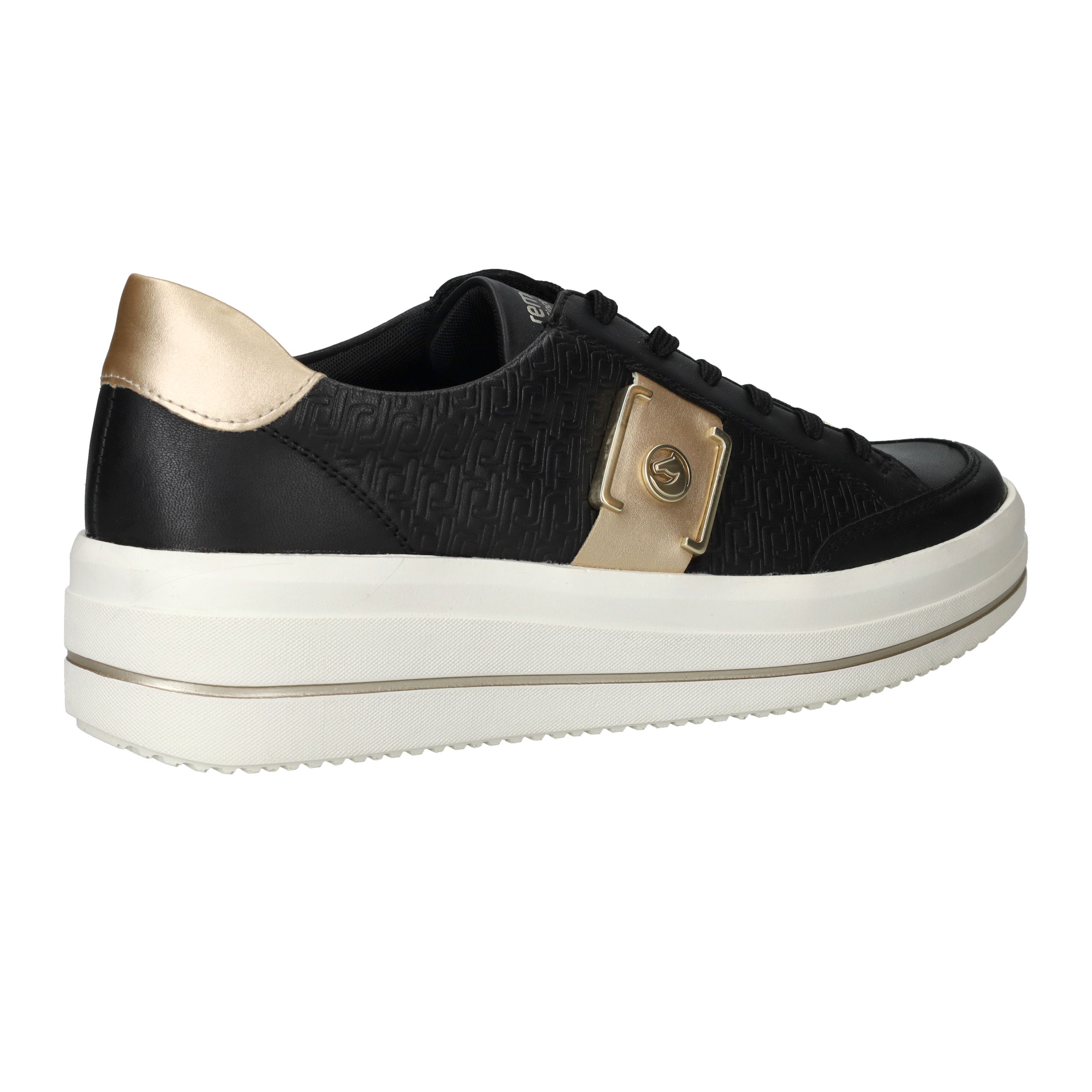 Gave zwarte Remonte sneaker met gouden siergesp aan de zijkant en toffe platformzool.