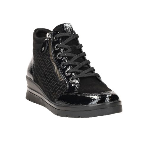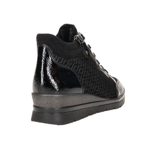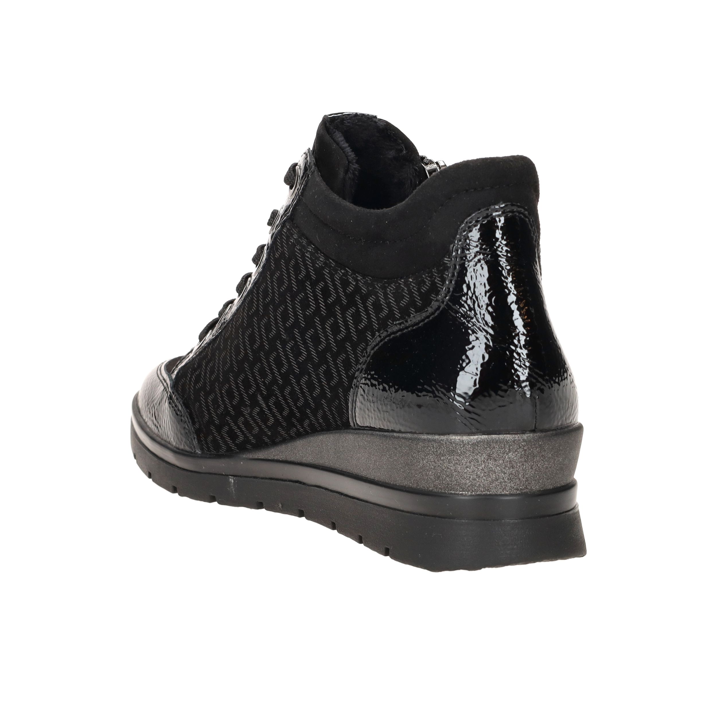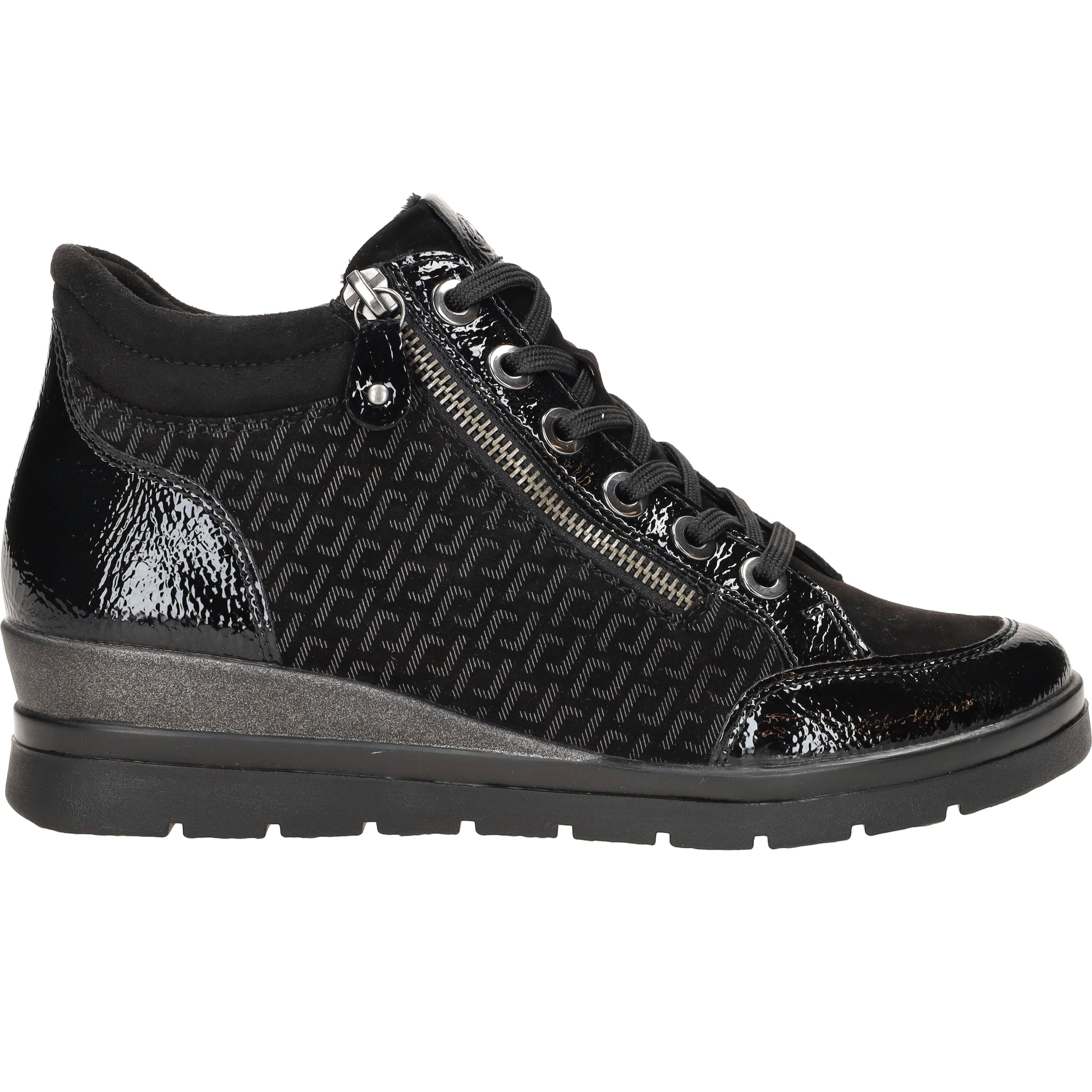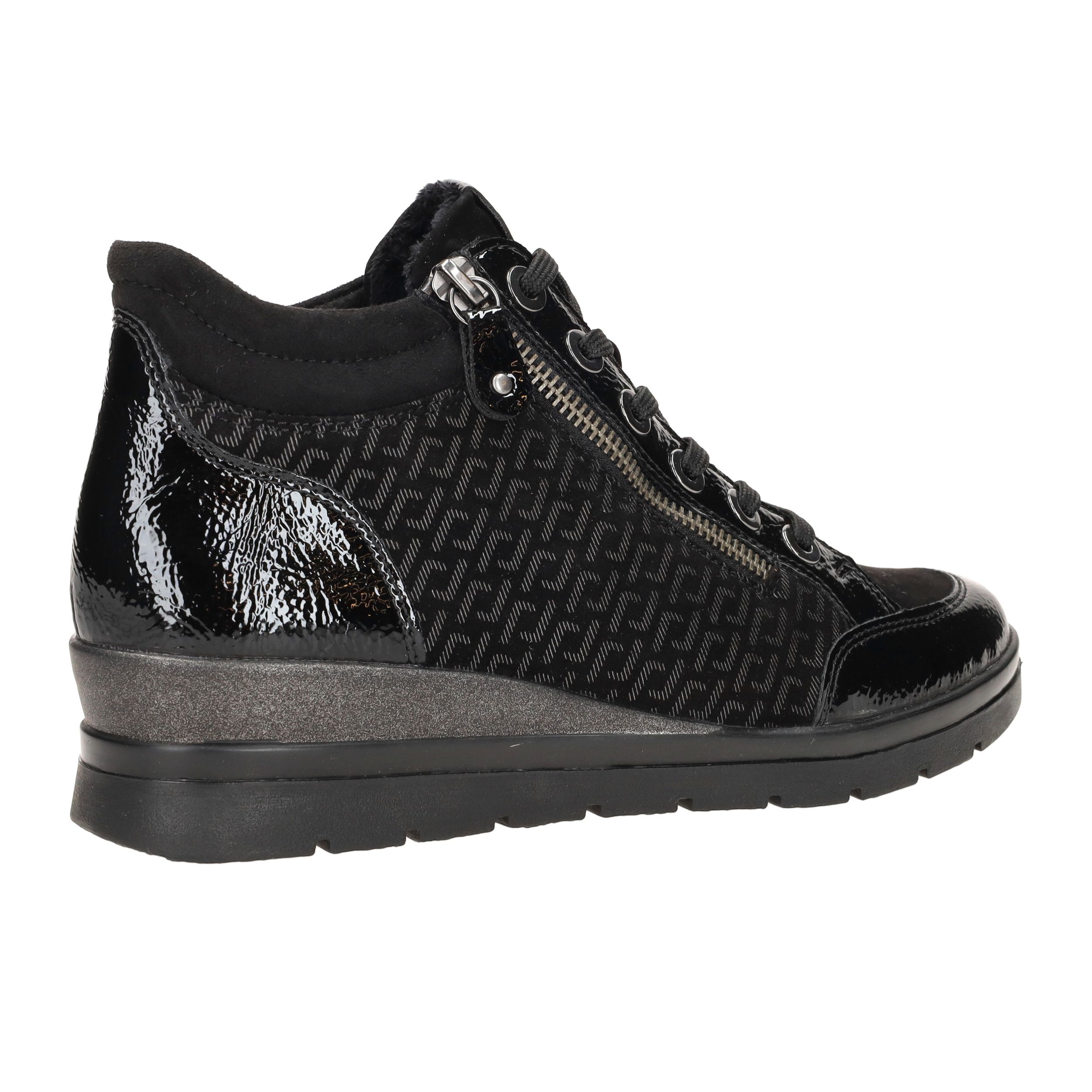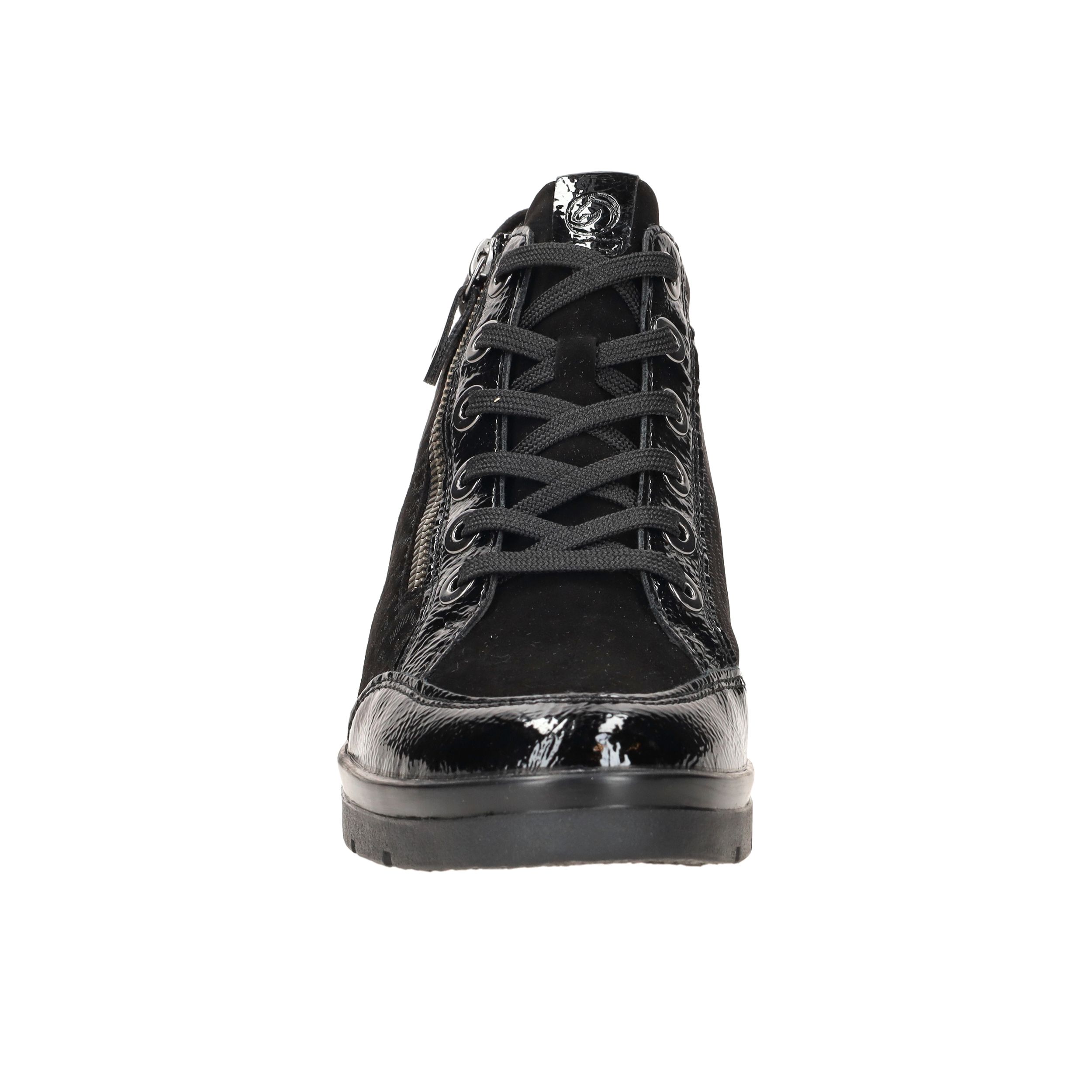 Deze zwarte veterboot van Remonte combineert een trendy design met optimaal comfort. Het bovenwerk bestaat uit een stijlvolle mix van leer en kunstleer met glanzende accenten. Dankzij het uitneembare voetbed en de ritssluiting aan de zijkant is de boot niet alleen praktisch maar ook ideaal voor dagelijks gebruik.