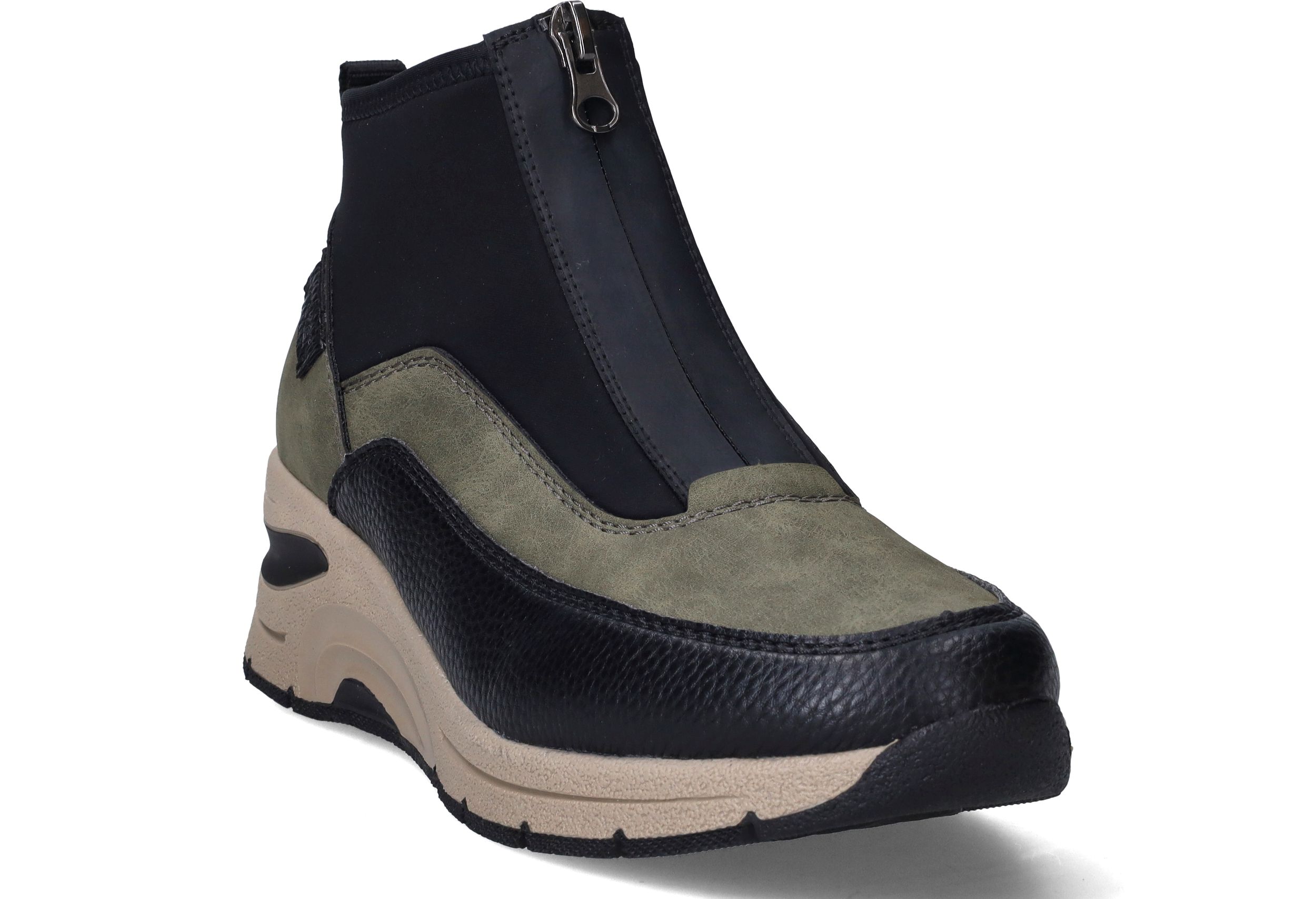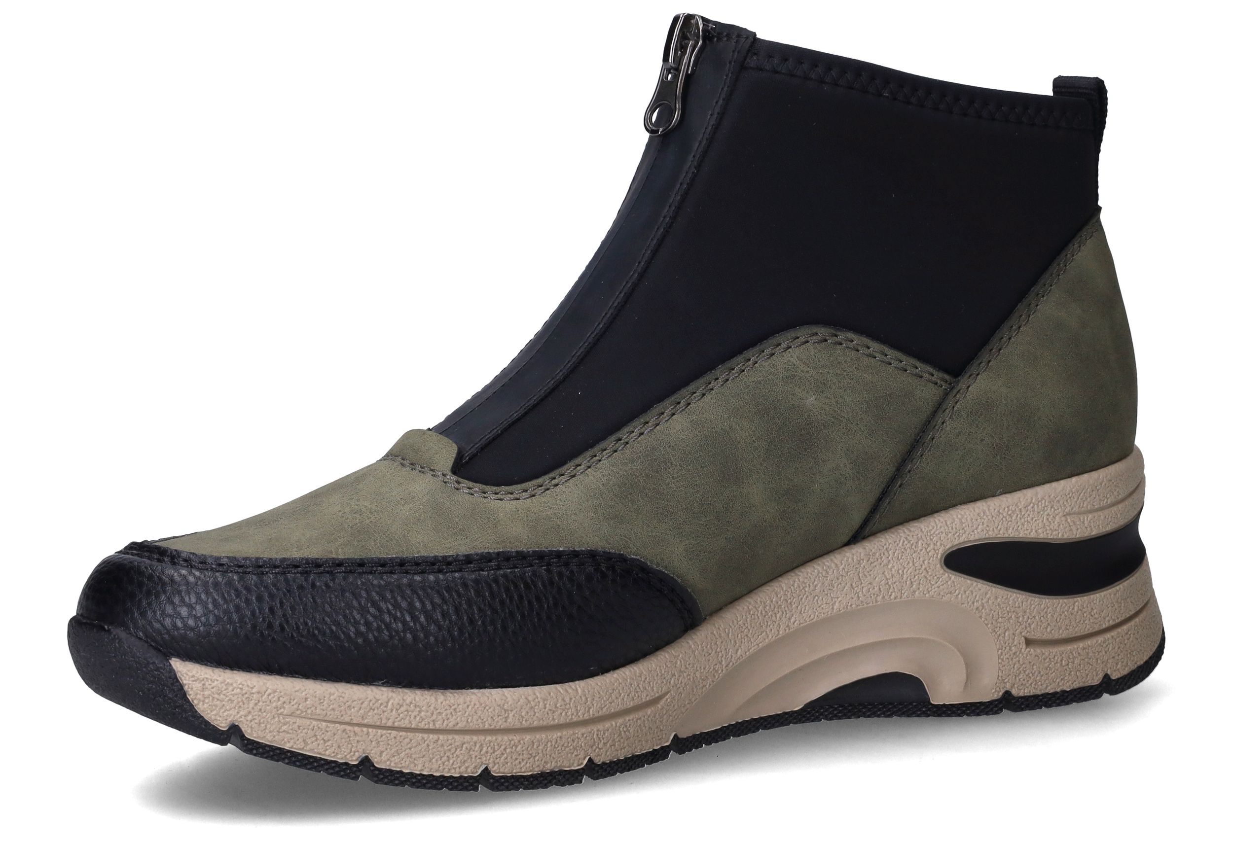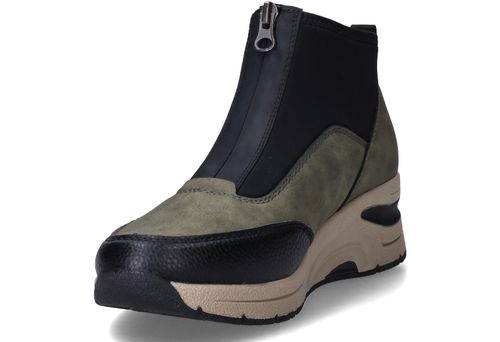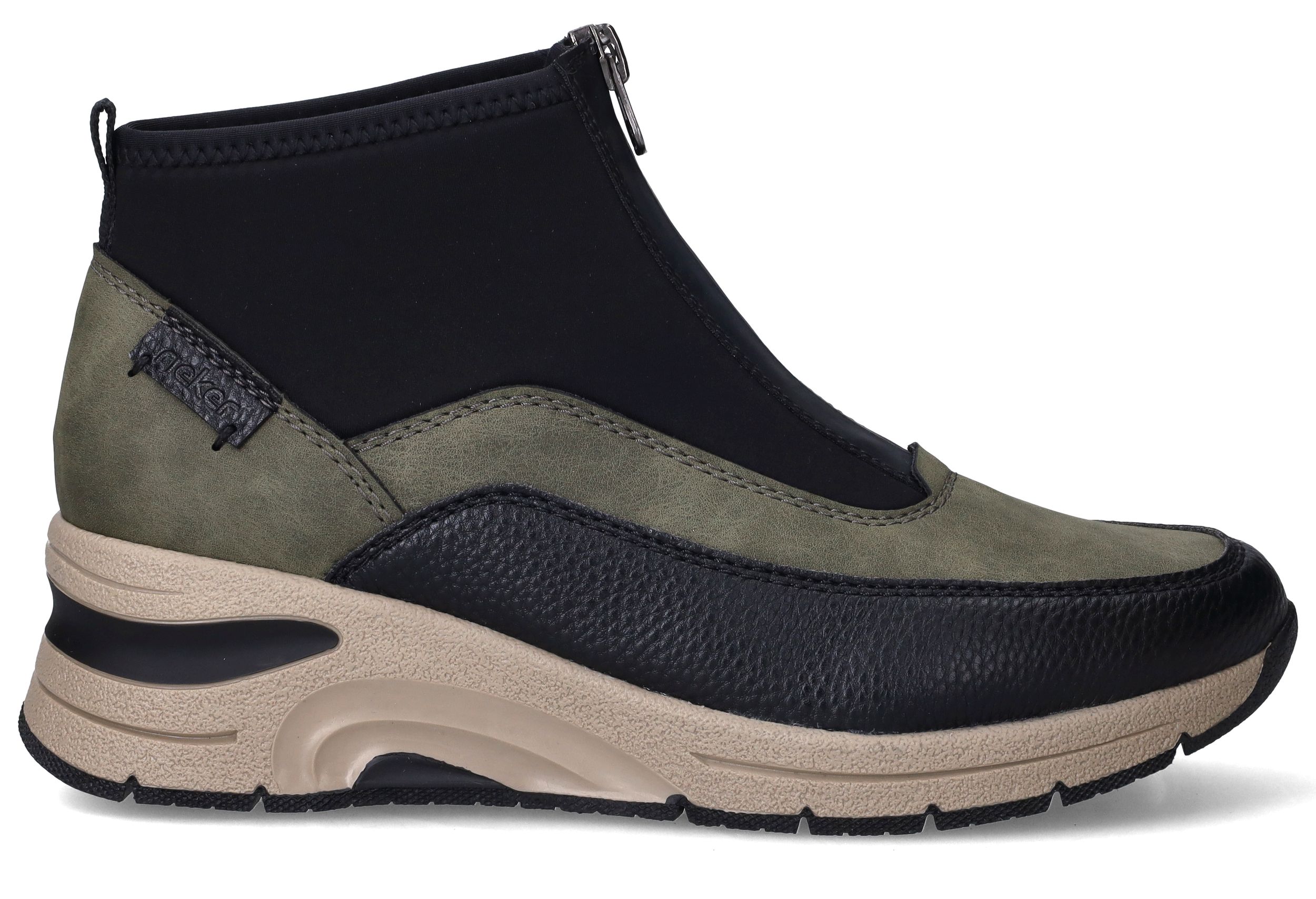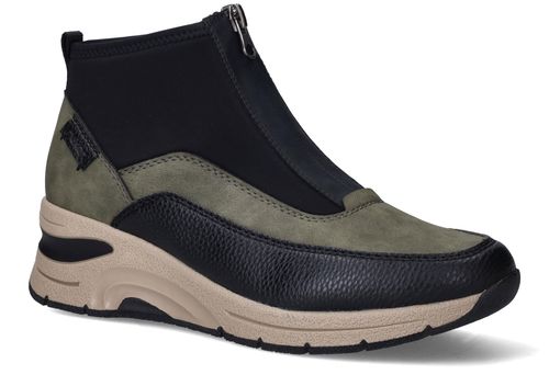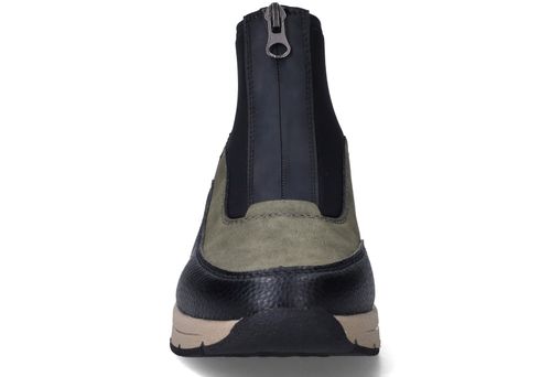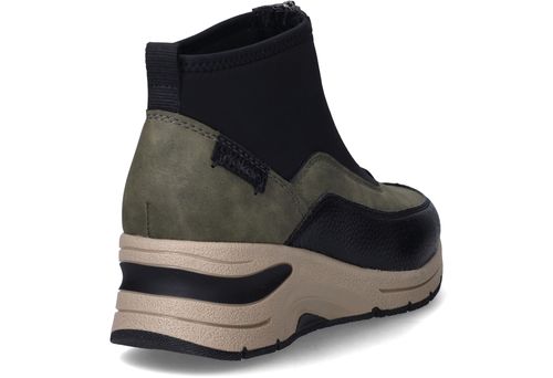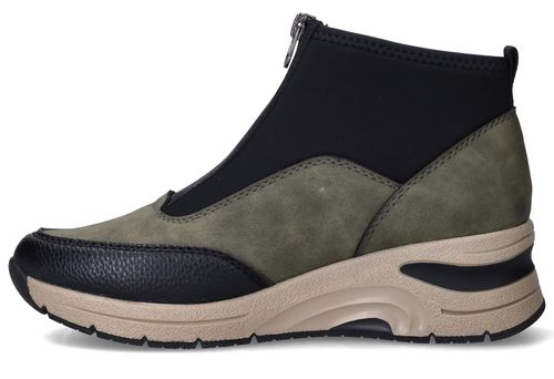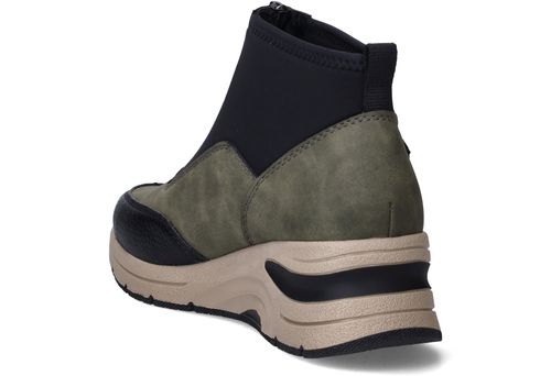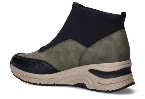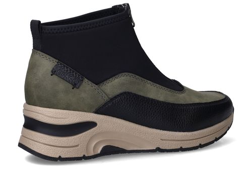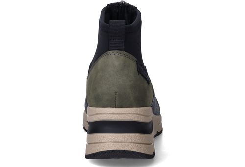Deze olijfgroene boots van Rieker combineren sportieve looks met praktisch comfort. De mix van kunstleer en stretchtextiel zorgt voor een soepele pasvorm en een modern silhouet. Ideaal voor dames die een comfortabele maar eigentijdse schoen zoeken voor dagelijks gebruik.