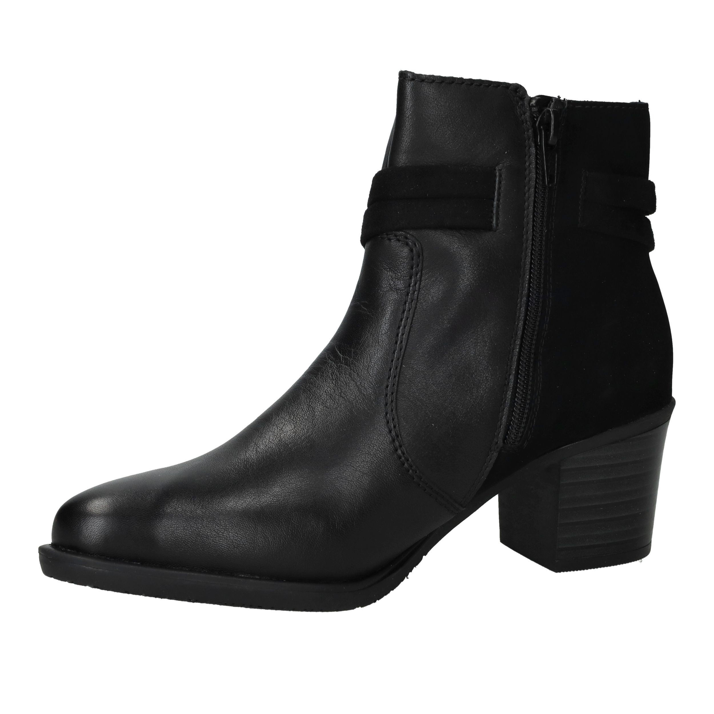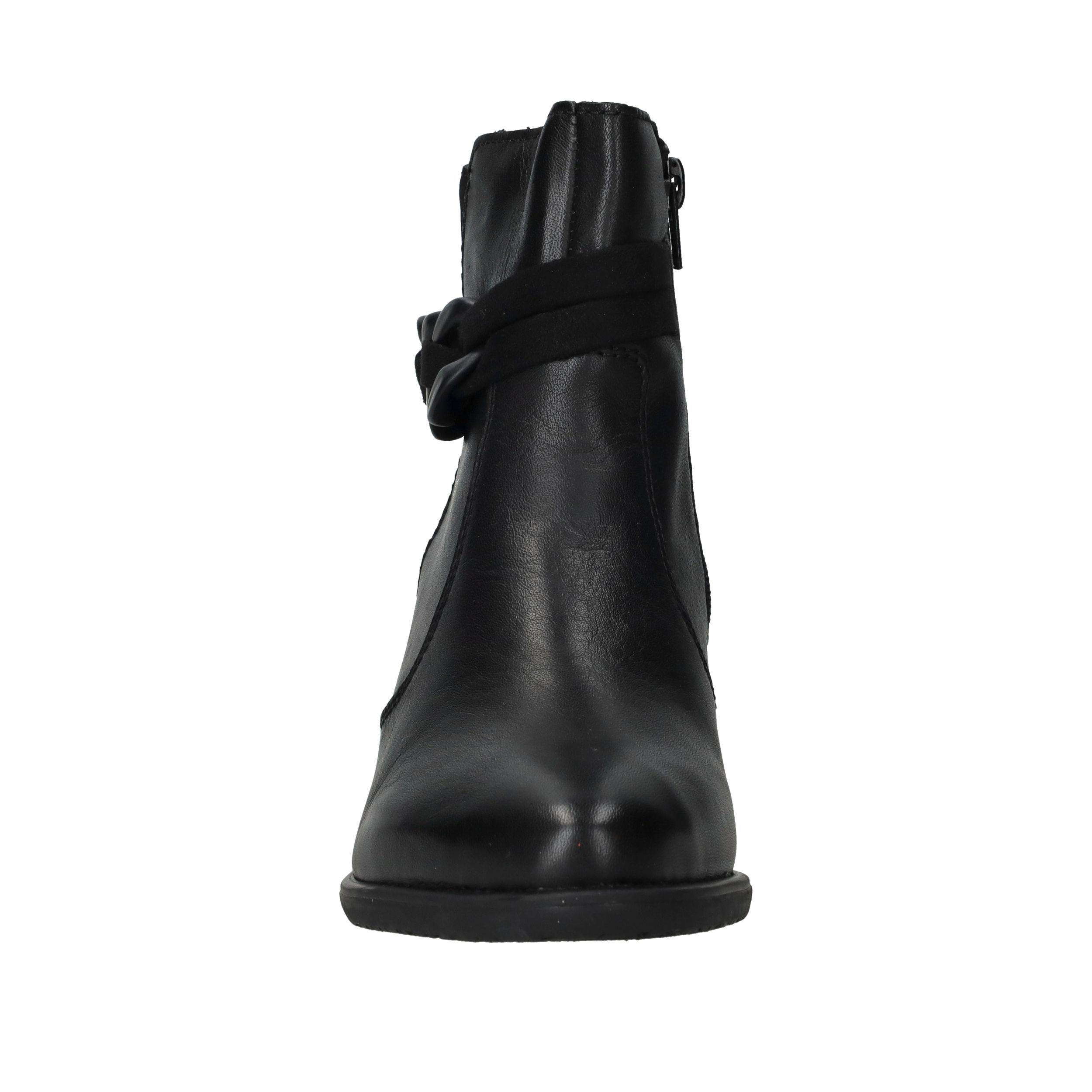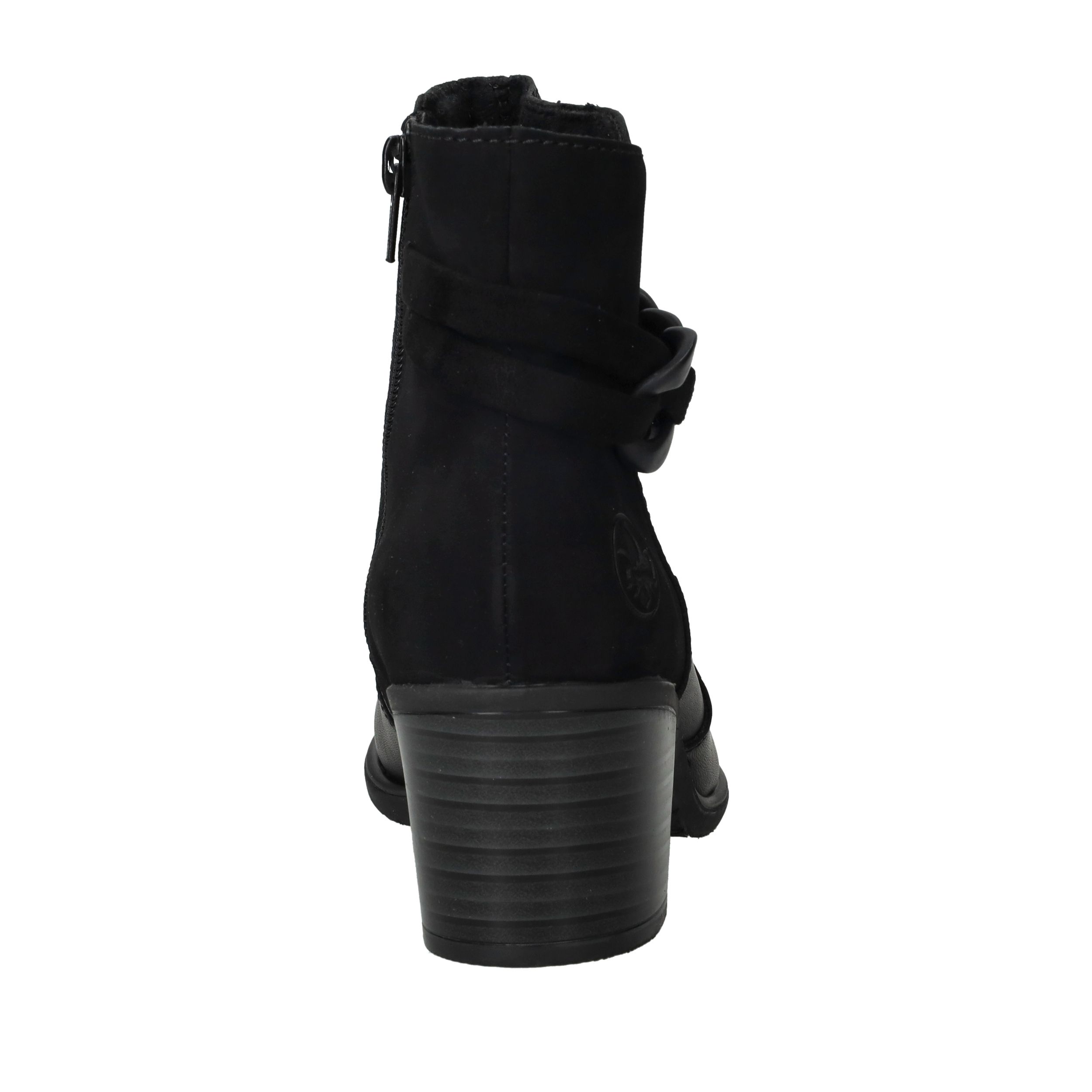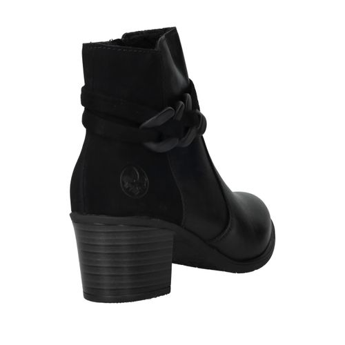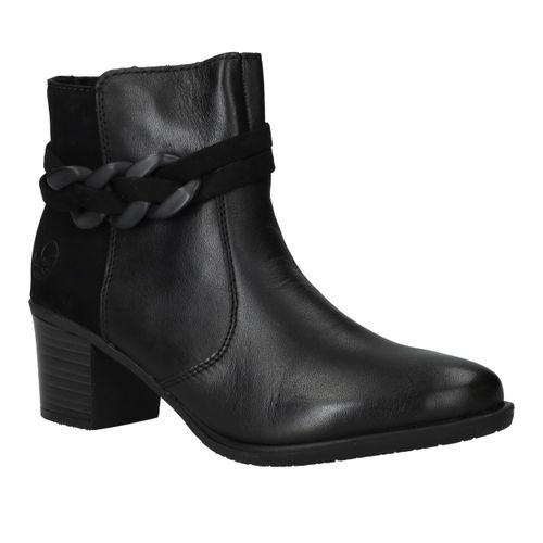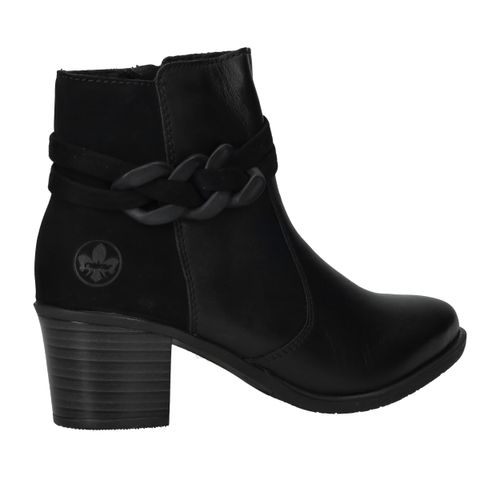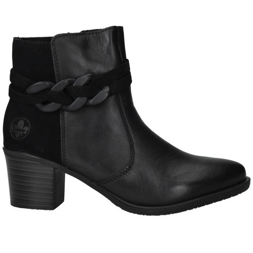 Deze zwarte Rieker enkellaarsjes zijn een stijlvolle keuze voor dames die comfort willen combineren met een modieuze uitstraling. Het gladde oppervlak van kunstleer in combinatie met de decoratieve schakel geeft deze enkellaarsjes een eigentijdse look die je makkelijk kunt dragen naar werk of een avondje uit. De ritssluiting zorgt voor gemak bij het aantrekken en de hak van 5 cm geeft net dat beetje extra elegantie. Dankzij de pasvorm met voetbreedte G blijven je voeten comfortabel, ook op drukkere dagen.