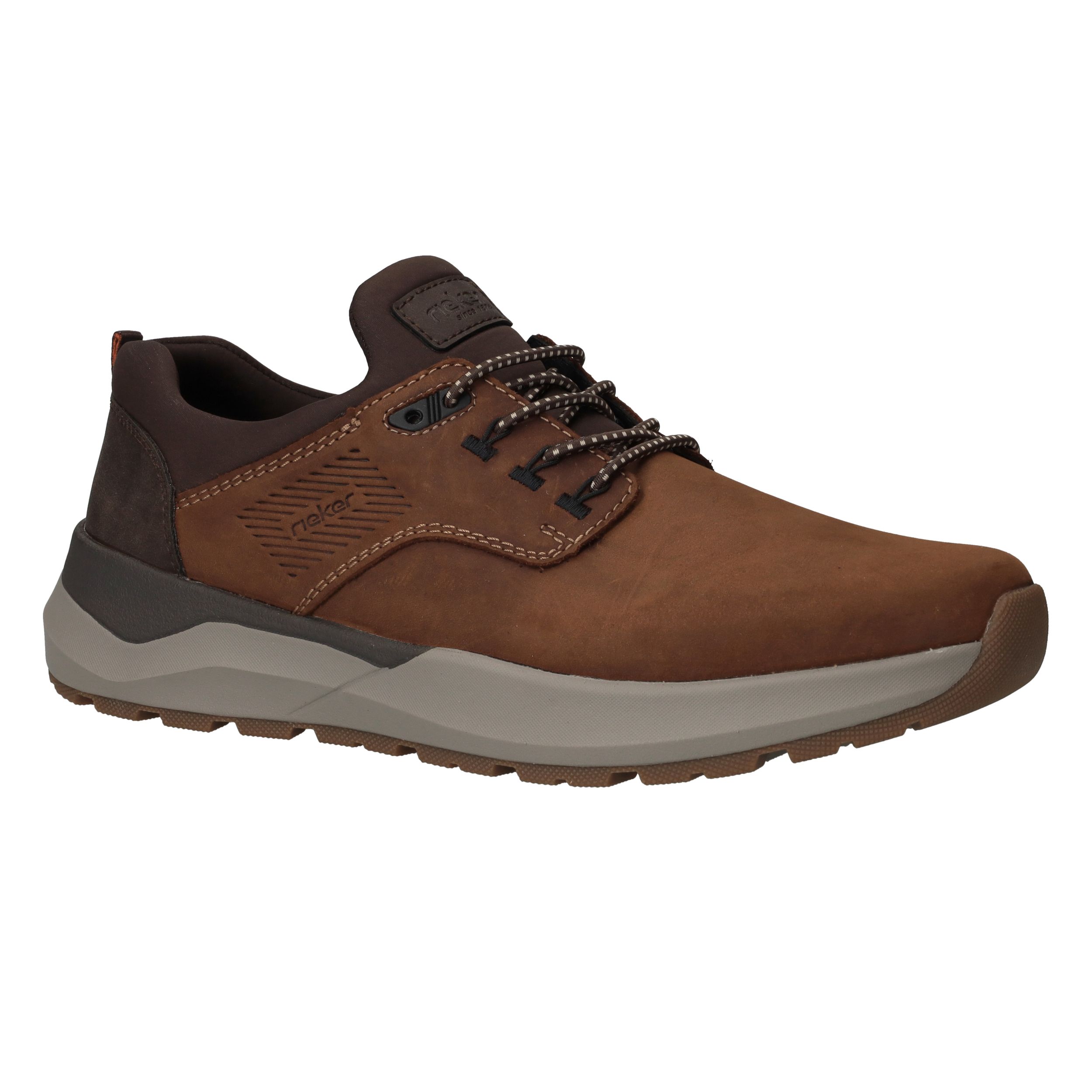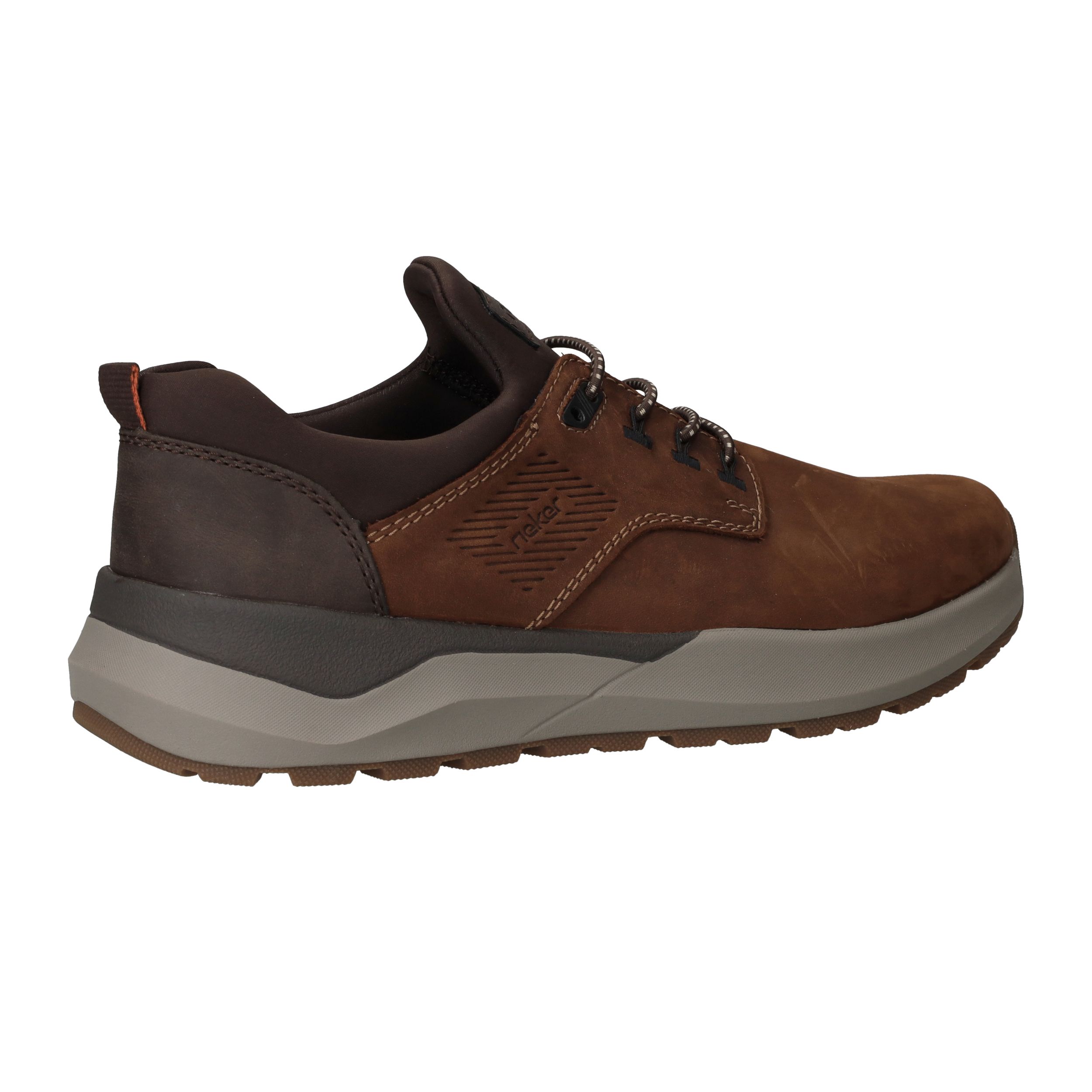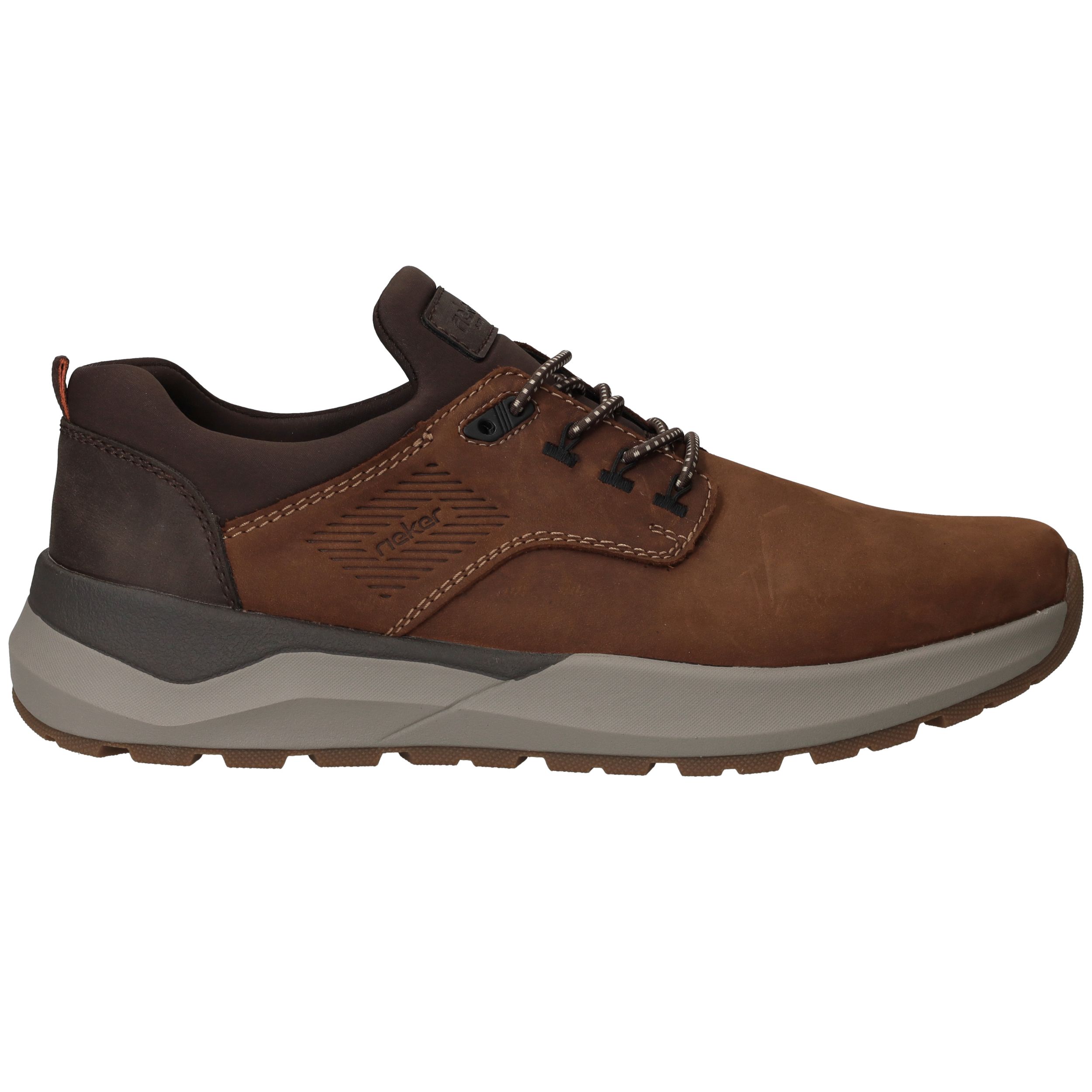 Deze bruine instapper van Rieker combineert een stoere look met dagelijks draagcomfort. Het bovenwerk van nubuck en textiel zorgt voor een stevige en ademende schoen, perfect voor actieve dagen. Dankzij de elastische veters trek je deze herenschoen makkelijk aan en de H-wijdte met uitneembare zool biedt extra ruimte en ondersteuning.