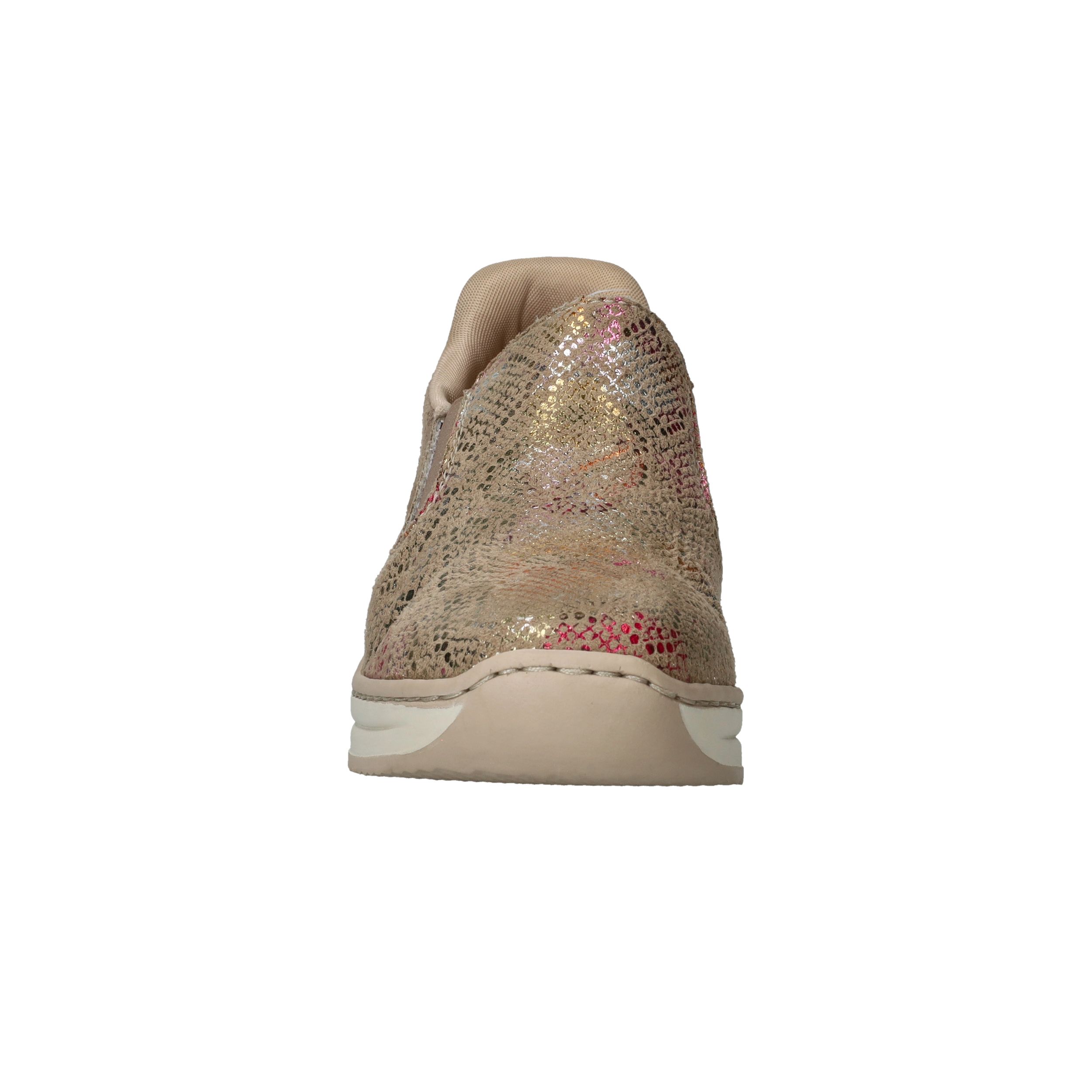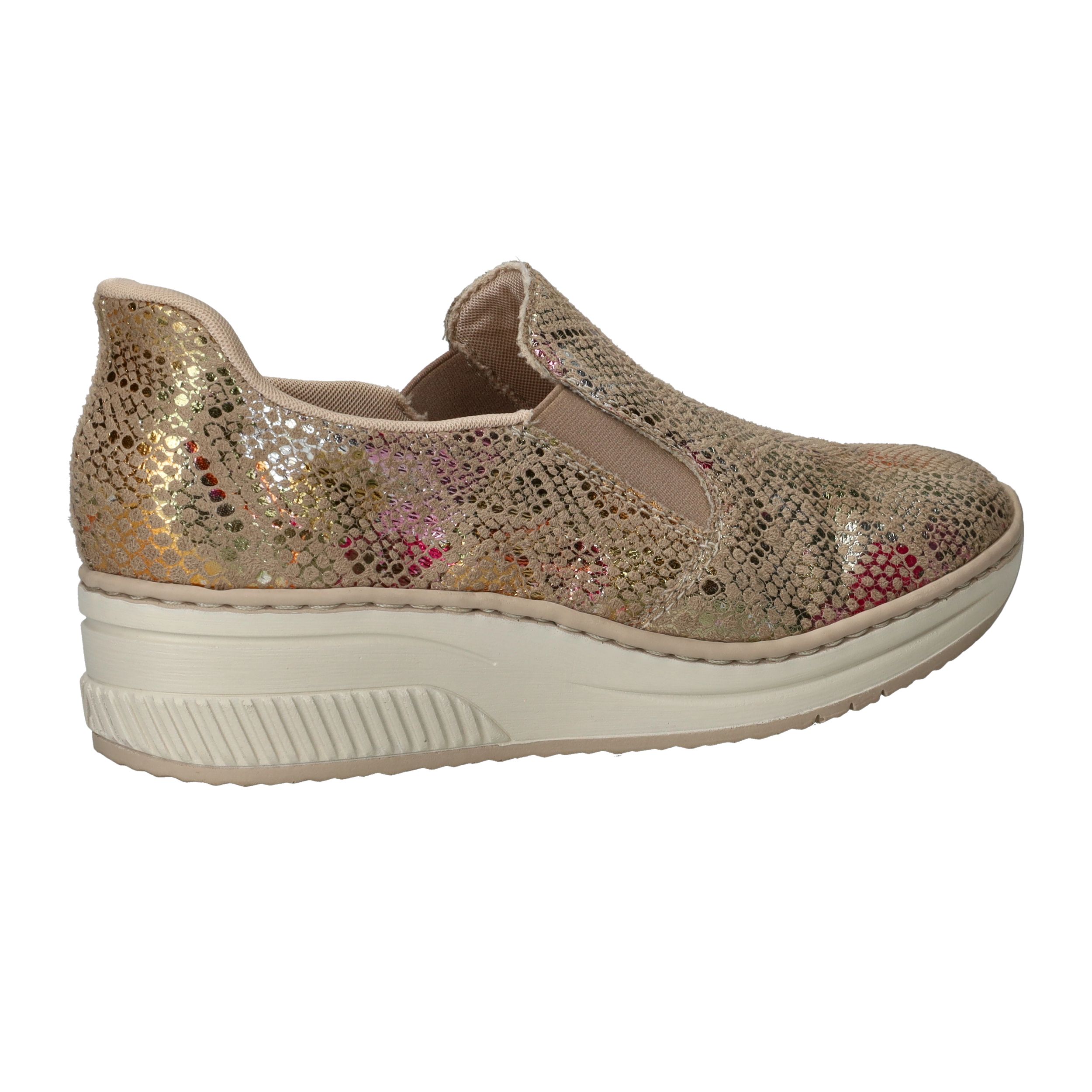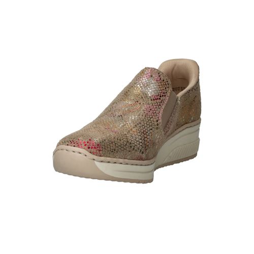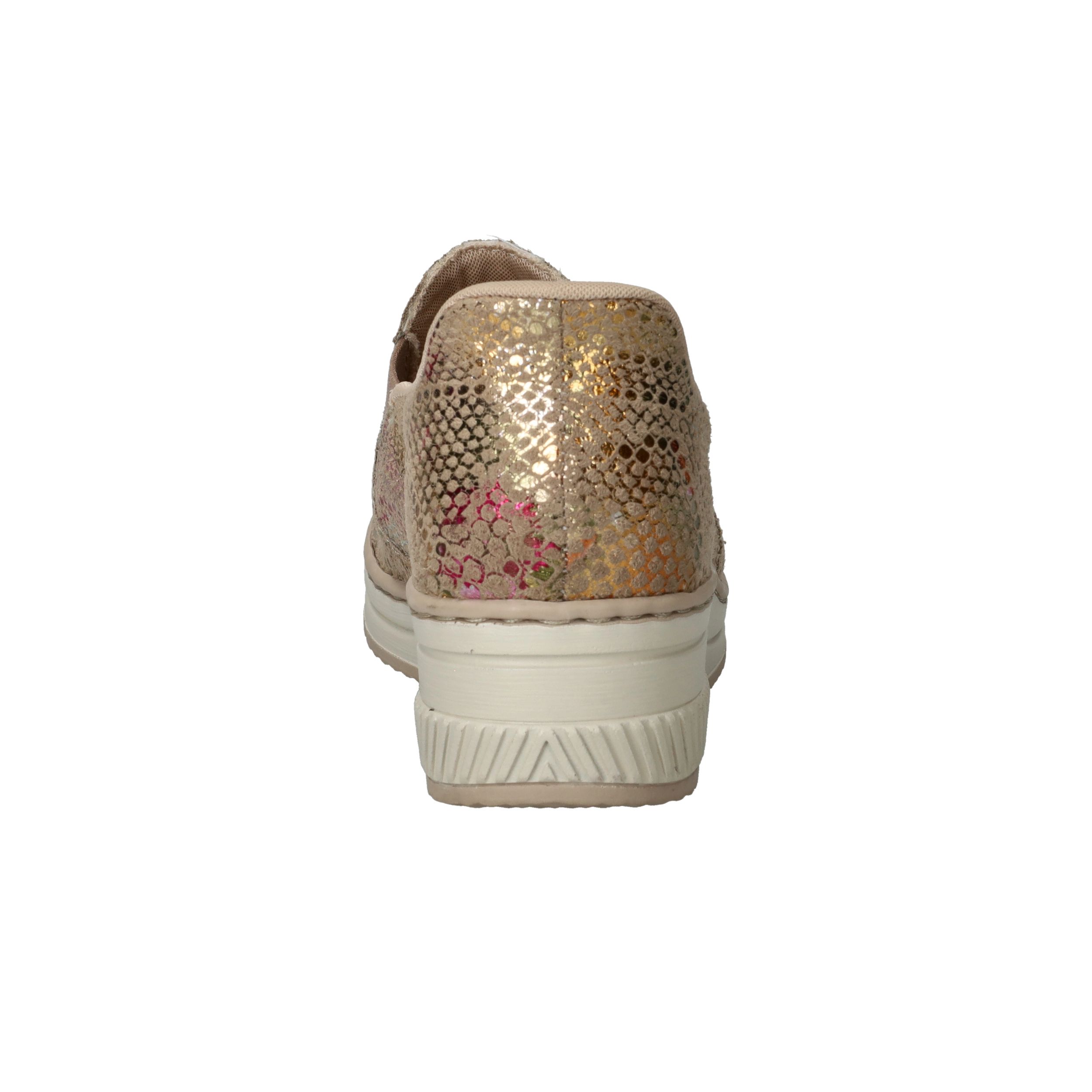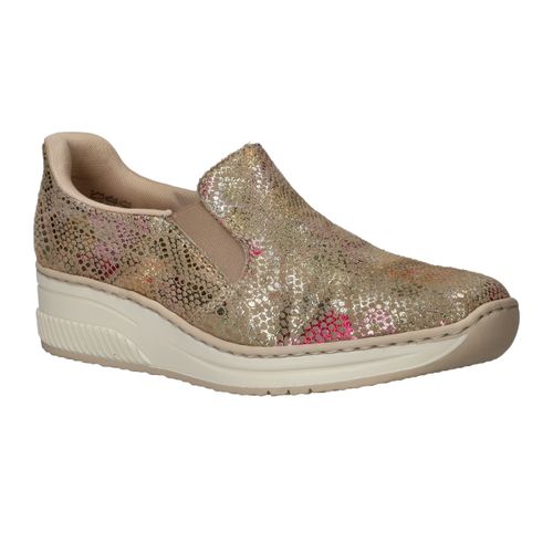 Met deze Rieker instapper maak je van elke outfit een feestje! De instapper heeft een stralende metallic print en stevige zool.