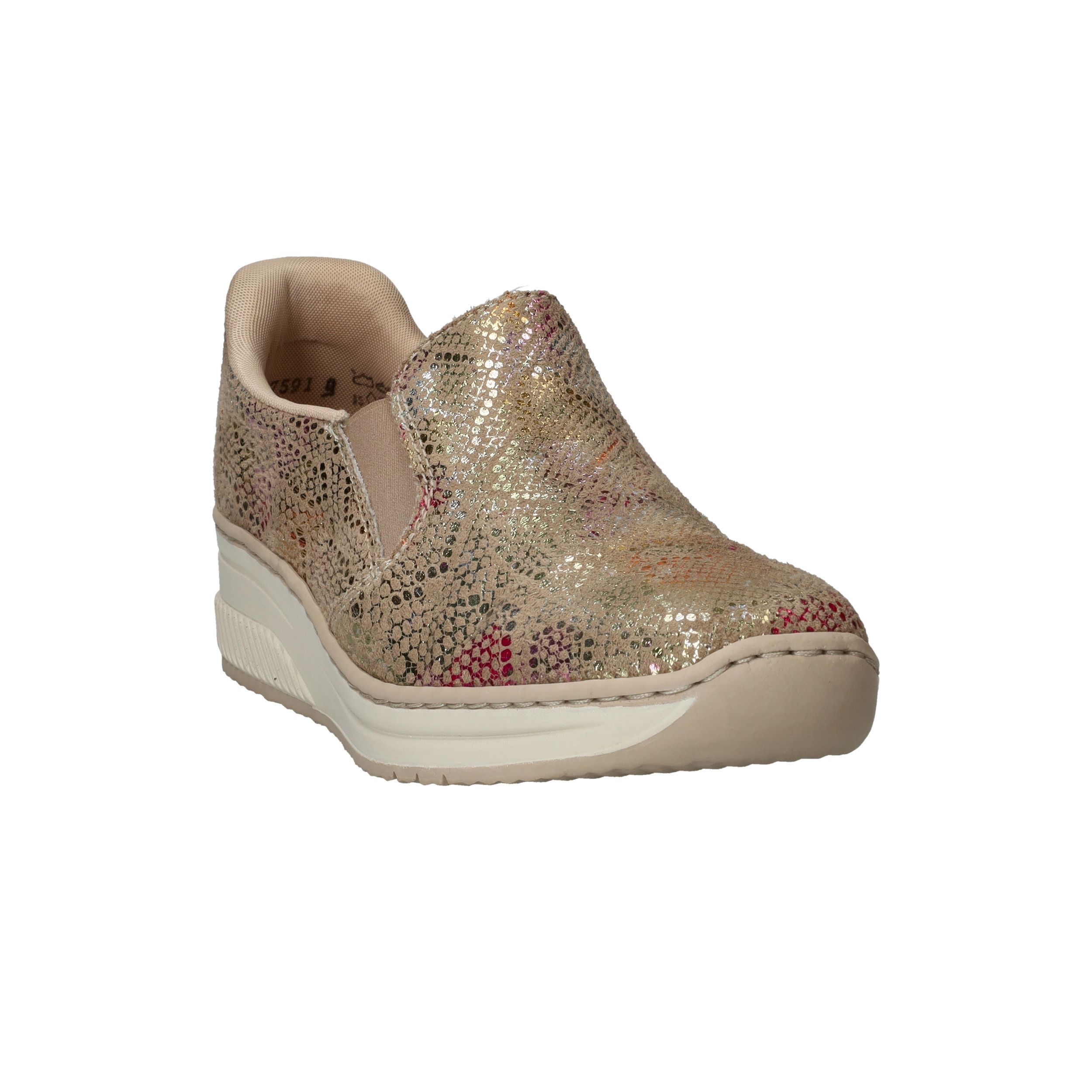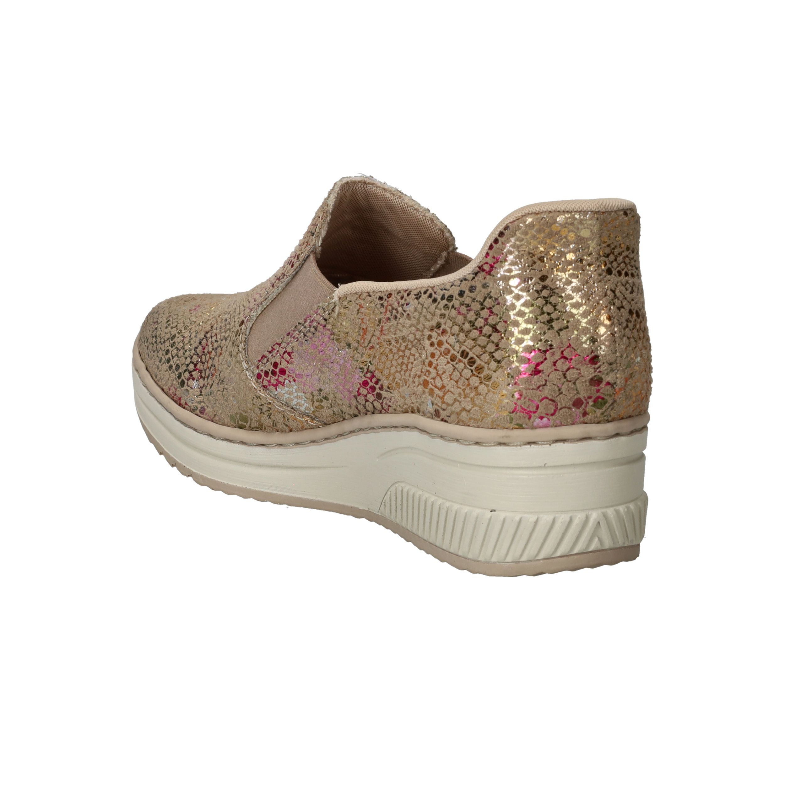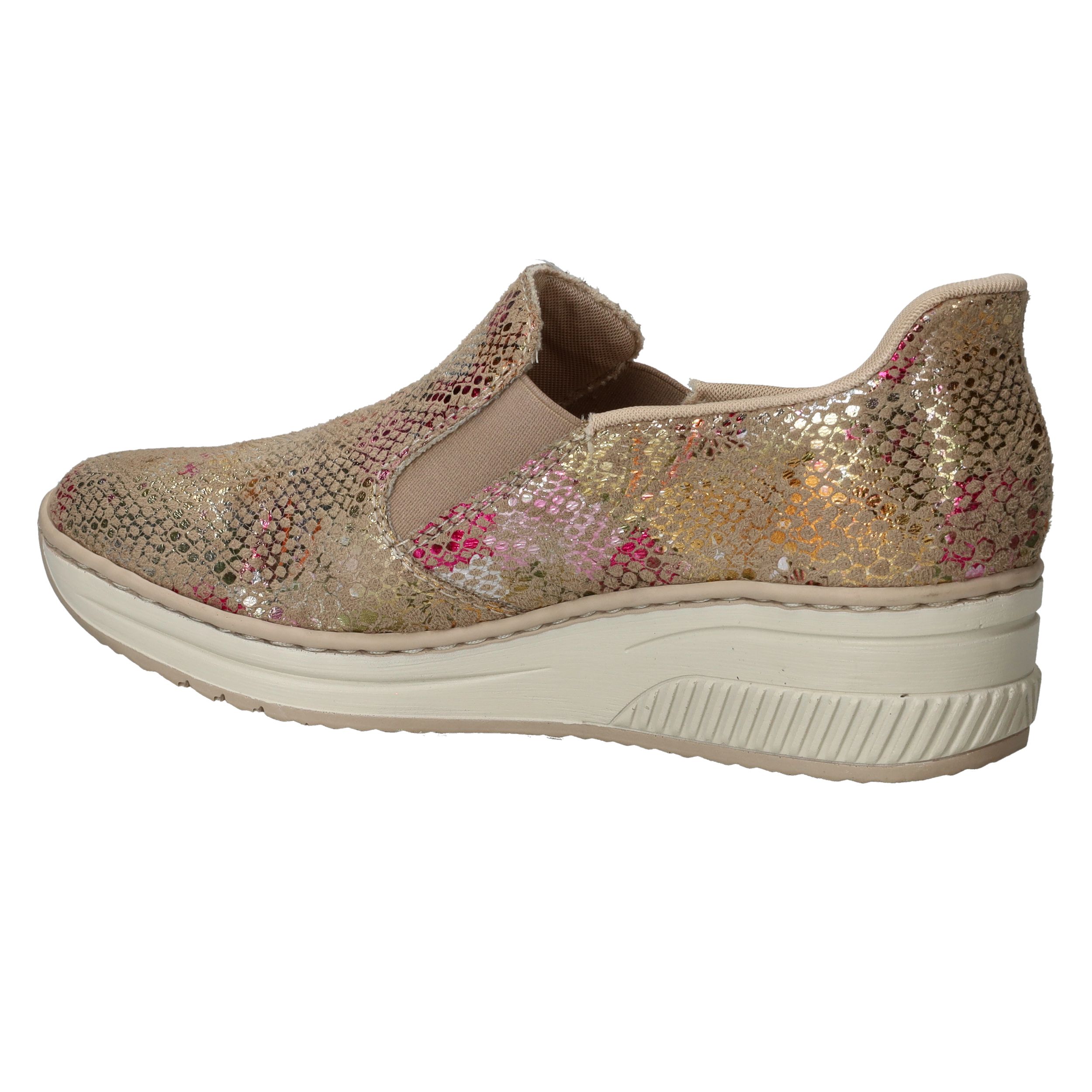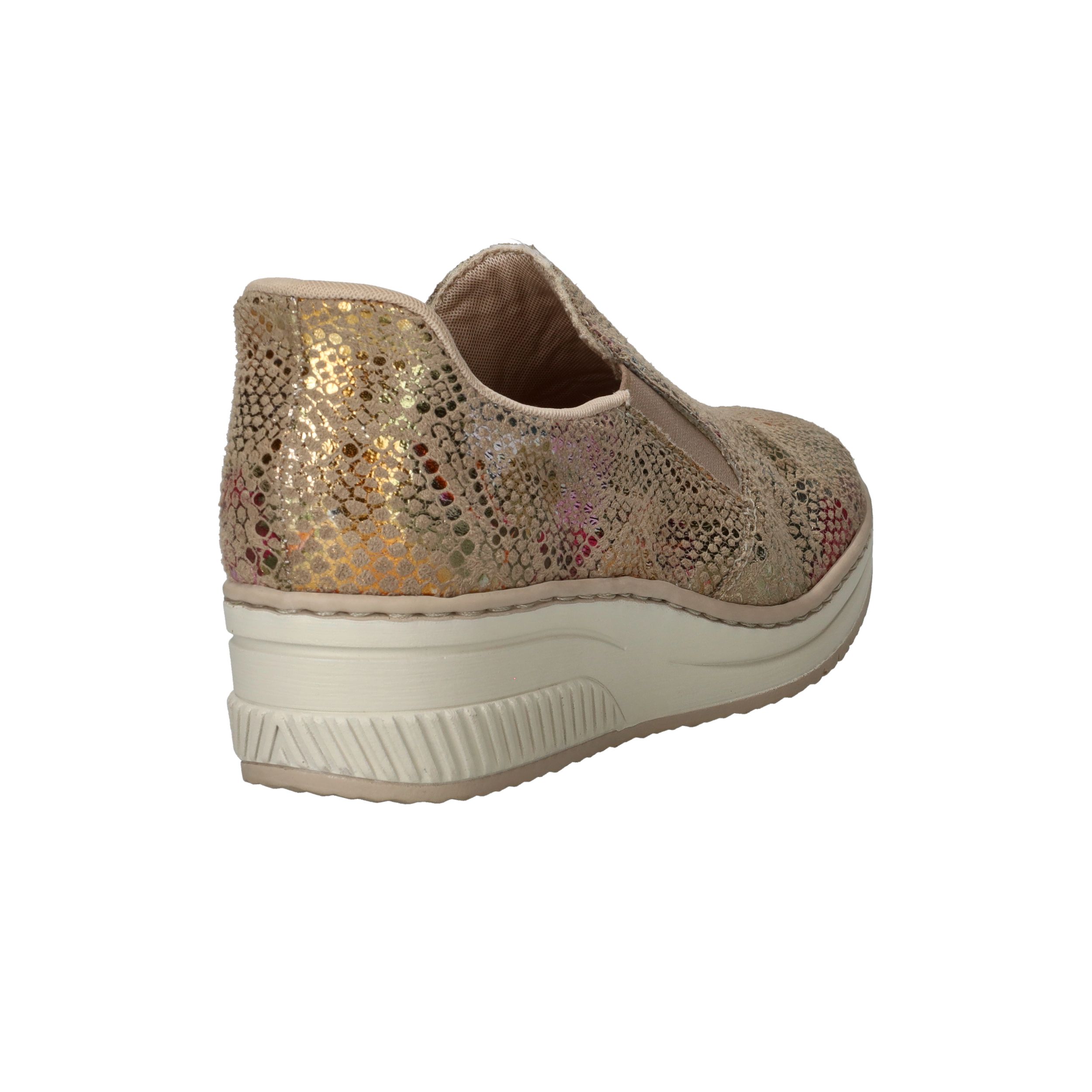 Met deze Rieker instapper maak je van elke outfit een feestje! De instapper heeft een stralende metallic print en stevige zool.