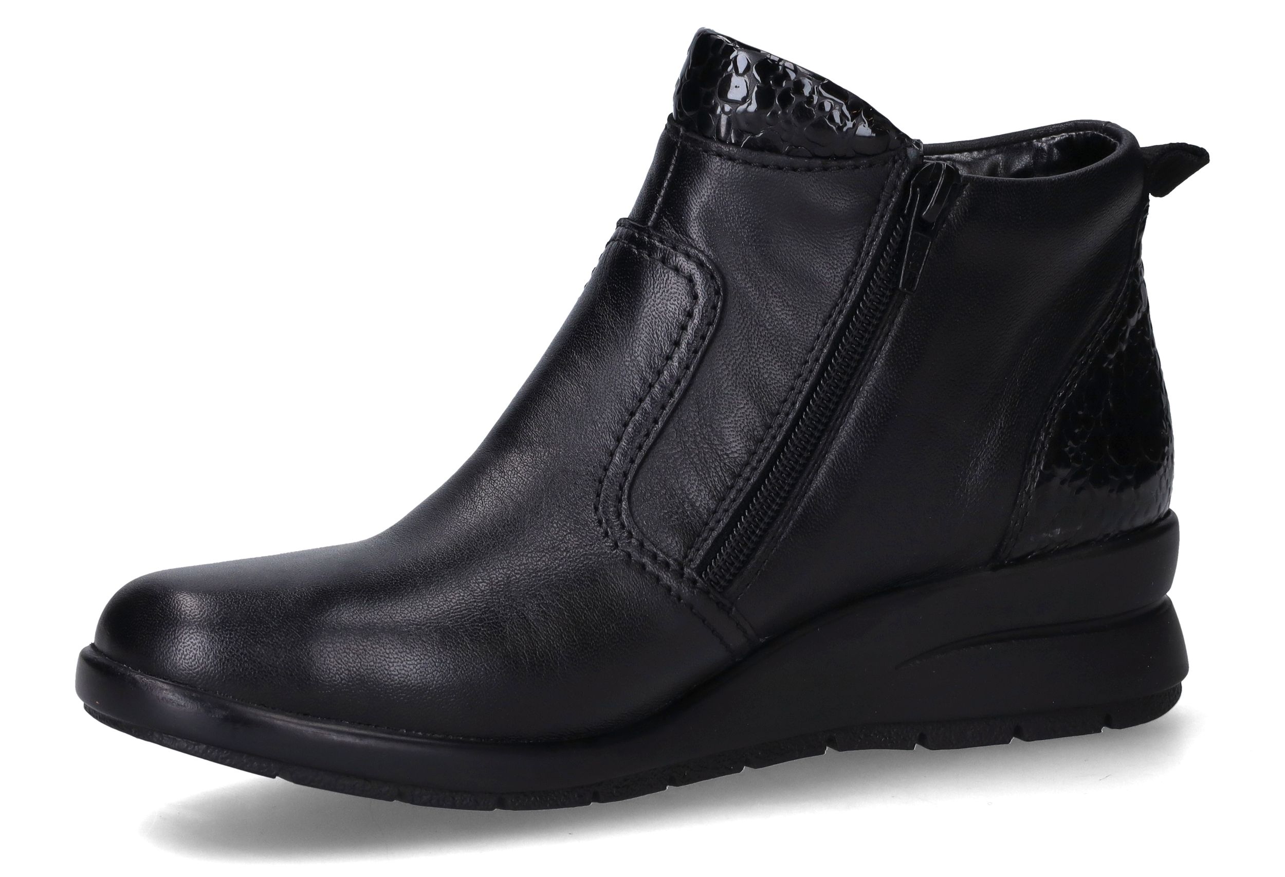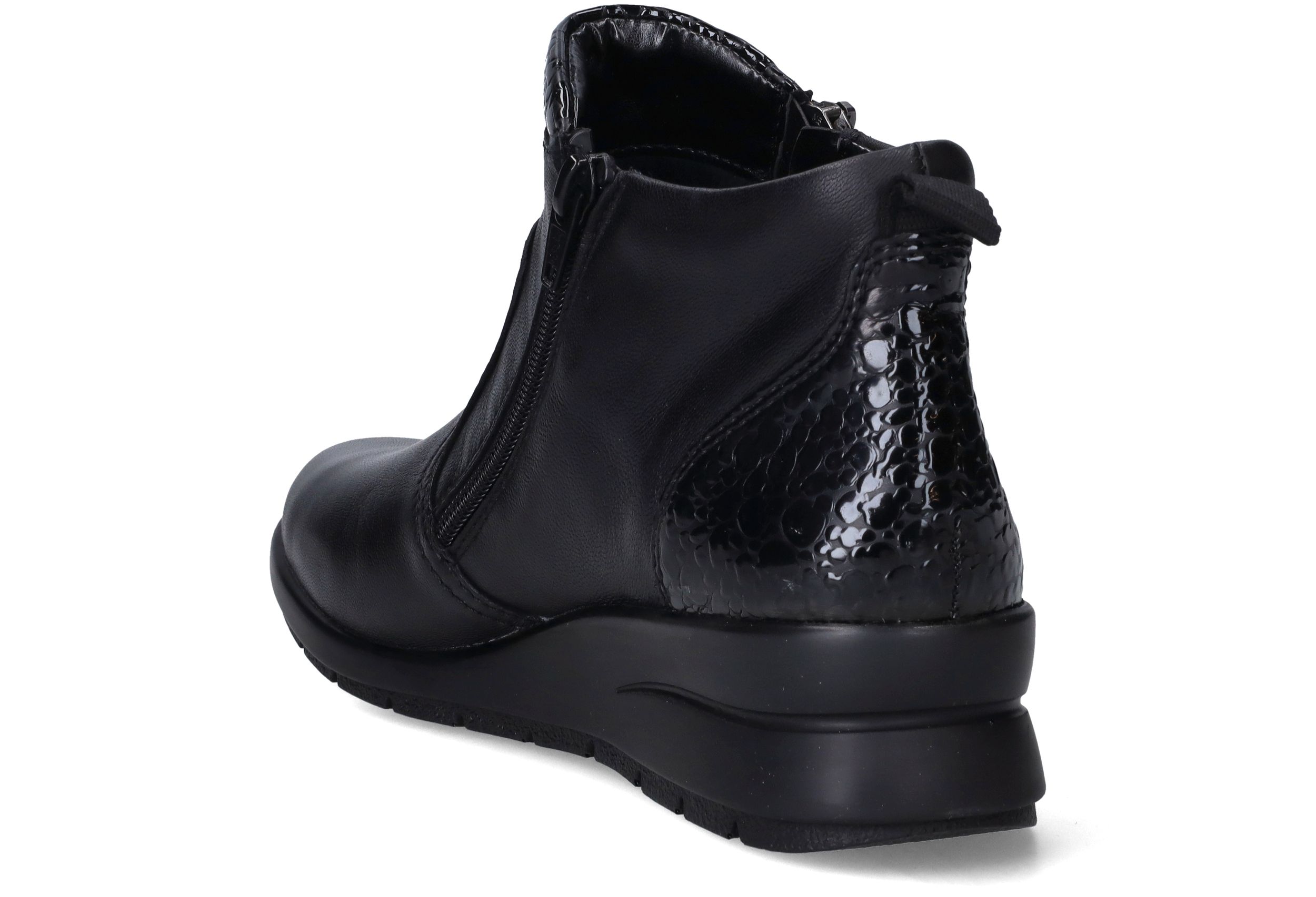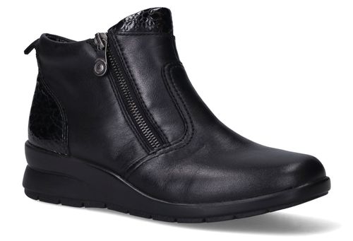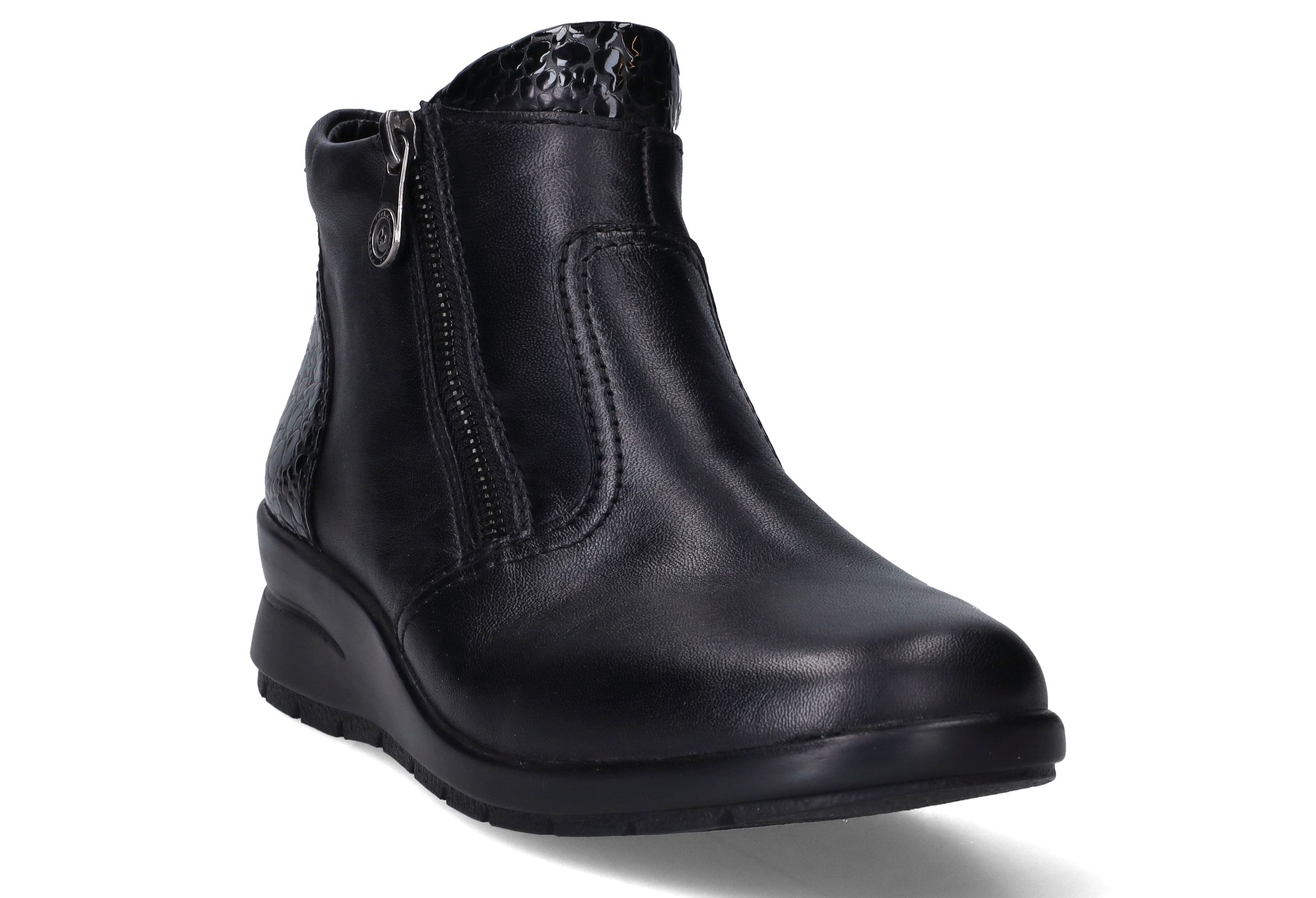 Deze zwarte enkellaarsjes van Rieker combineren klassiek leer met een moderne twist. De glanzende afwerking en de subtiele structuur op de hiel zorgen voor een verfijnde uitstraling. Dankzij de comfortabele pasvorm is dit een ideale keuze voor dames die een iets smallere, maar toch comfortabele schoen zoeken. De dubbele rits maakt instappen extra makkelijk.