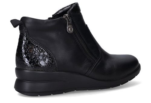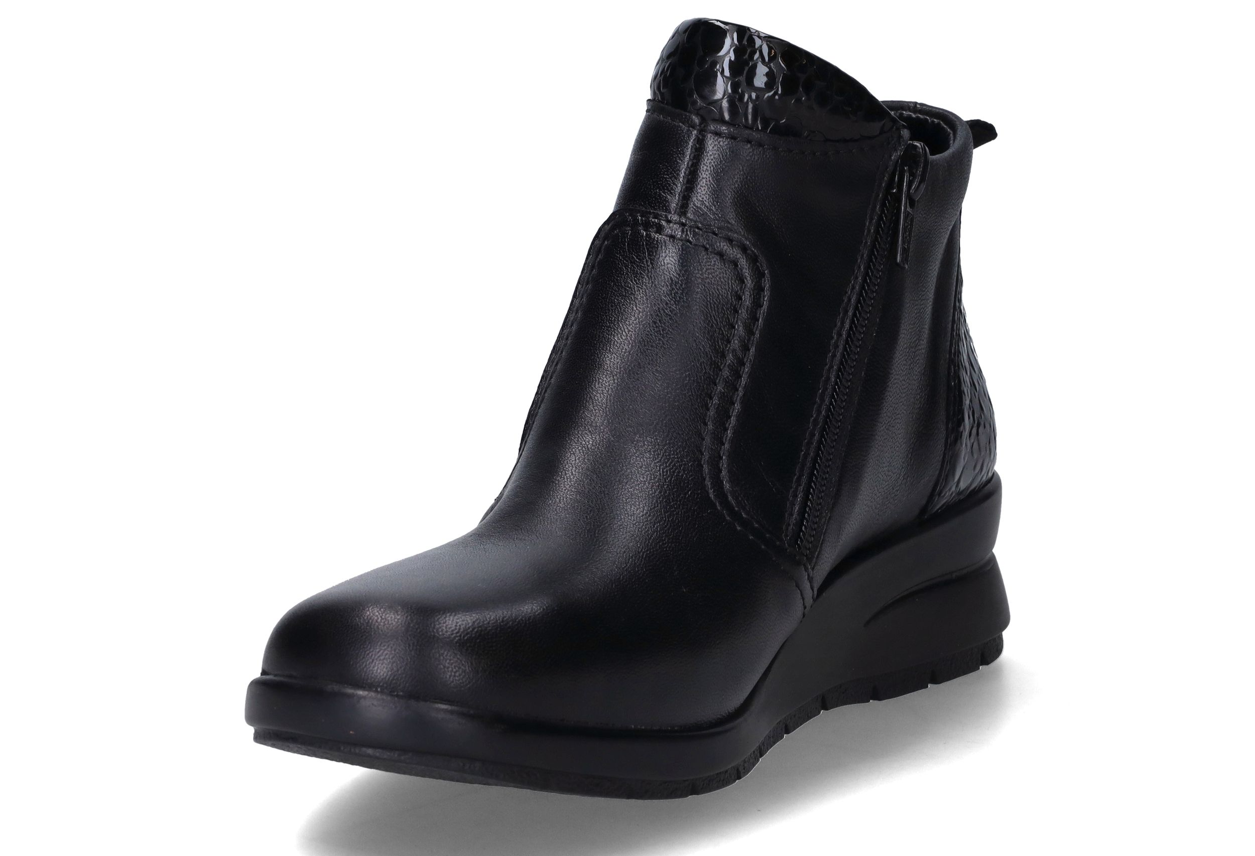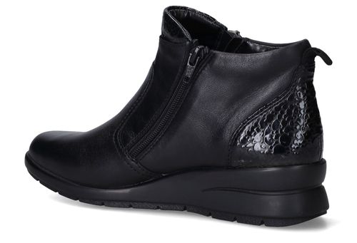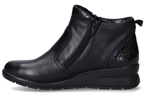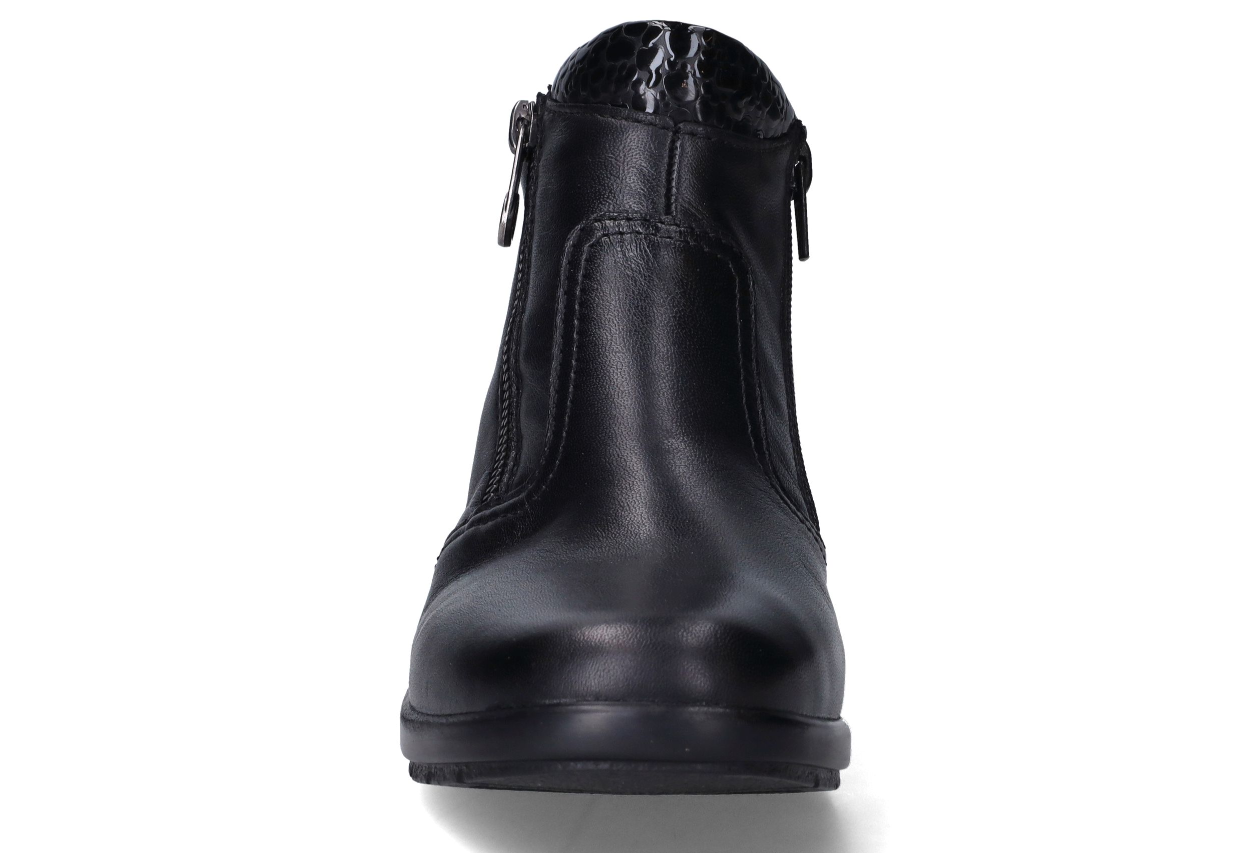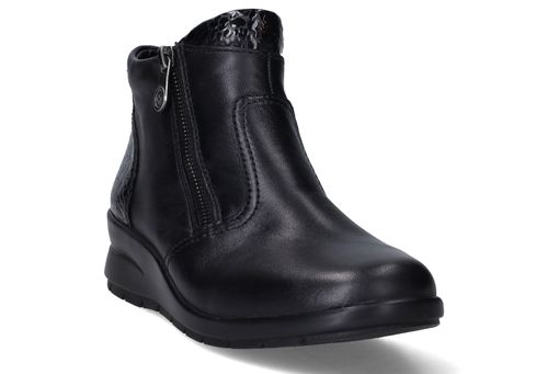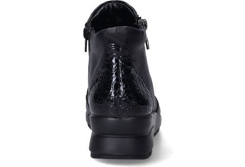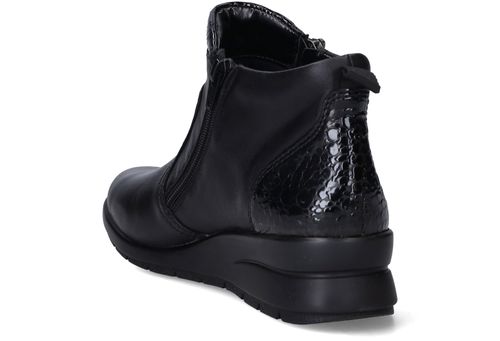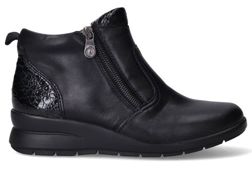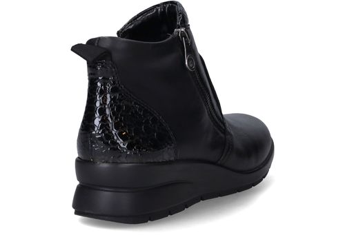 Deze zwarte enkellaarsjes van Rieker combineren klassiek leer met een moderne twist. De glanzende afwerking en de subtiele structuur op de hiel zorgen voor een verfijnde uitstraling. Dankzij de comfortabele pasvorm is dit een ideale keuze voor dames die een iets smallere, maar toch comfortabele schoen zoeken. De dubbele rits maakt instappen extra makkelijk.