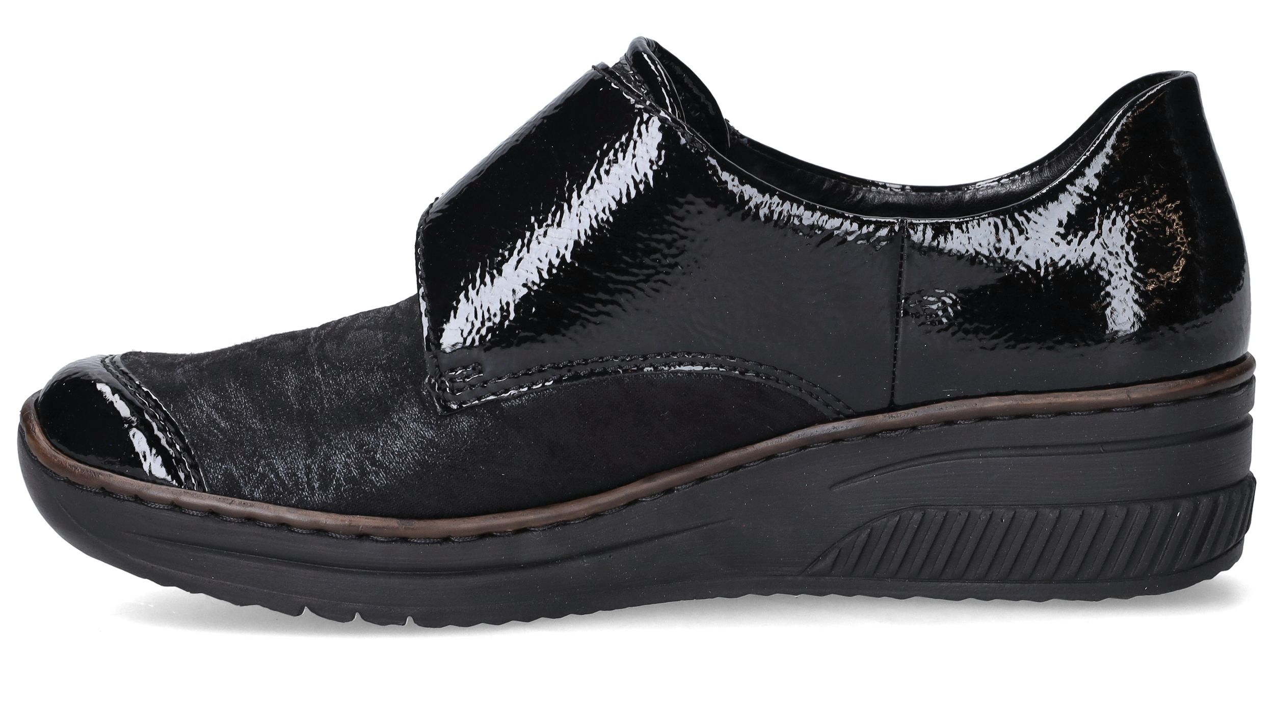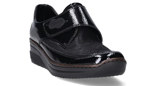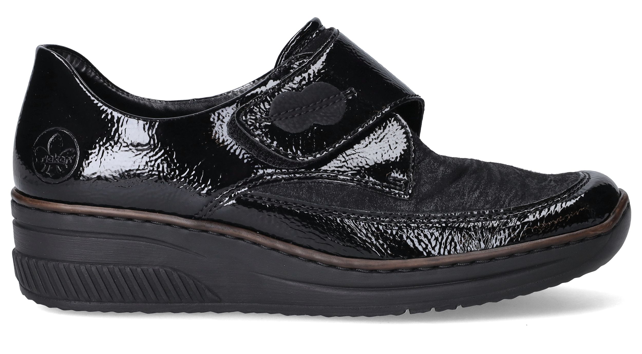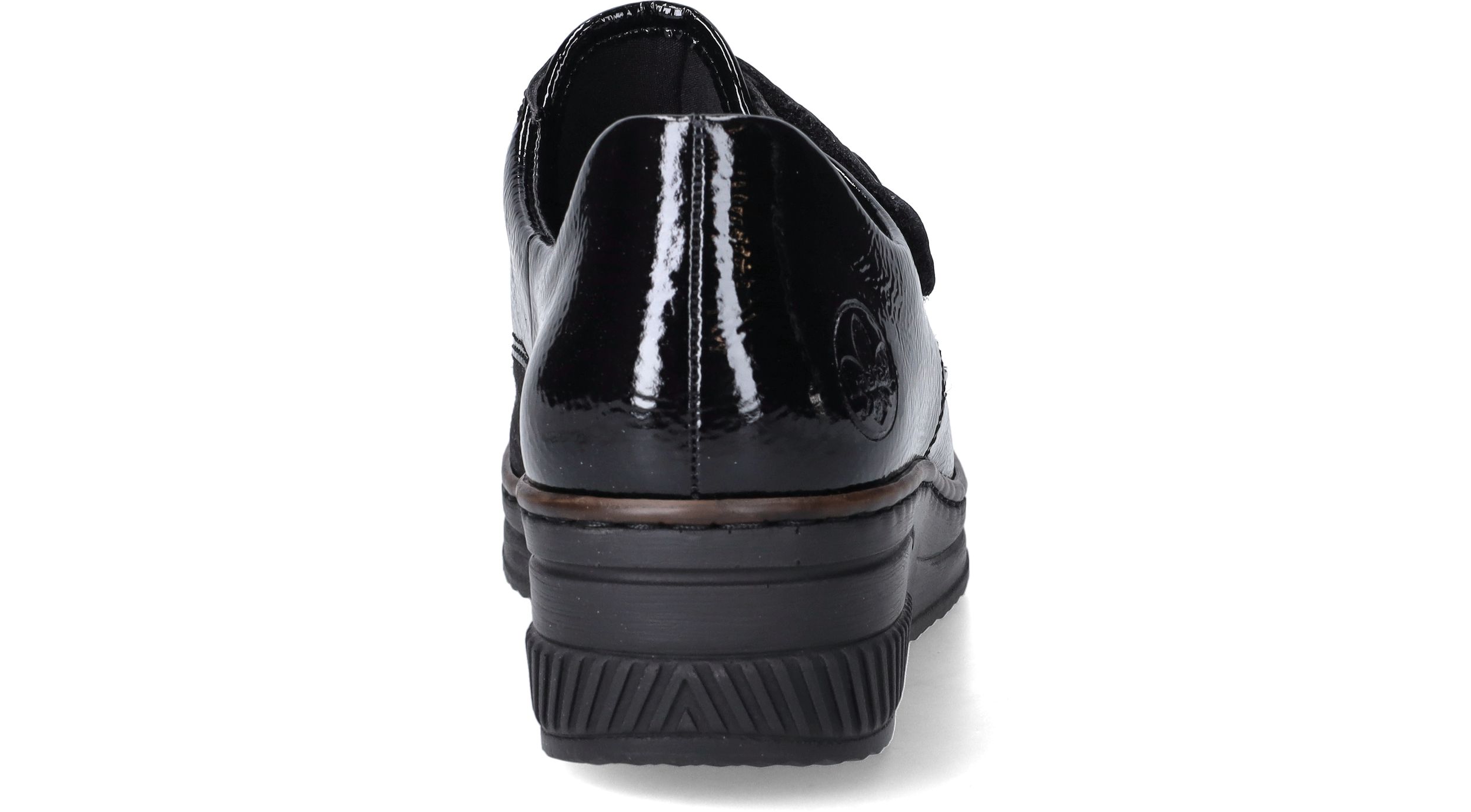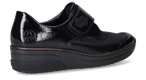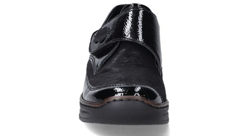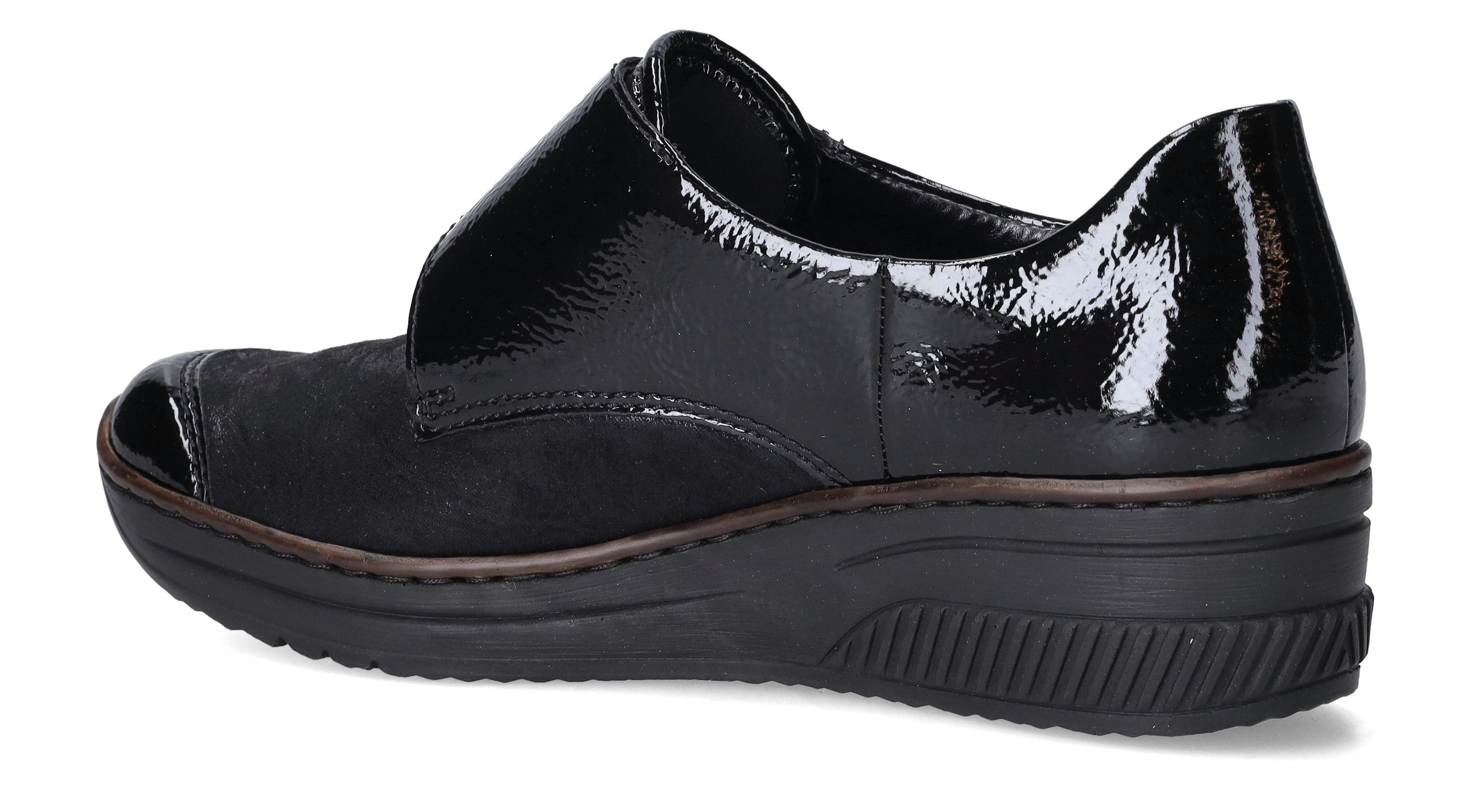 Met deze zwarte instappers van Rieker geniet je van comfort en gemak, zonder in te leveren op stijl. De combinatie van glanzend lakmateriaal met flexibel textiel zorgt voor een elegante uitstraling en een zachte pasvorm. Deze dames schoen is ideaal voor dagelijks gebruik en speciaal ontworpen voor een smallerevoetbreedte F.
