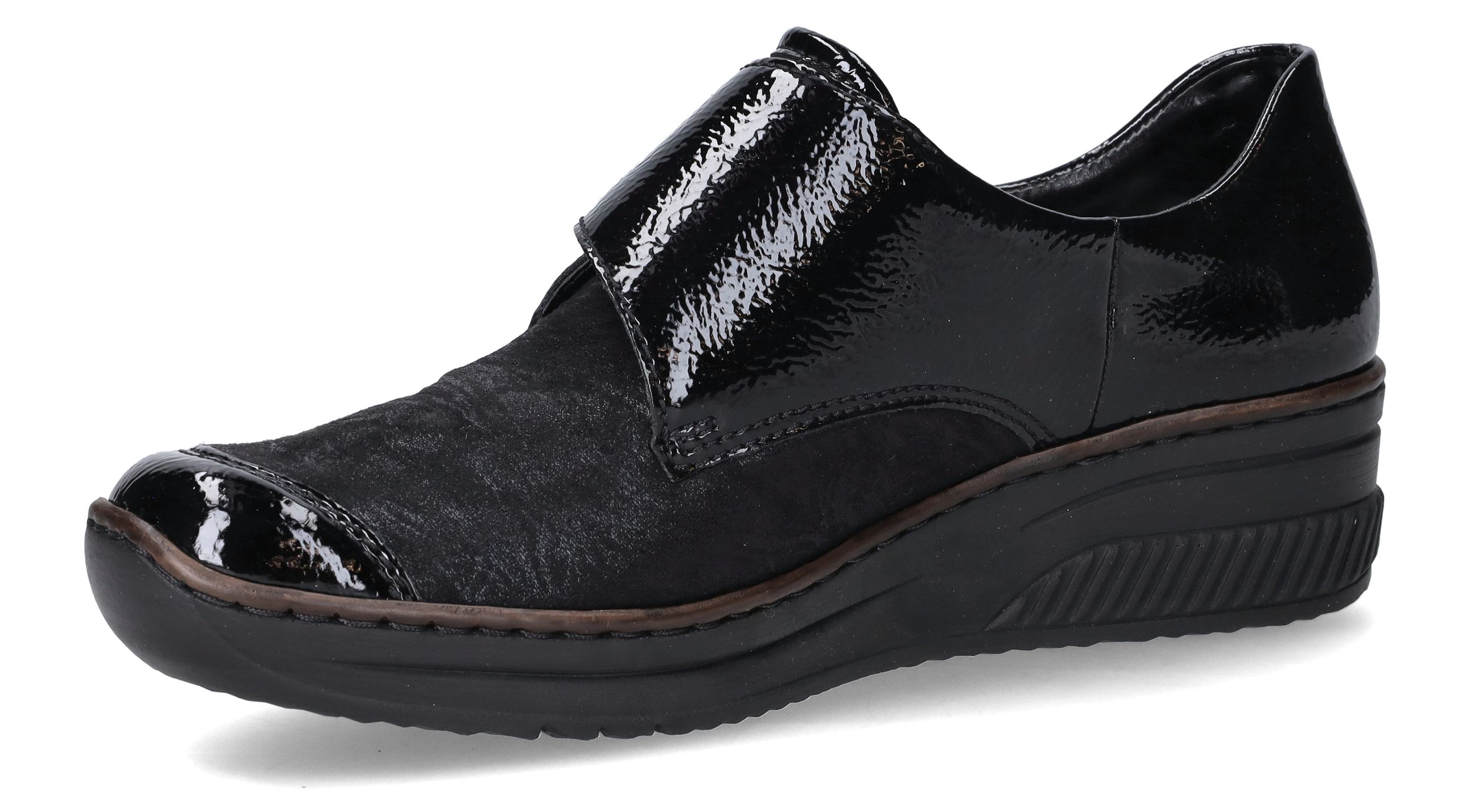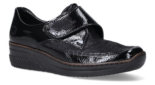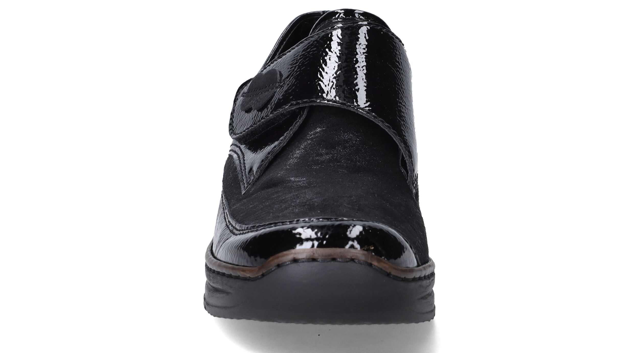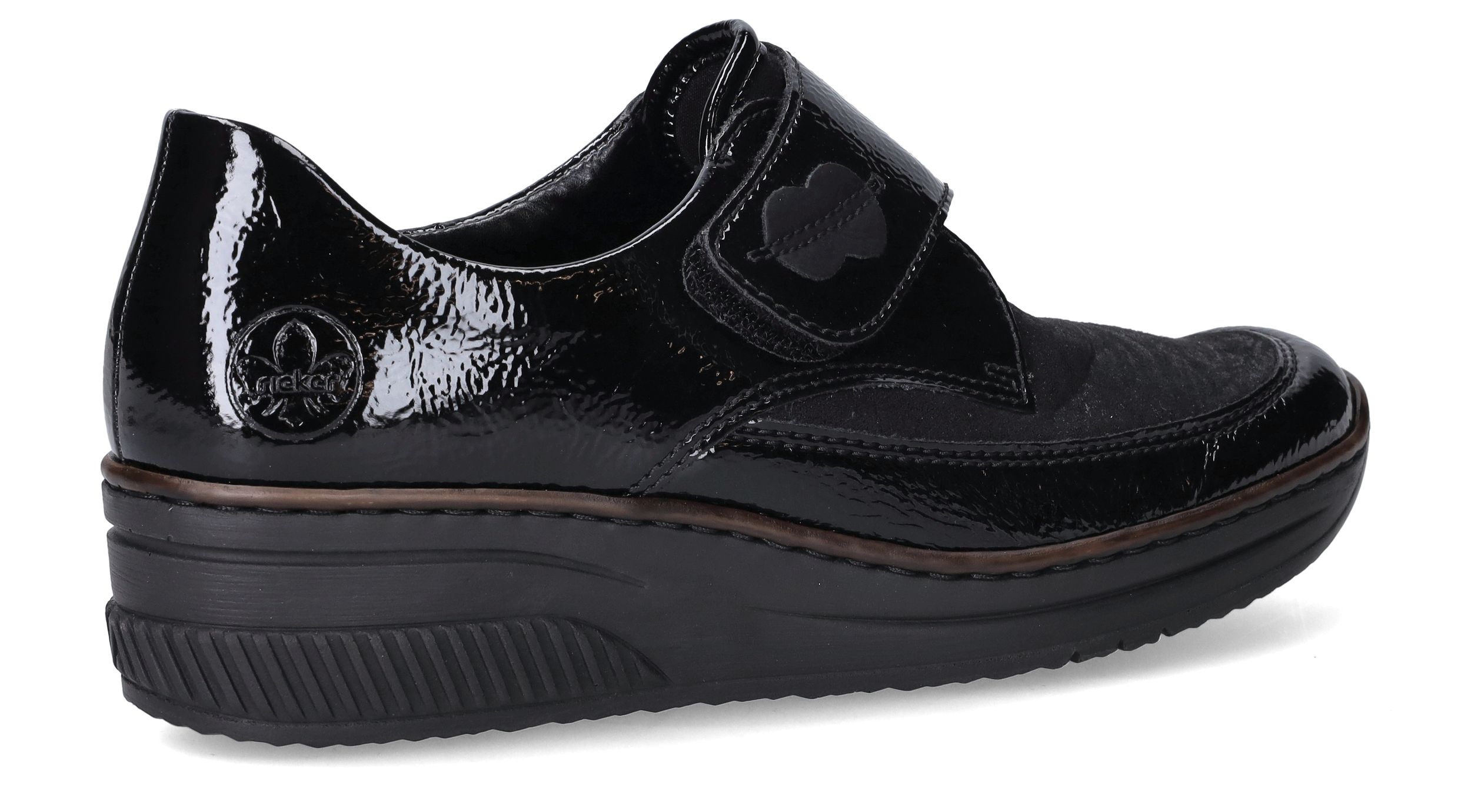 Met deze zwarte instappers van Rieker geniet je van comfort en gemak, zonder in te leveren op stijl. De combinatie van glanzend lakmateriaal met flexibel textiel zorgt voor een elegante uitstraling en een zachte pasvorm. Deze dames schoen is ideaal voor dagelijks gebruik en speciaal ontworpen voor een smallerevoetbreedte F.