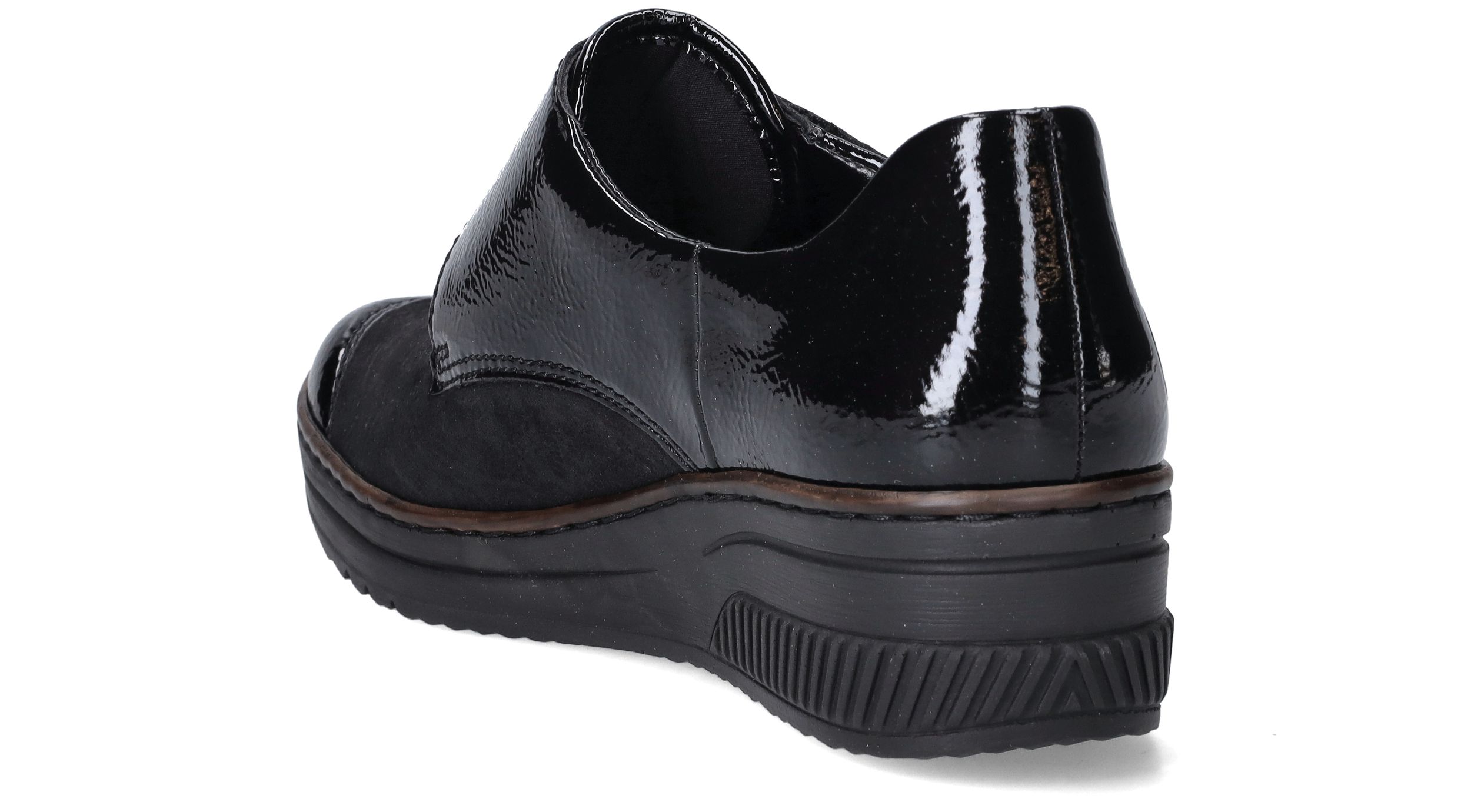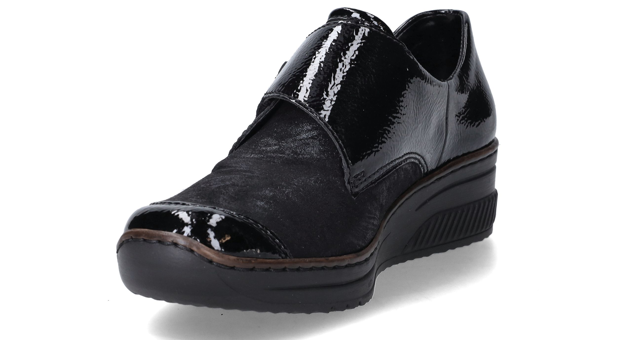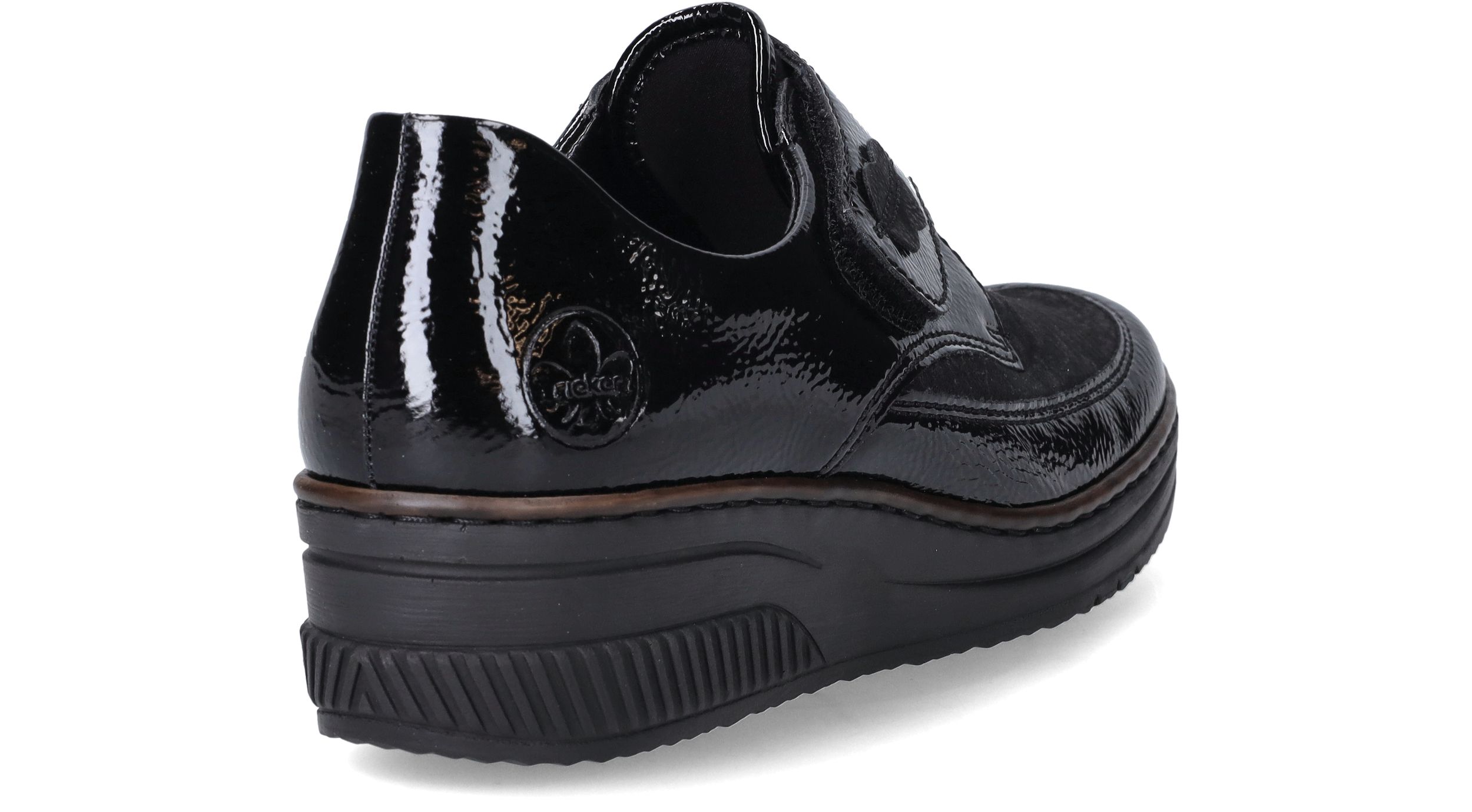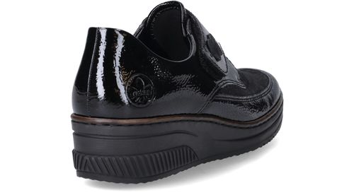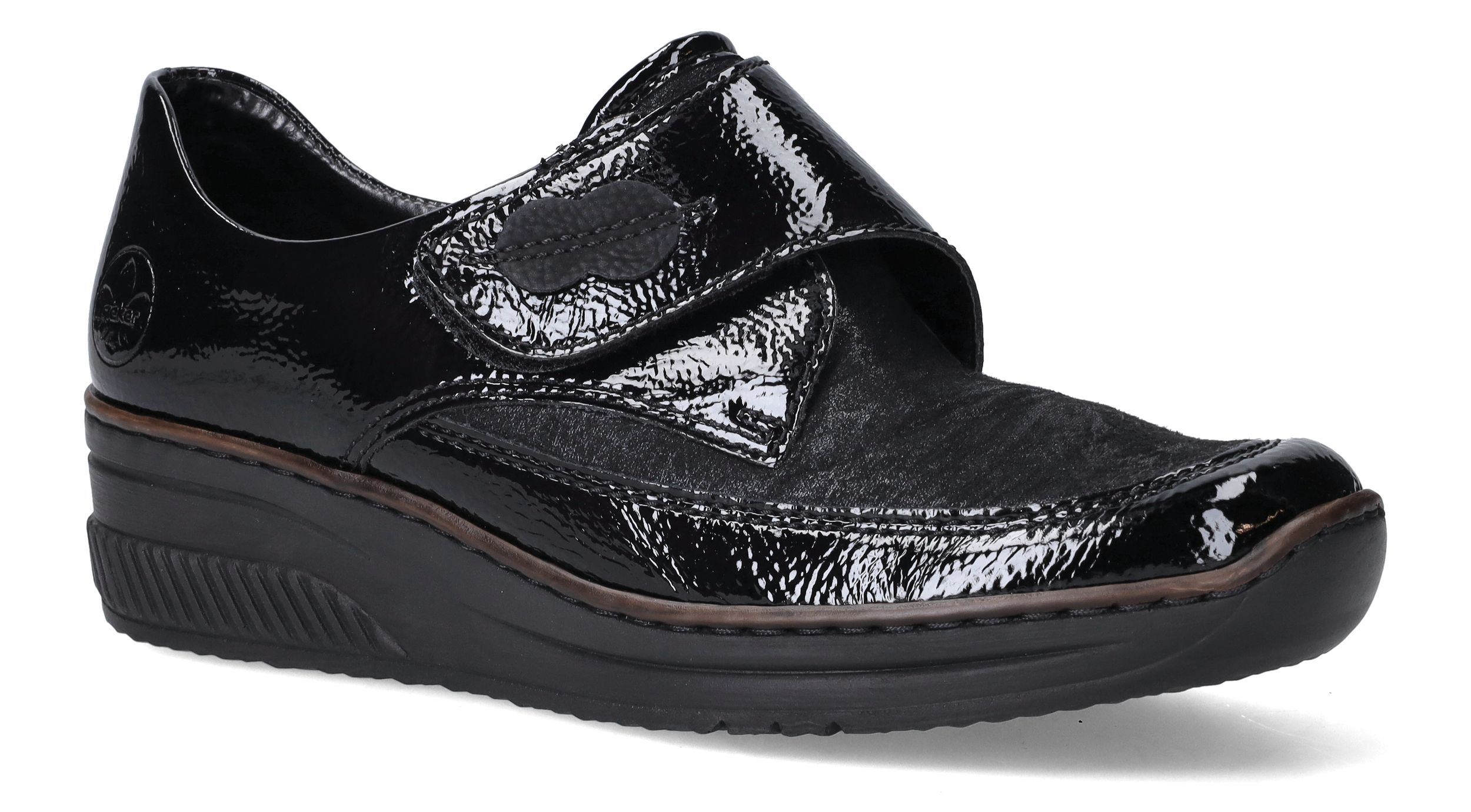 Met deze zwarte instappers van Rieker geniet je van comfort en gemak, zonder in te leveren op stijl. De combinatie van glanzend lakmateriaal met flexibel textiel zorgt voor een elegante uitstraling en een zachte pasvorm. Deze dames schoen is ideaal voor dagelijks gebruik en speciaal ontworpen voor een smallerevoetbreedte F.