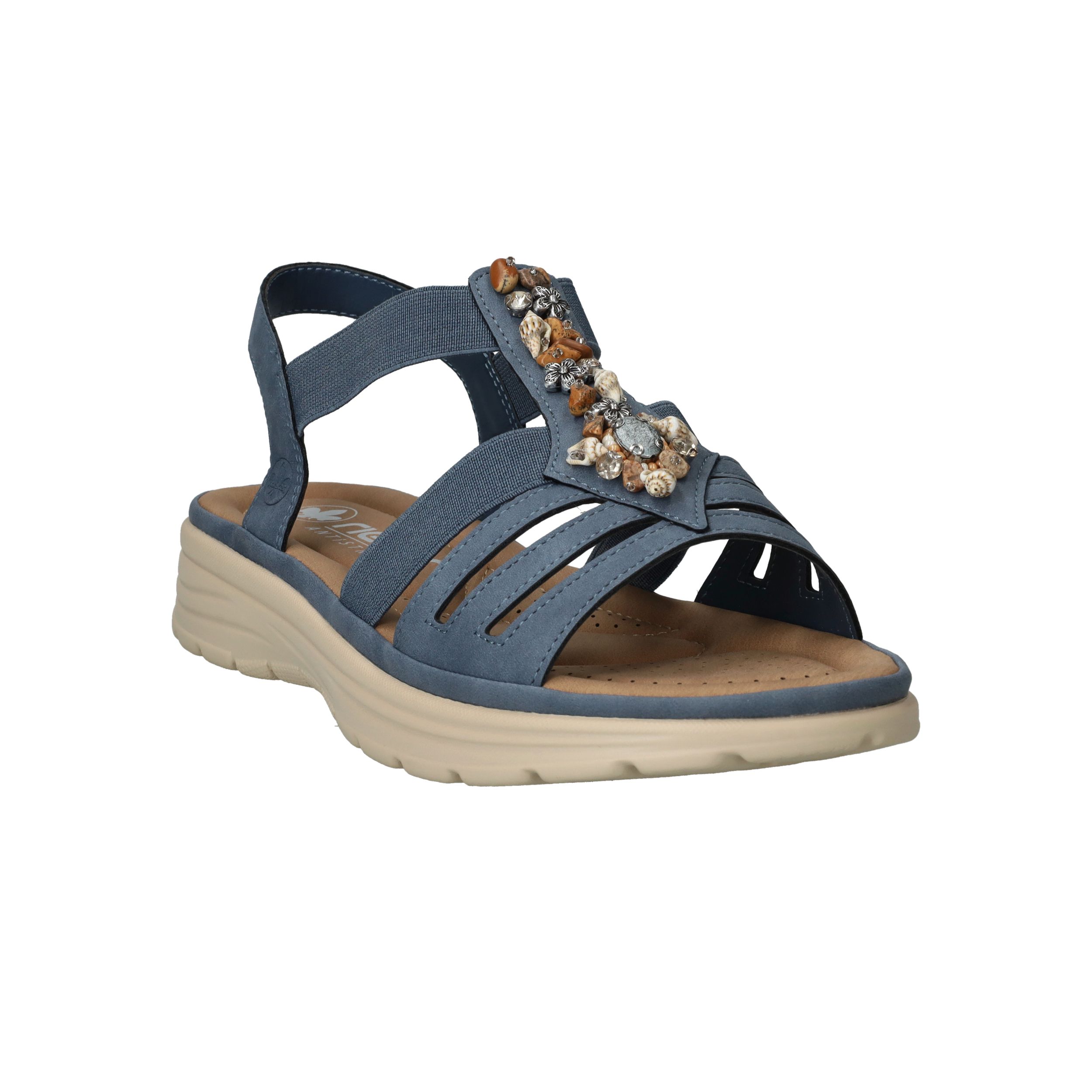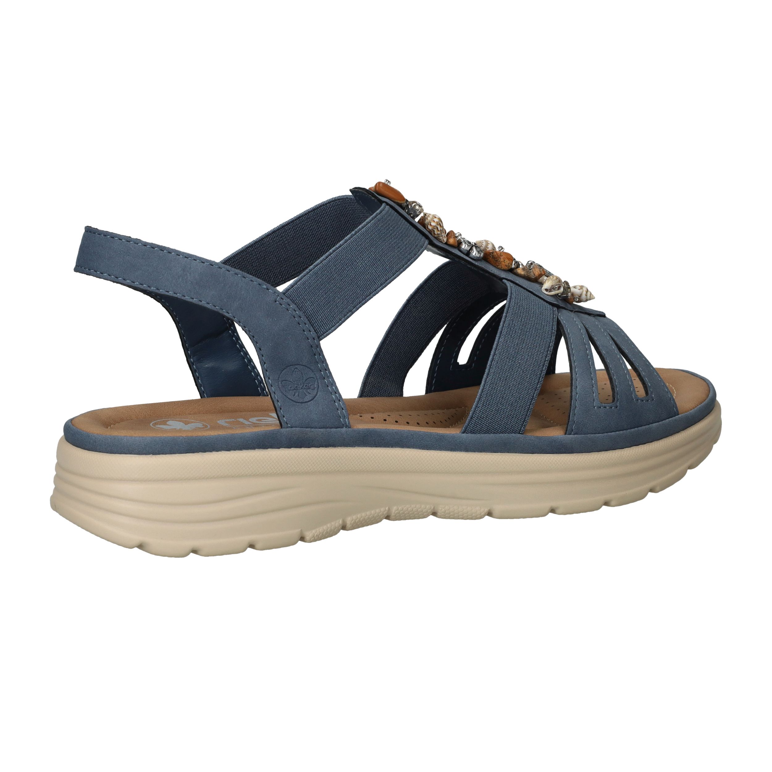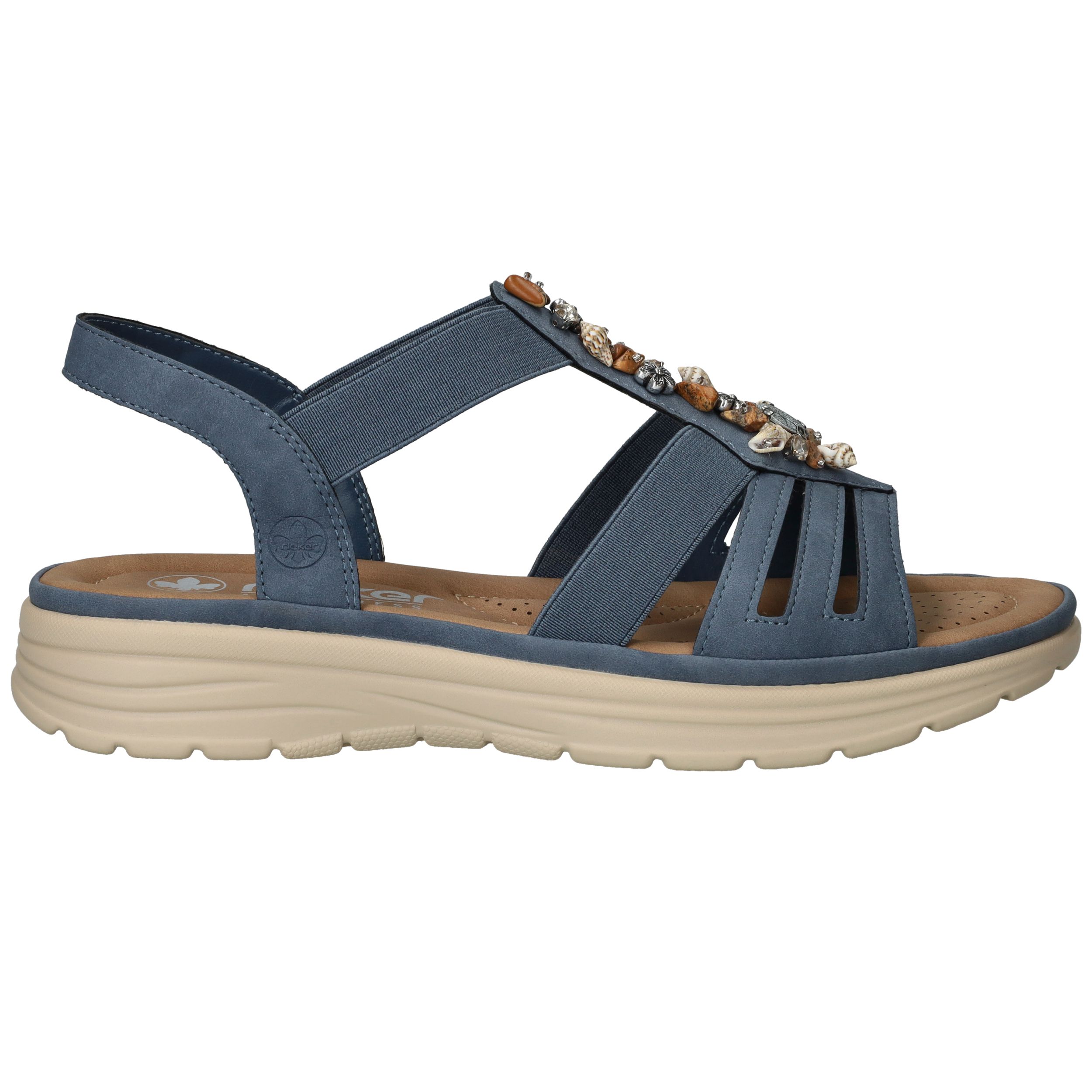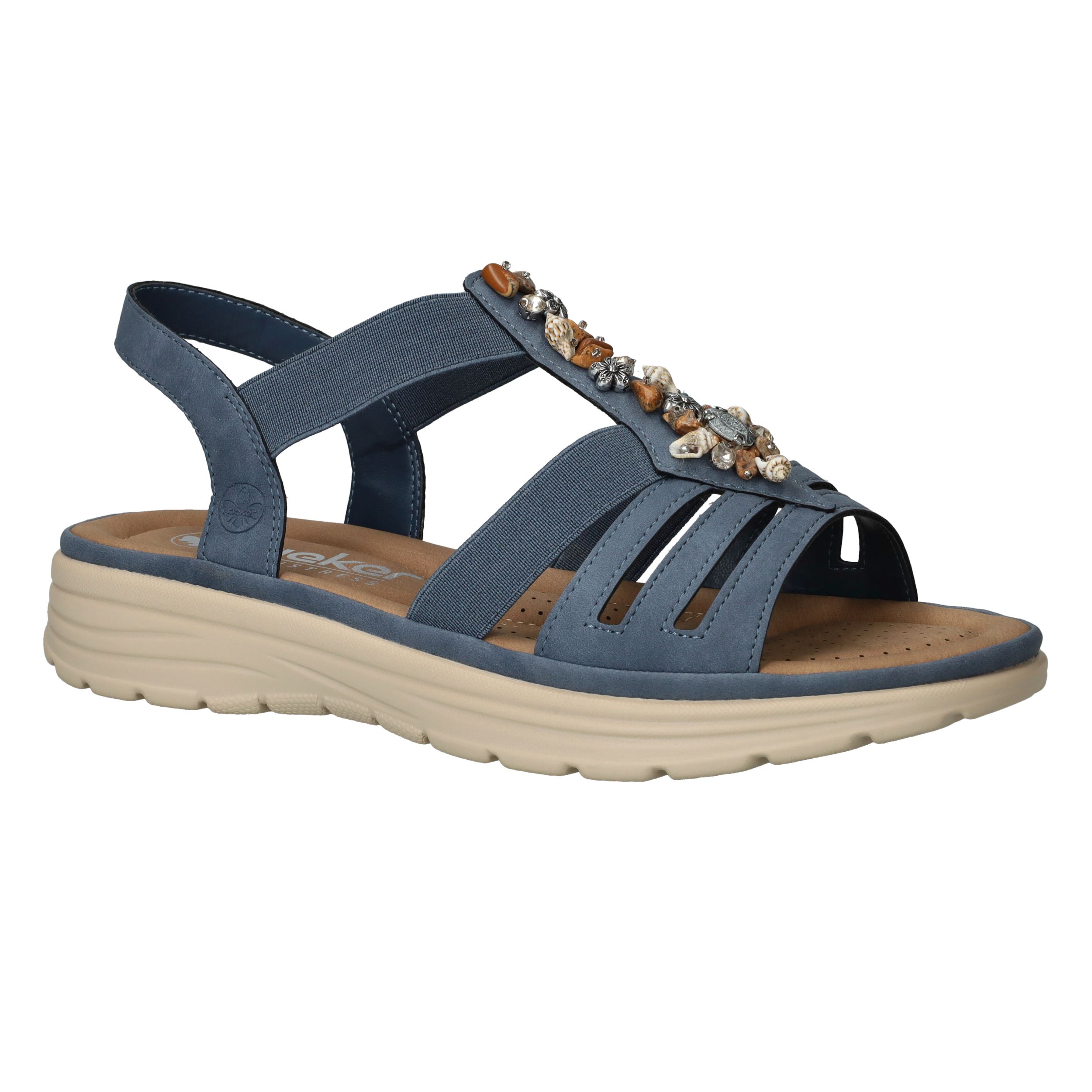 Loop comfortabel en stijlvol de zomer door met de Rieker sandalen, model V8549. Deze damessandalen in een prachtige blauwe kleur zijn vervaardigd uit een combinatie van synthetisch materiaal en textiel, wat zorgt voor een comfortabele pasvorm. De sandalen zijn voorzien van een comfortabele zool en een zachte binnenzool, waardoor je de hele dag comfortabel kunt lopen. De opvallende sierstenen en de verstelbare bandjes geven deze sandalen een unieke en trendy touch.