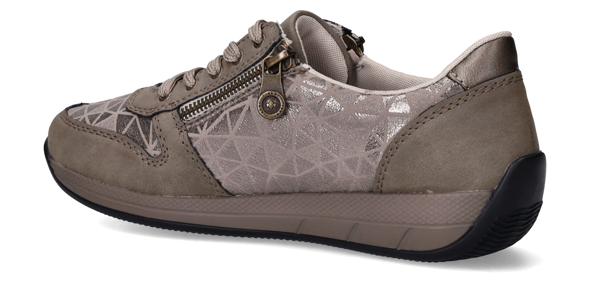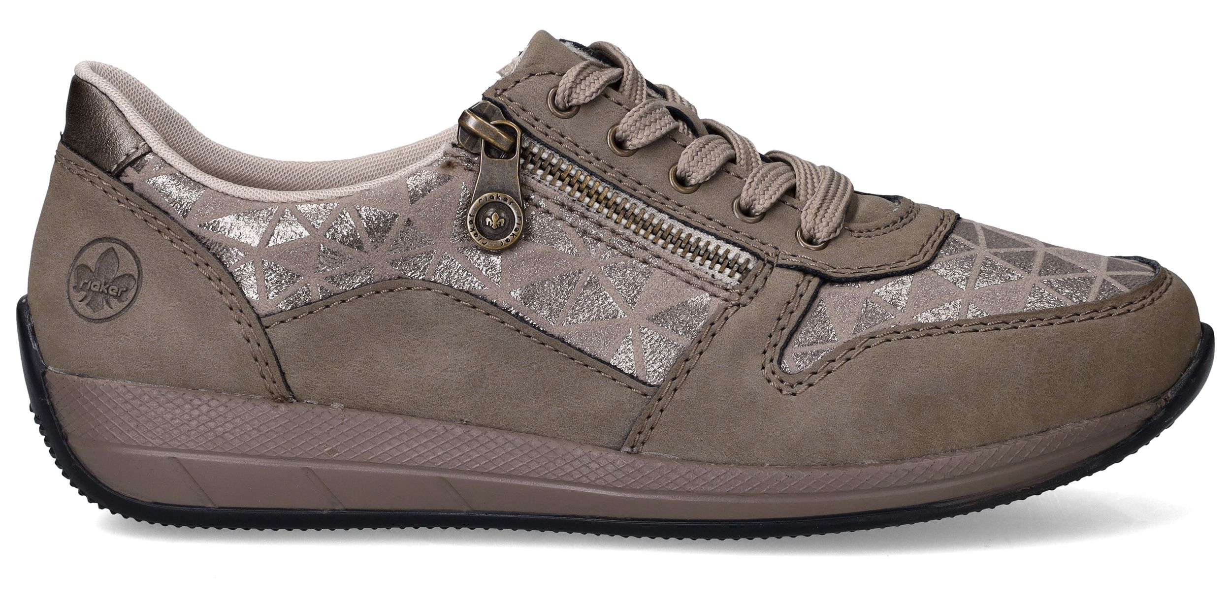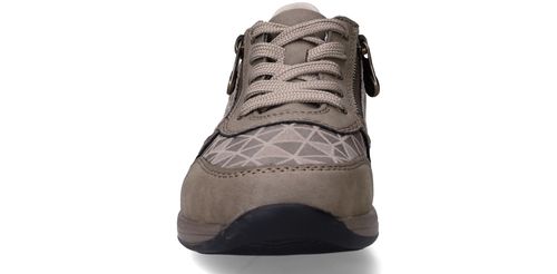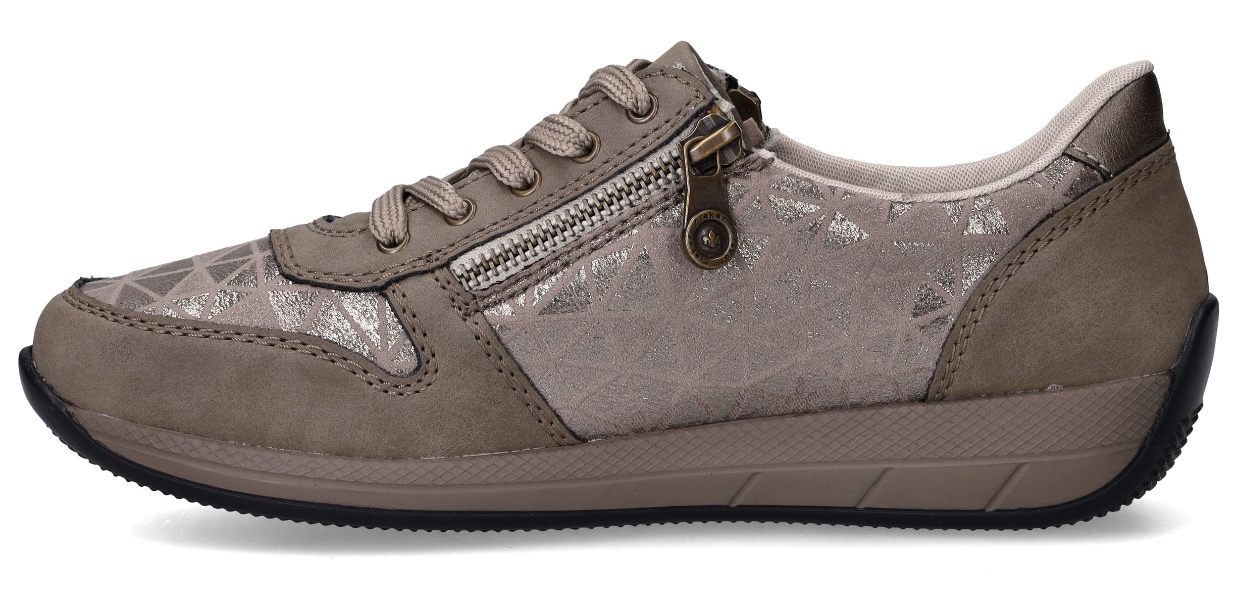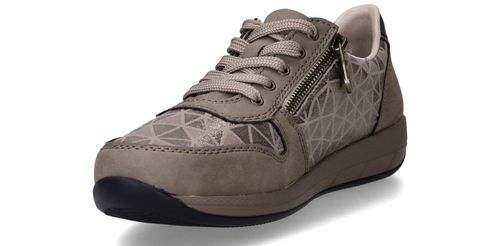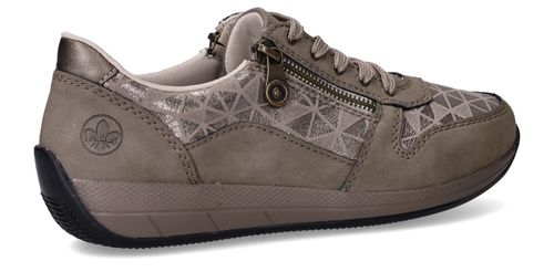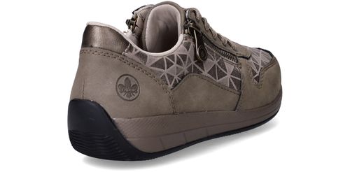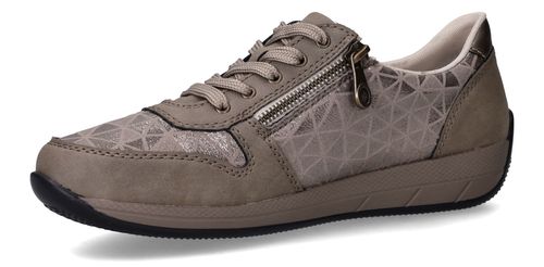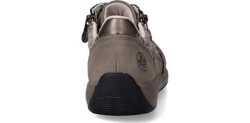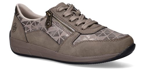 Deze taupekleurige sneakers van Rieker zijn een perfecte mix van comfort en opvallend design. De geometrische metallic print en de ritssluiting geven deze dames sneaker een speelse en moderne uitstraling. Dankzij de ruime pasvorm met voetbreedte H ervaar je extra bewegingsvrijheid en ondersteuning bij elke stap.