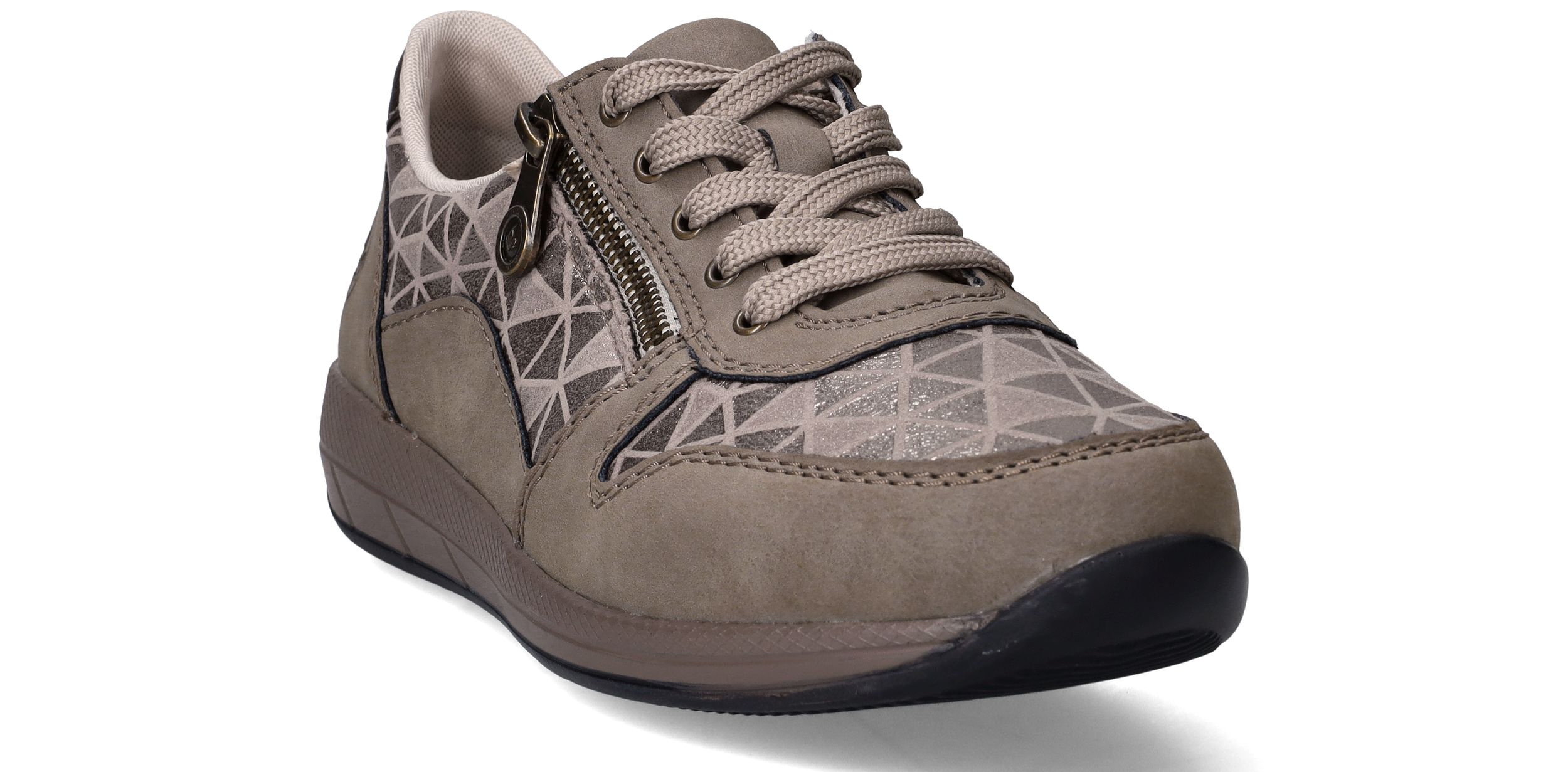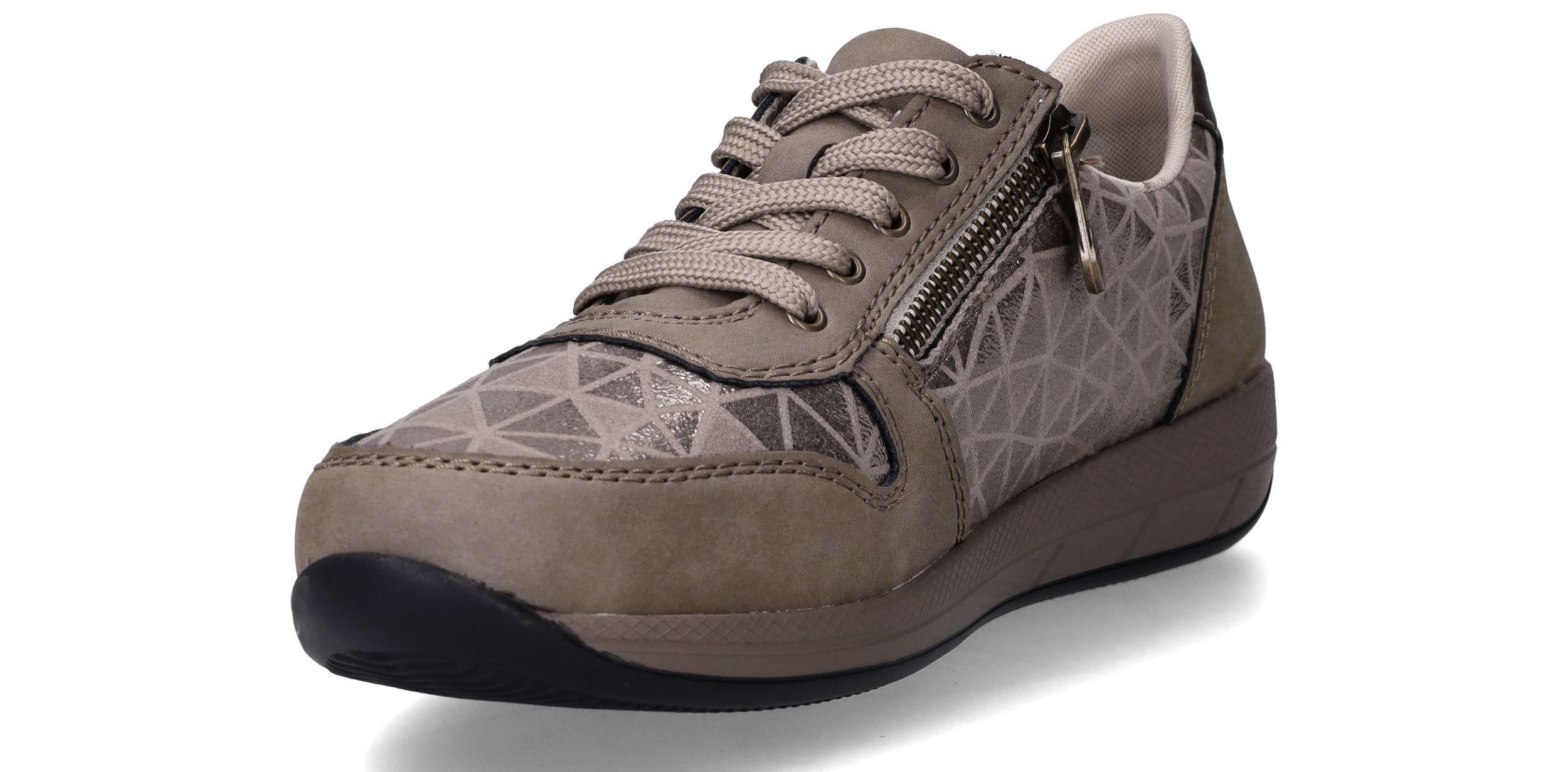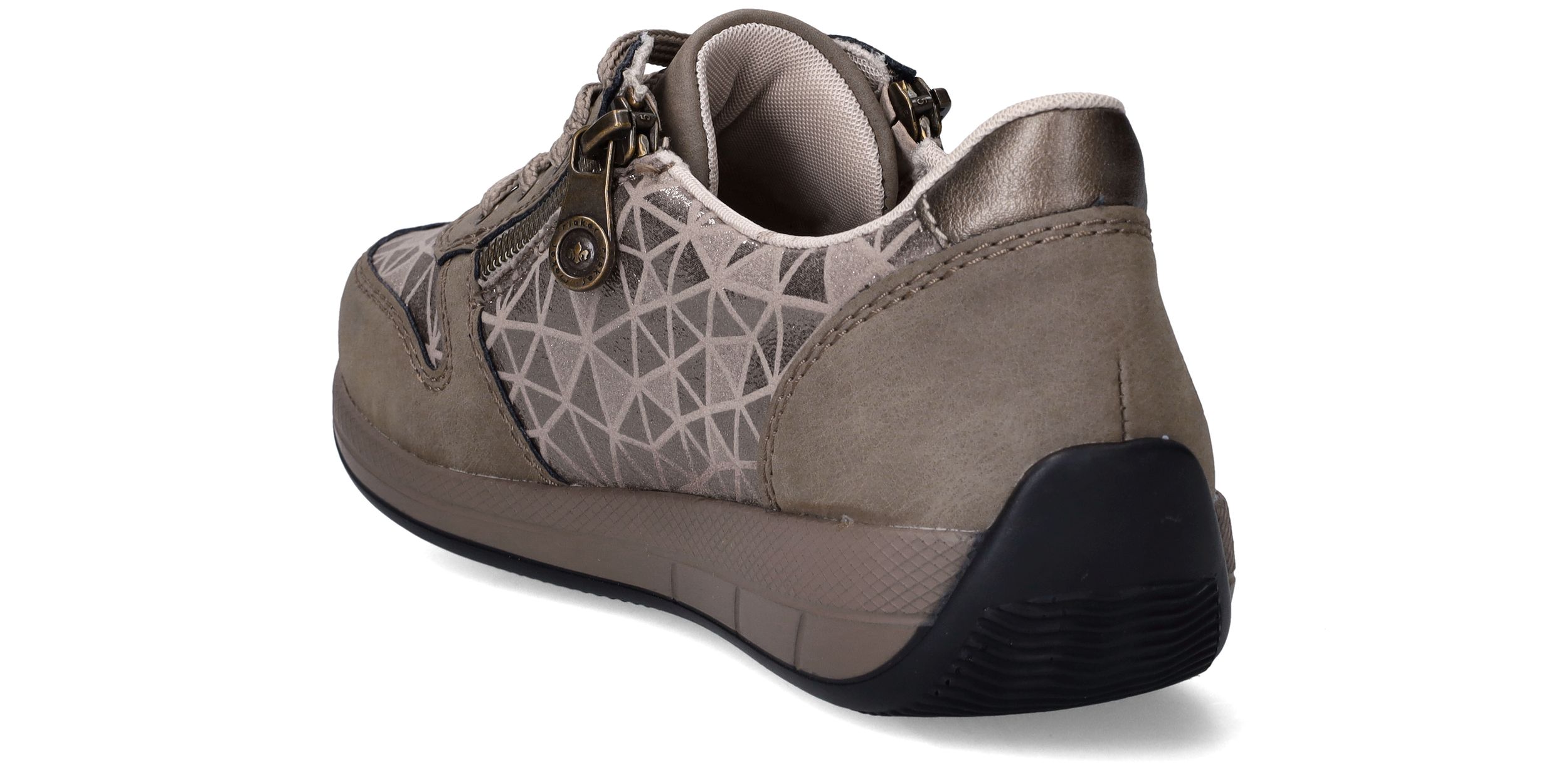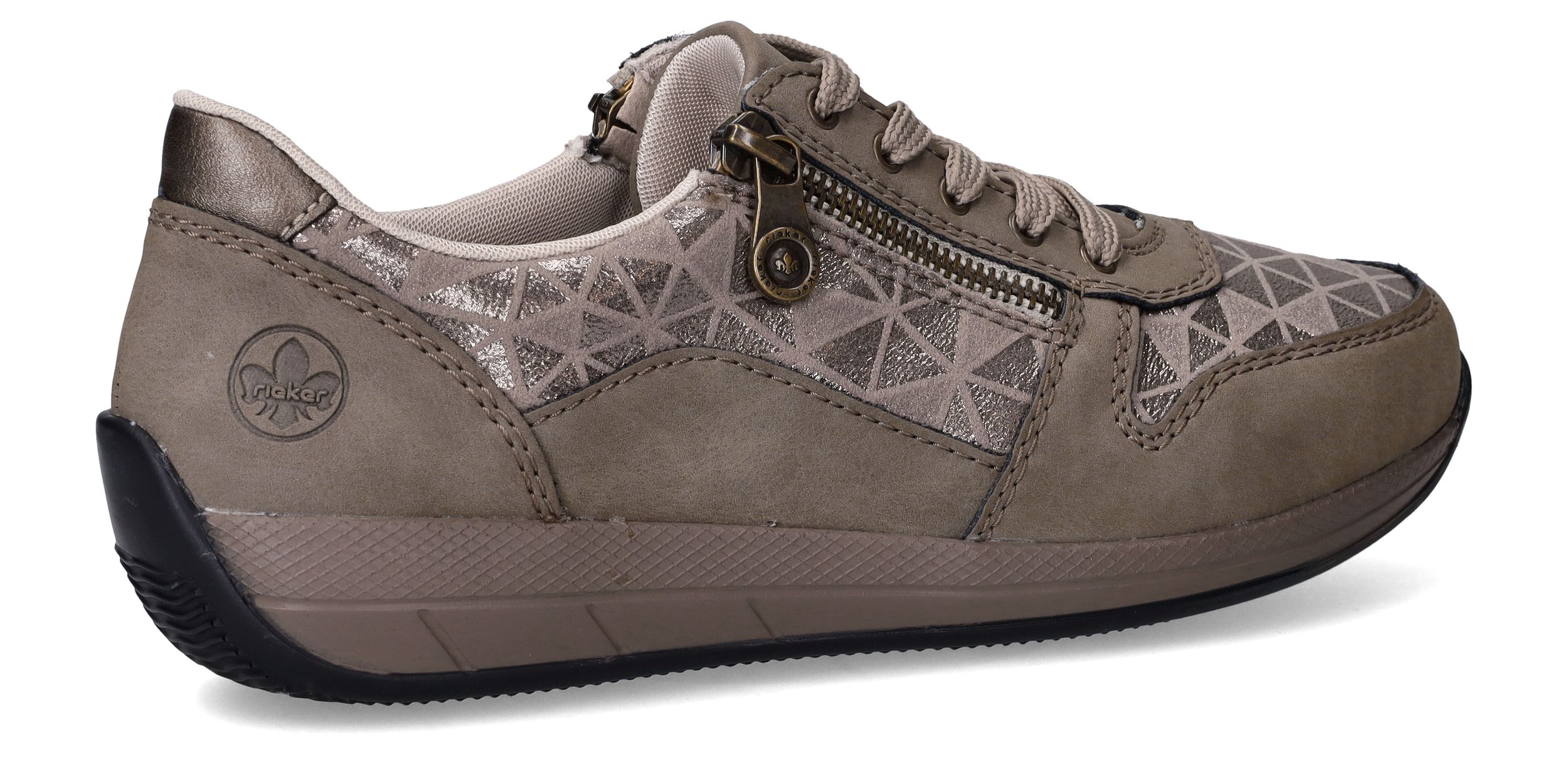 Deze taupekleurige sneakers van Rieker zijn een perfecte mix van comfort en opvallend design. De geometrische metallic print en de ritssluiting geven deze dames sneaker een speelse en moderne uitstraling. Dankzij de ruime pasvorm met voetbreedte H ervaar je extra bewegingsvrijheid en ondersteuning bij elke stap.