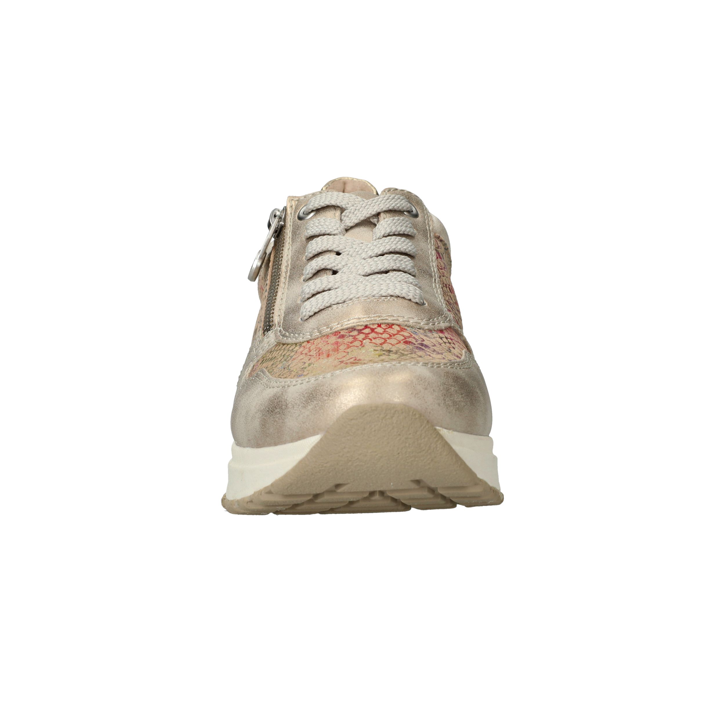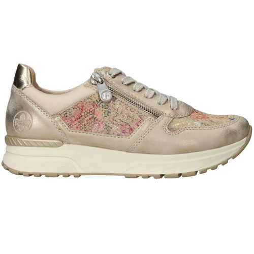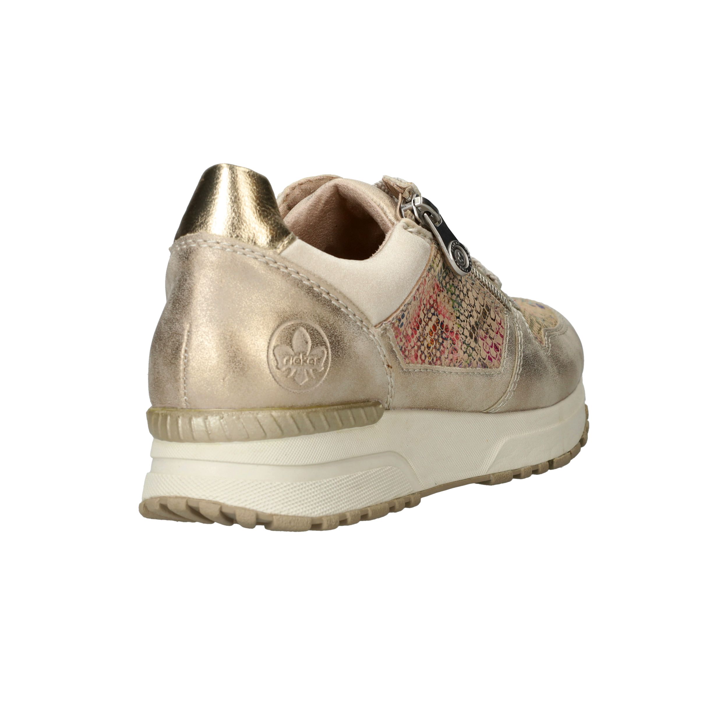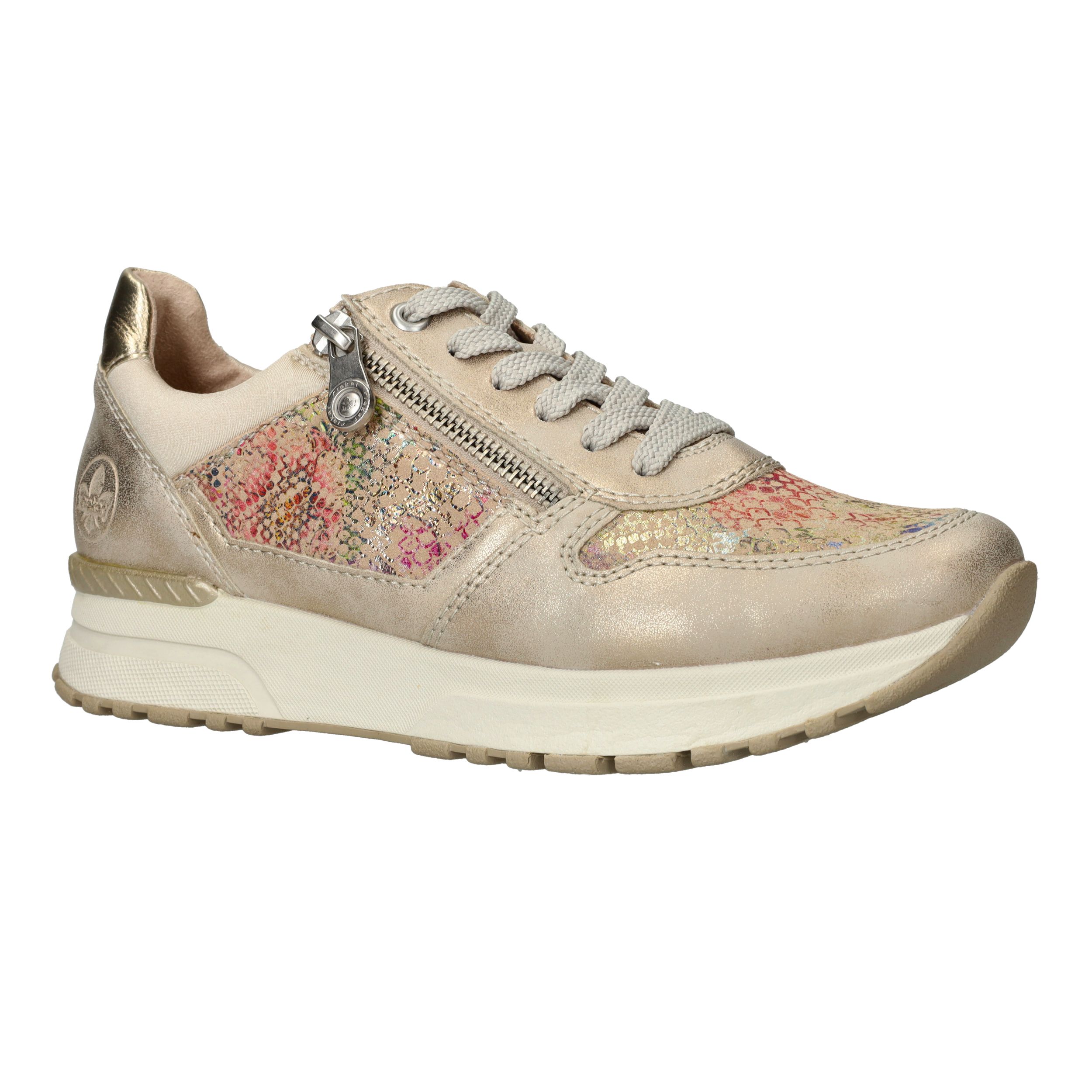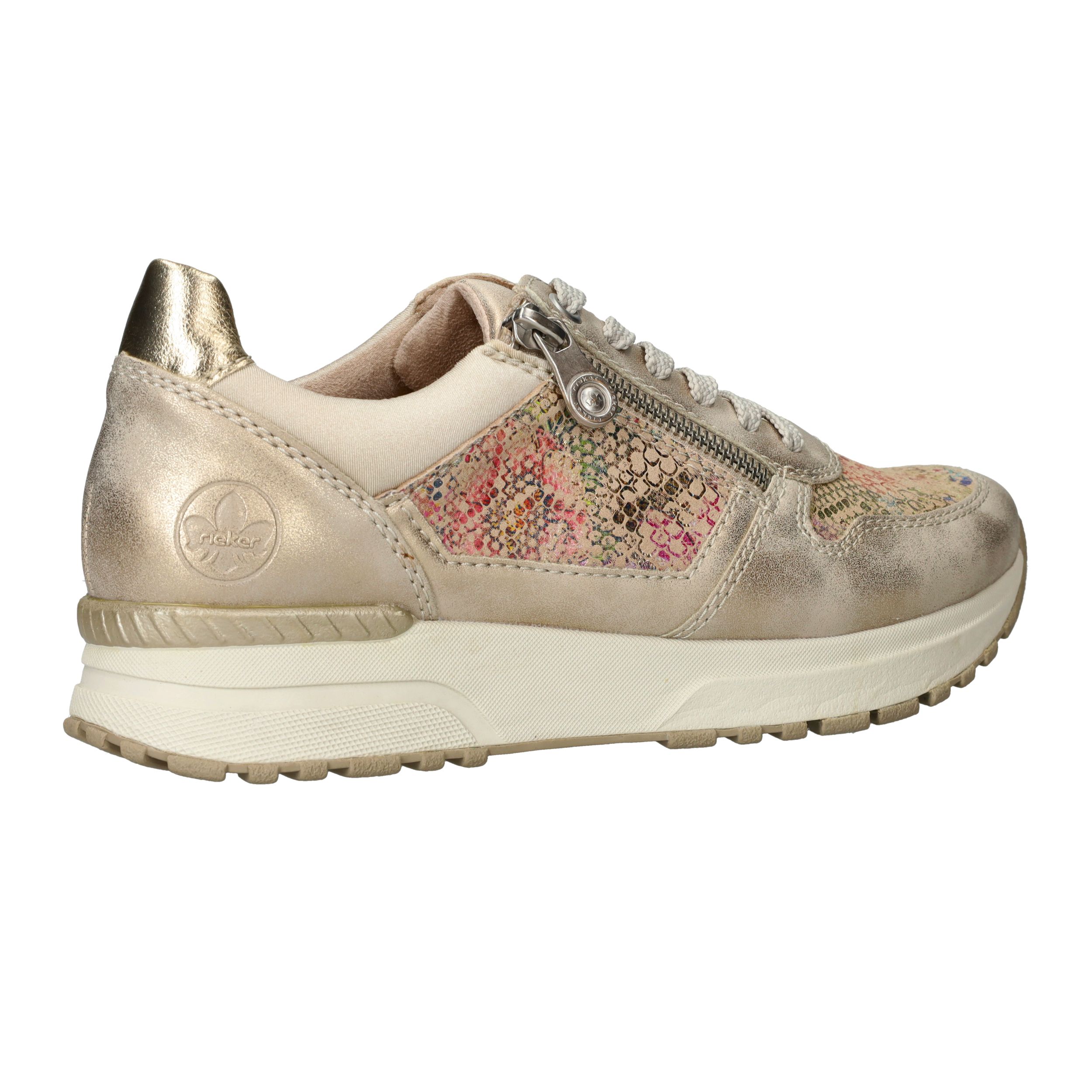 Straal met deze gouden Rieker sneaker met een gekleurde print. De damessneaker heeft een veter- en ritssluiting voor een makkelijke instap.