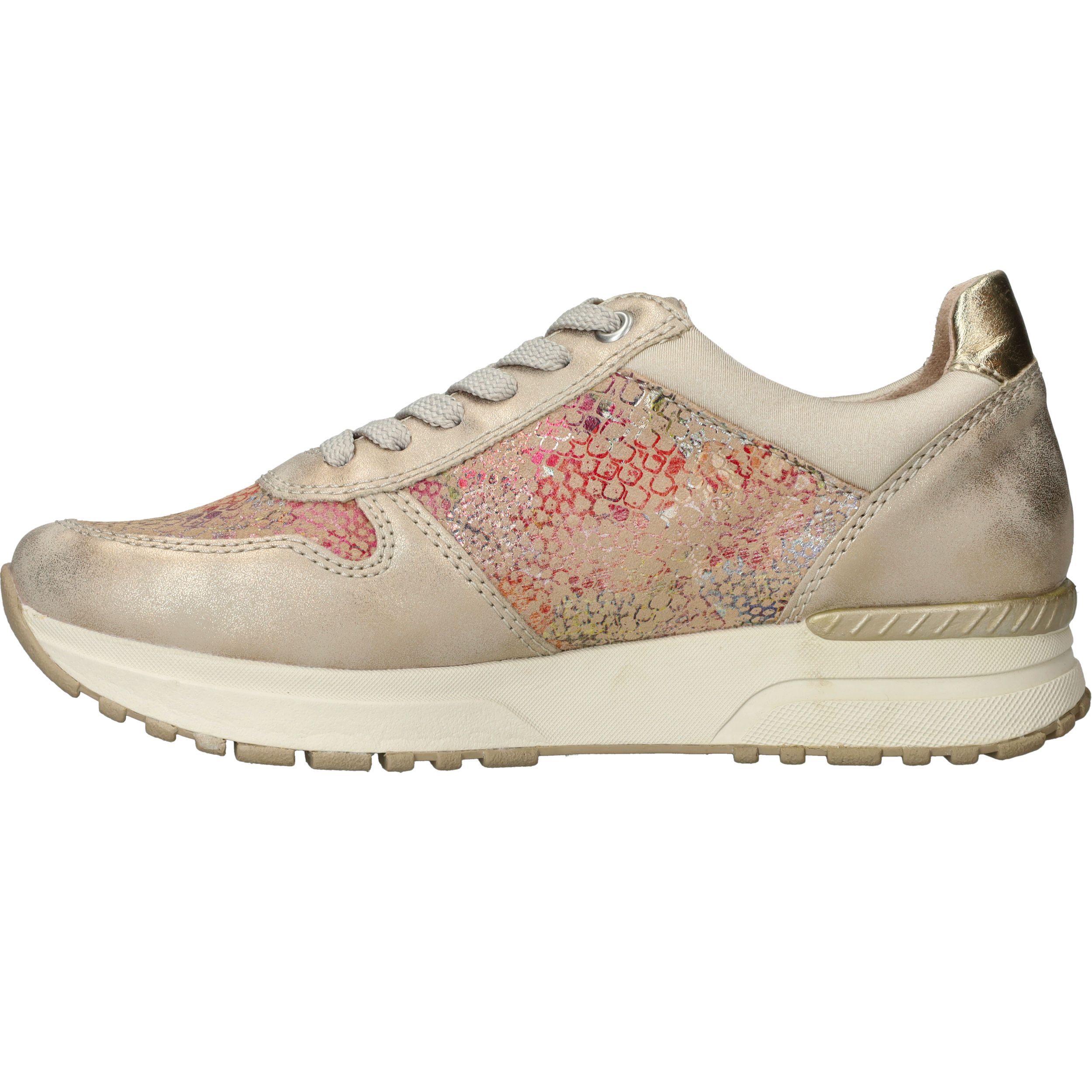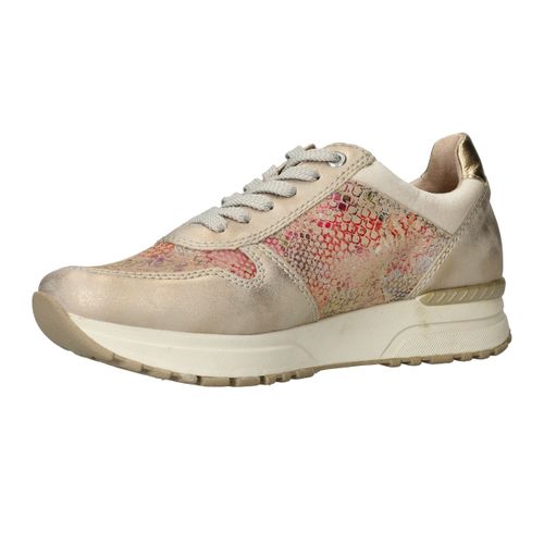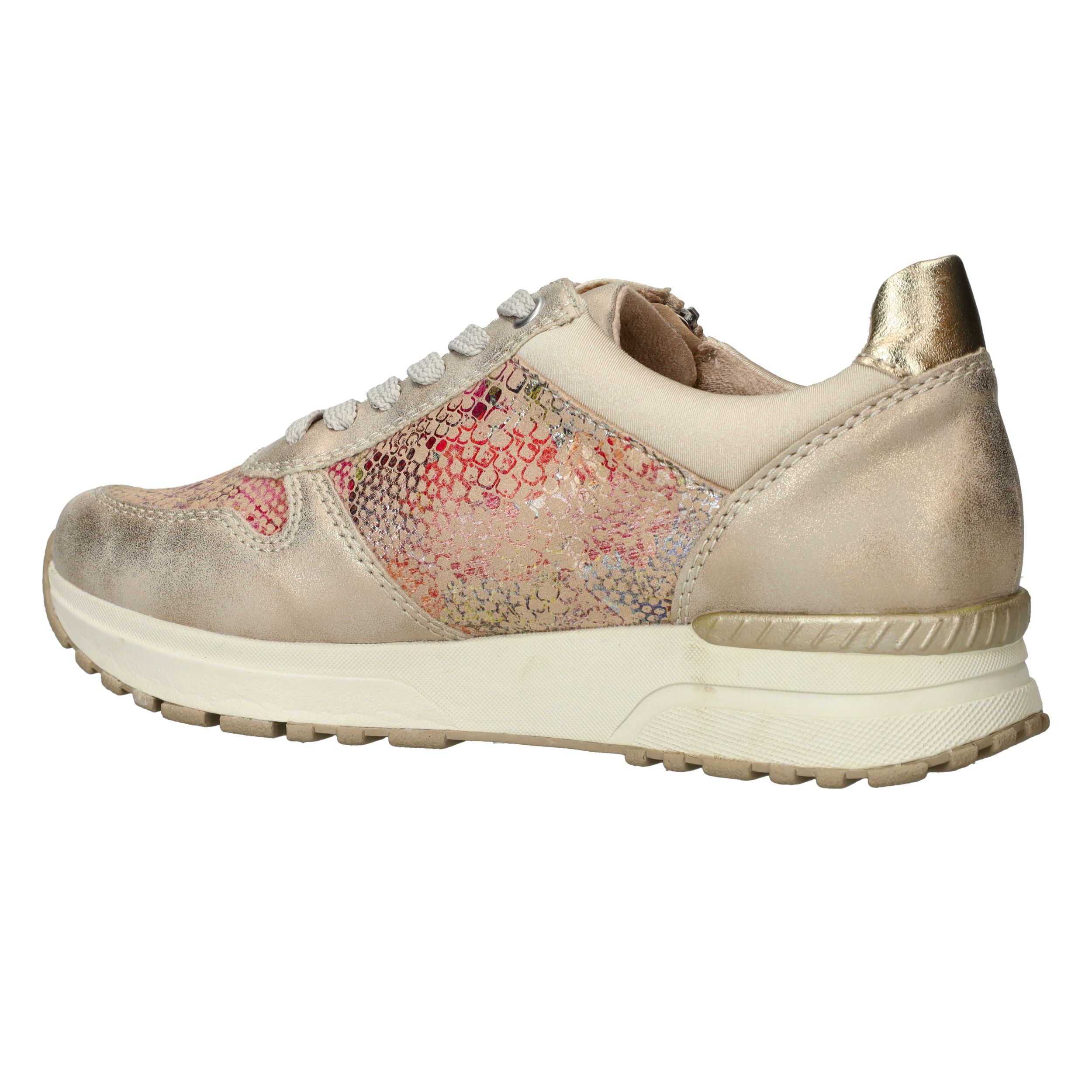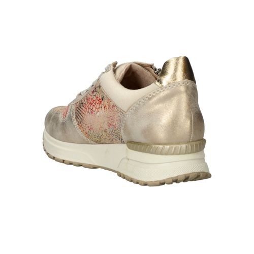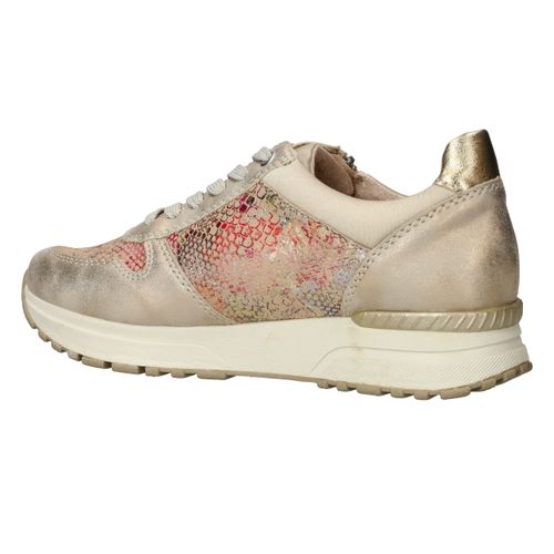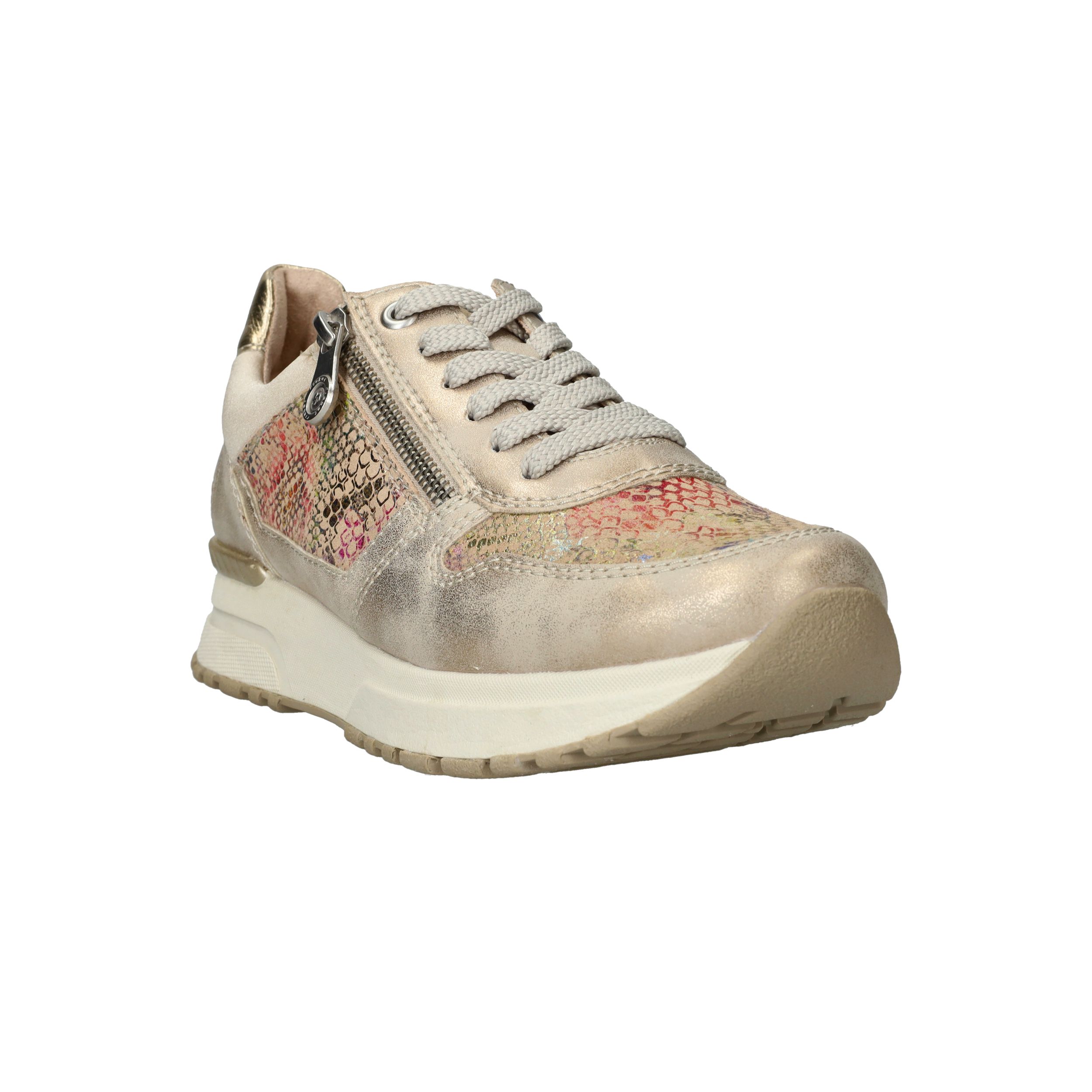 Straal met deze gouden Rieker sneaker met een gekleurde print. De damessneaker heeft een veter- en ritssluiting voor een makkelijke instap.