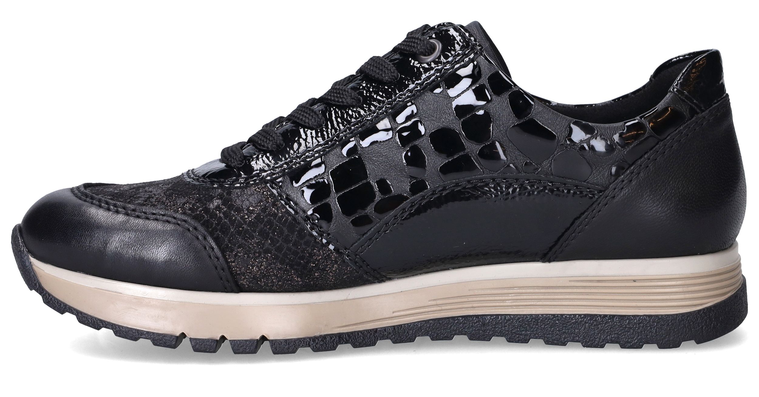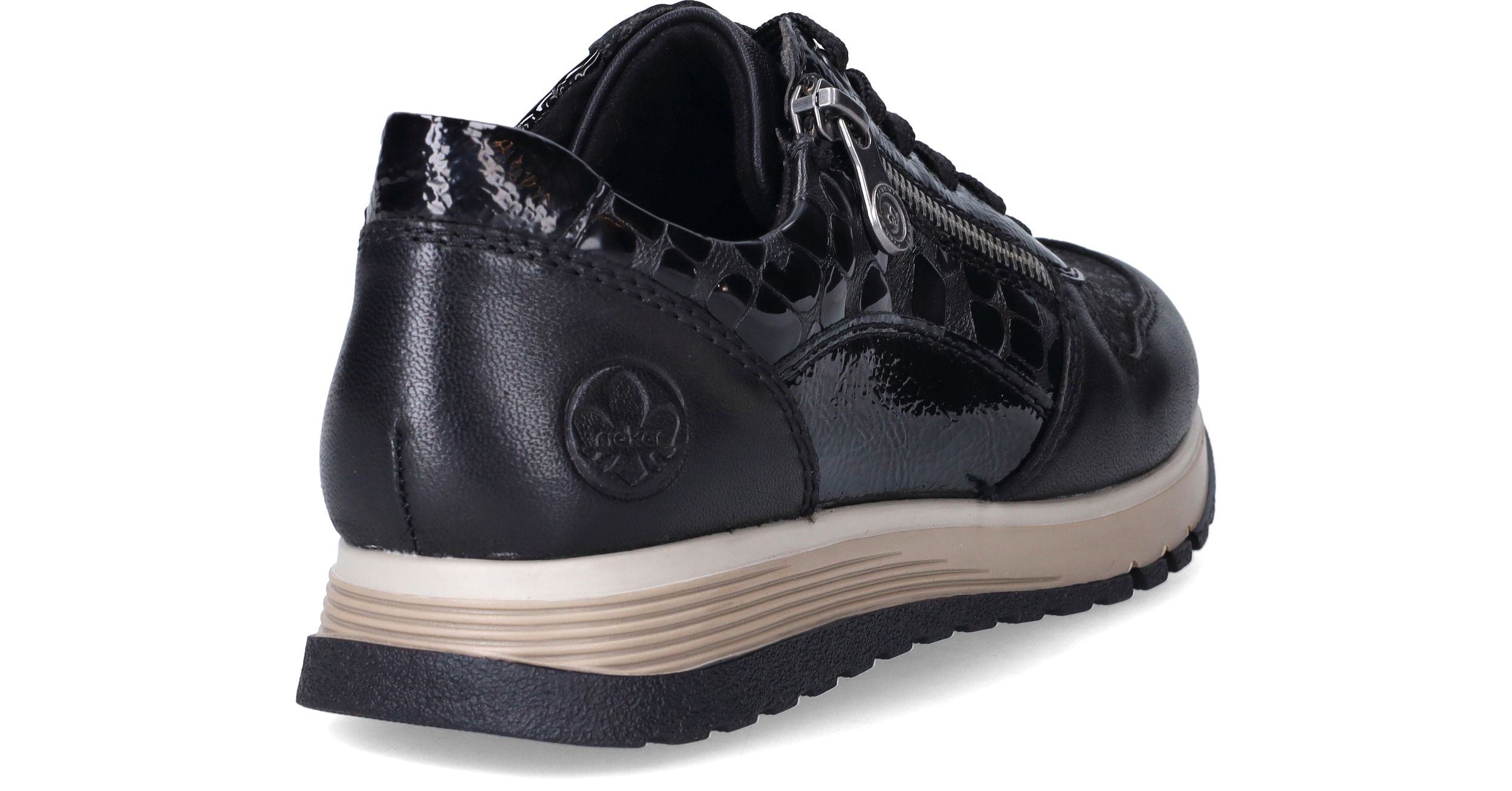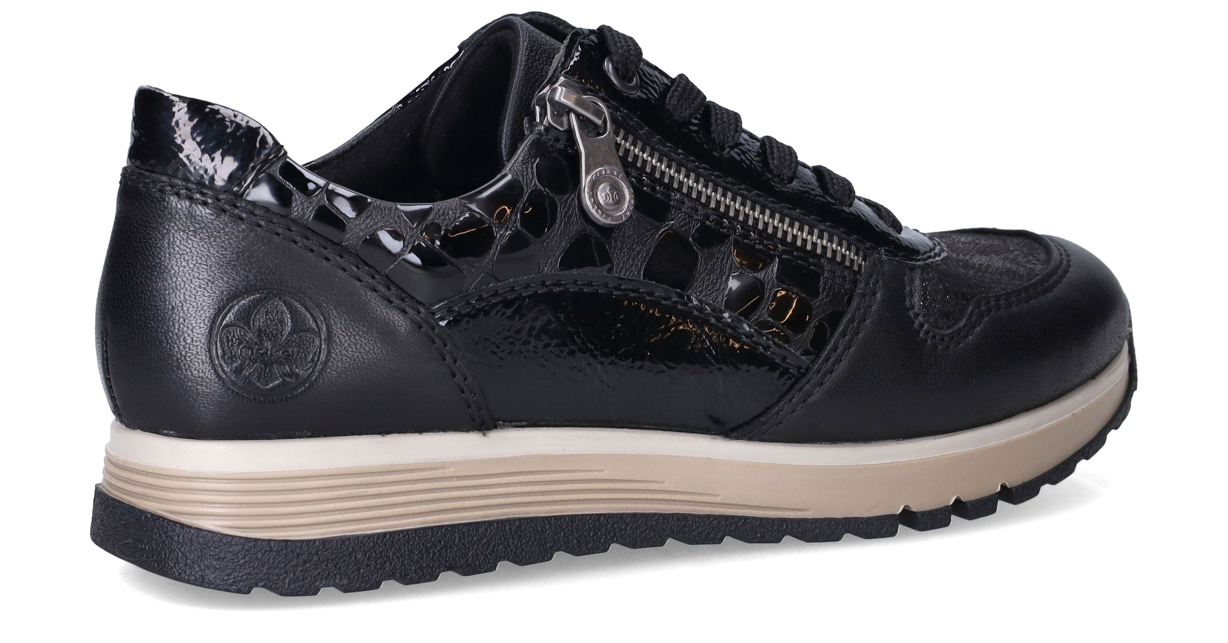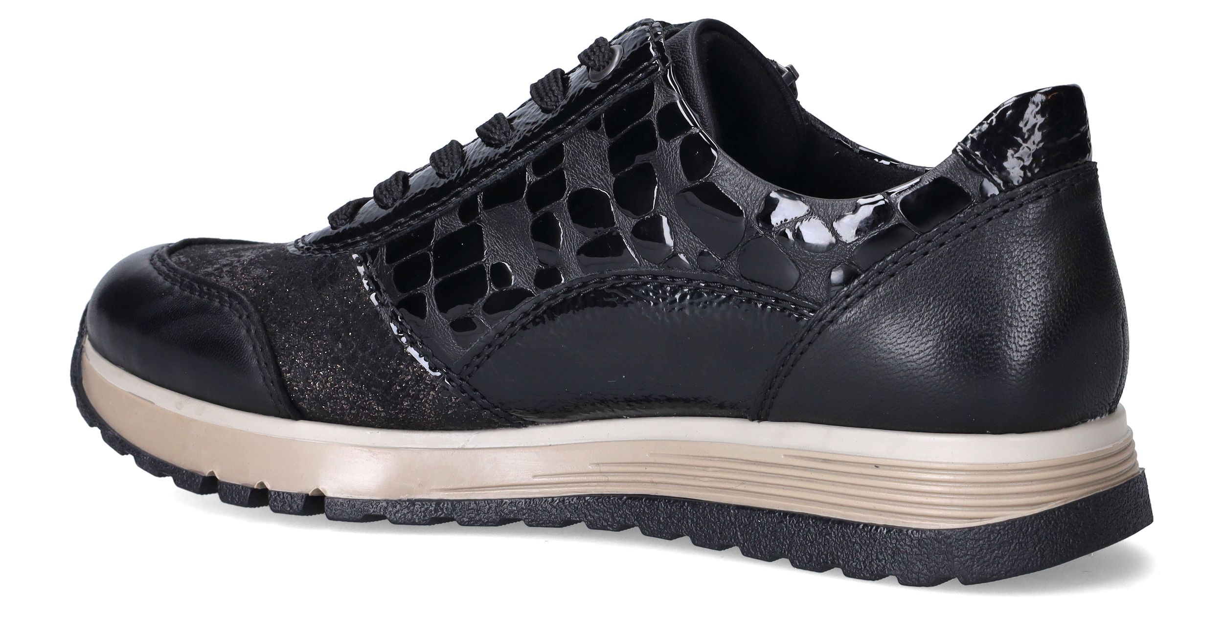 Stijl en comfort gaan perfect samen in deze zwarte sneakers van Rieker. Deze sportieve dames schoen is uitgevoerd in een combinatie van leer en kunstleer, wat zorgt voor een modieuze look met veel draaggemak. De mix van materialen, waaronder lakdetails en glansaccenten, geeft een speelse twist aan elke outfit: perfect voor wie houdt van een beetje flair zonder in te leveren op comfort.