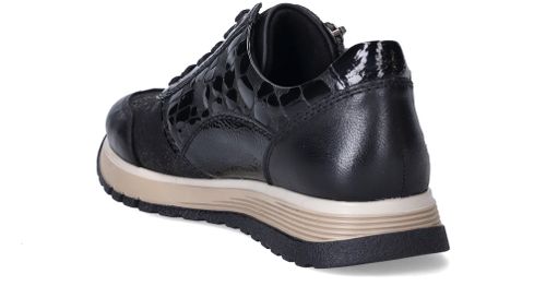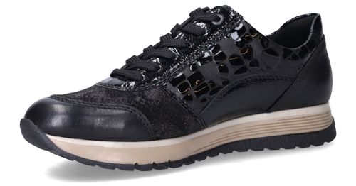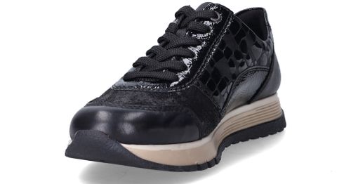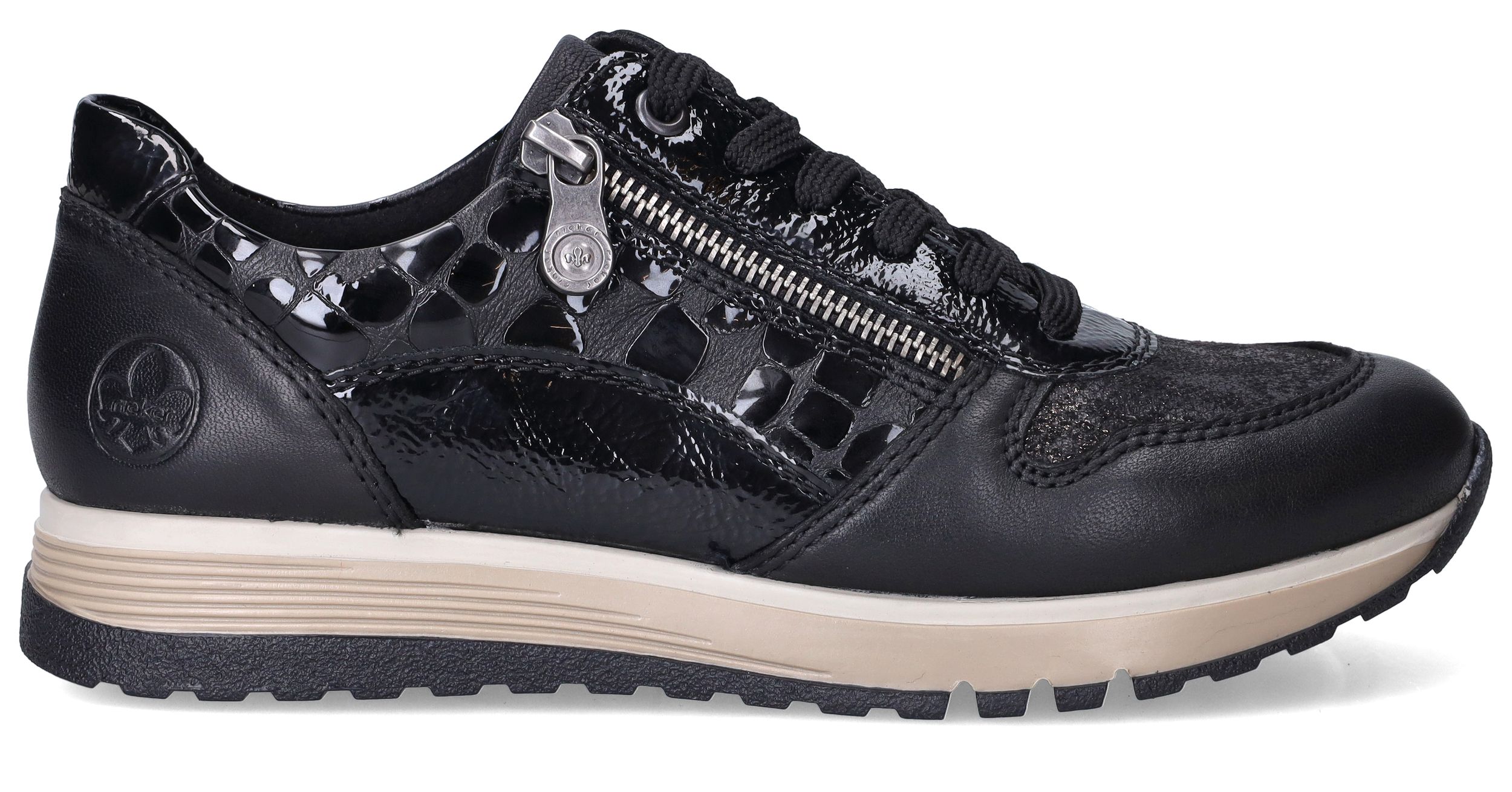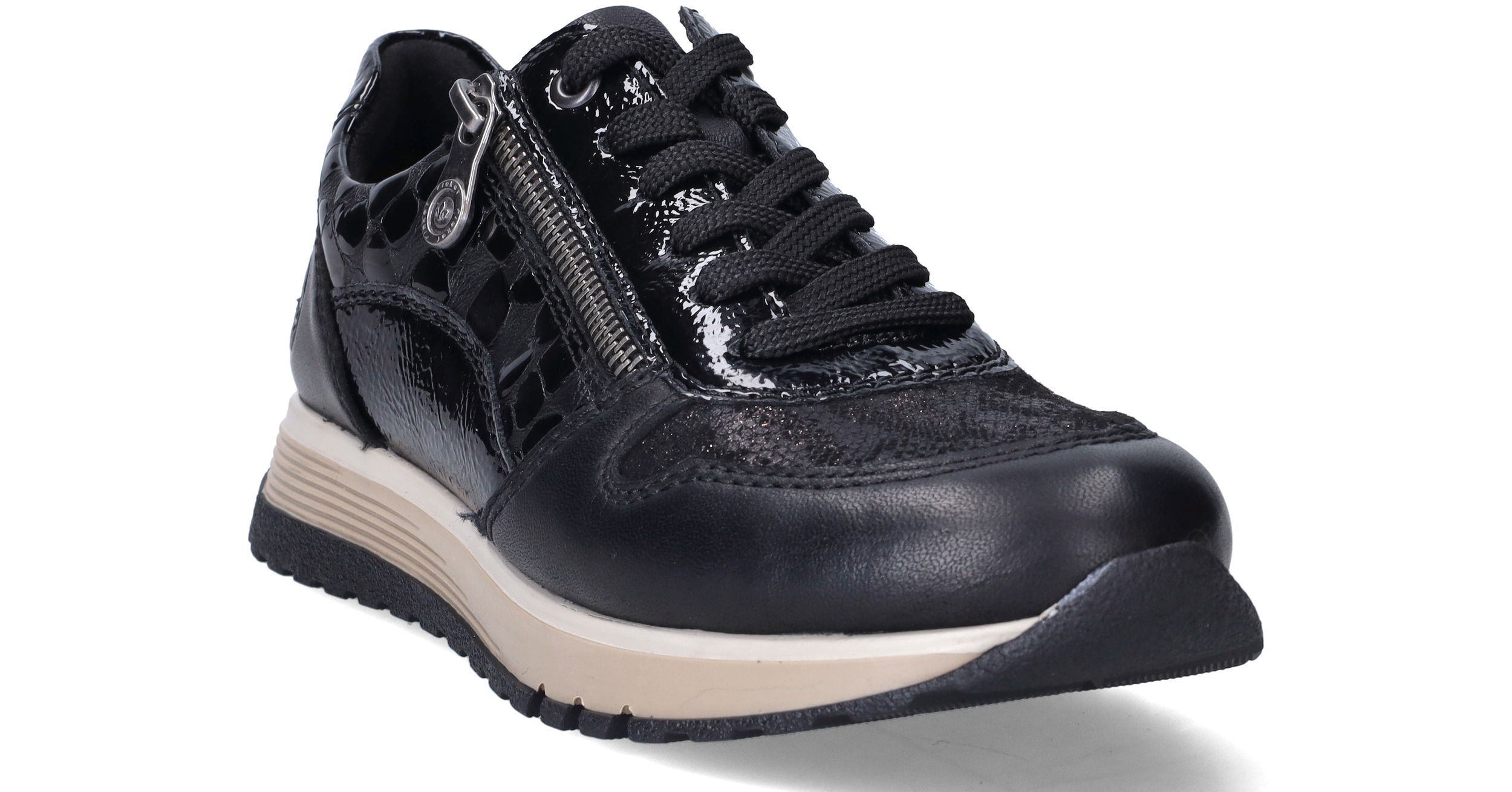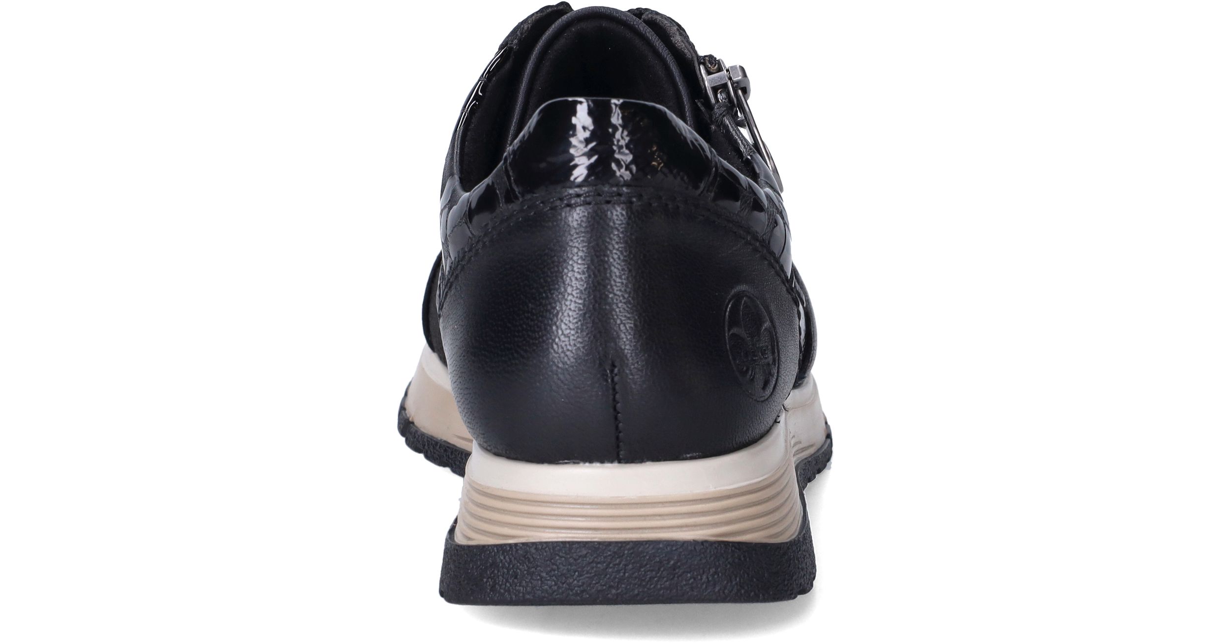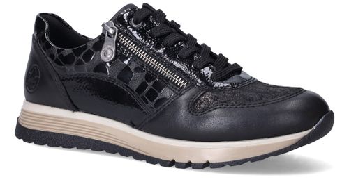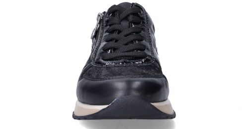 Stijl en comfort gaan perfect samen in deze zwarte sneakers van Rieker. Deze sportieve dames schoen is uitgevoerd in een combinatie van leer en kunstleer, wat zorgt voor een modieuze look met veel draaggemak. De mix van materialen, waaronder lakdetails en glansaccenten, geeft een speelse twist aan elke outfit: perfect voor wie houdt van een beetje flair zonder in te leveren op comfort.