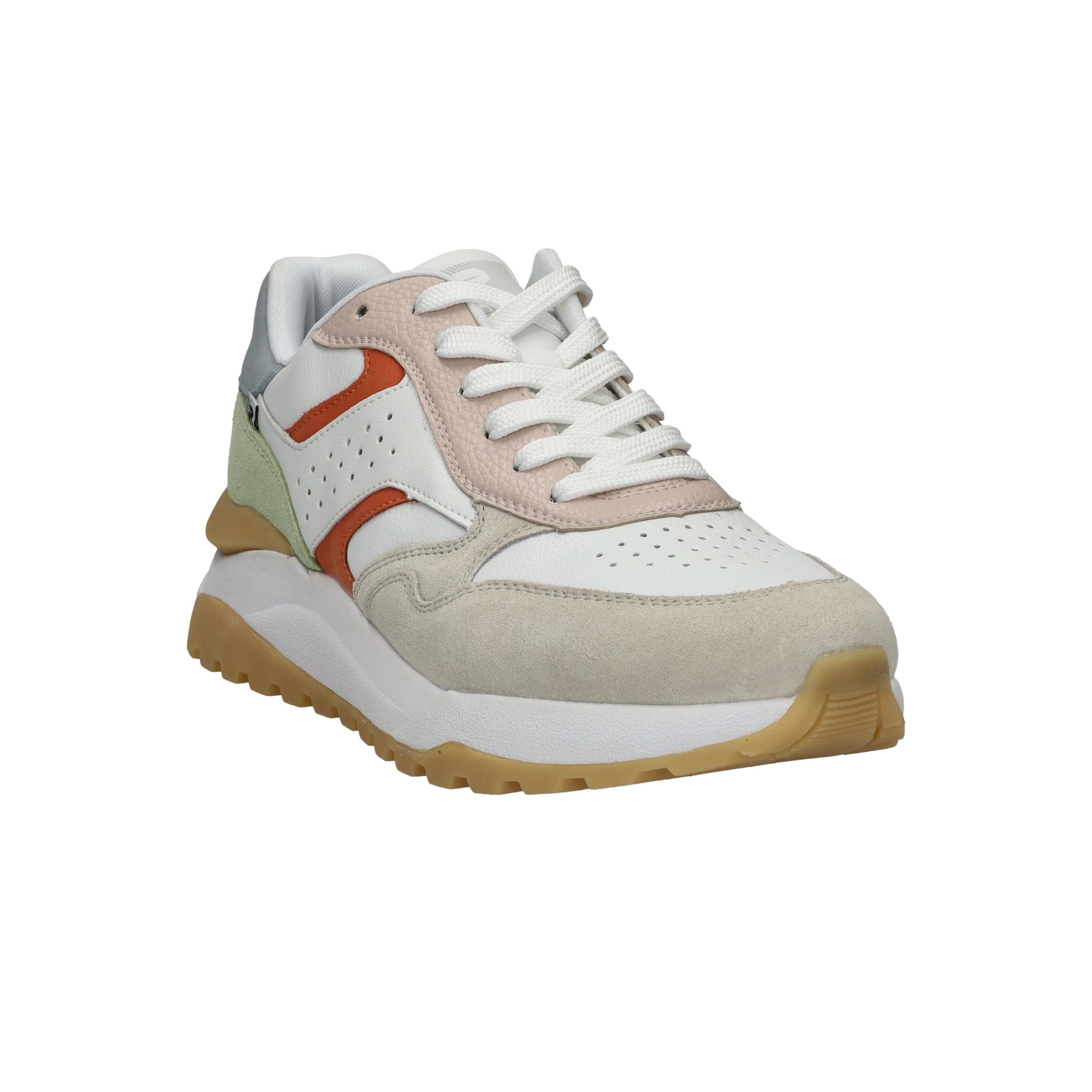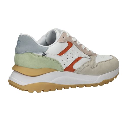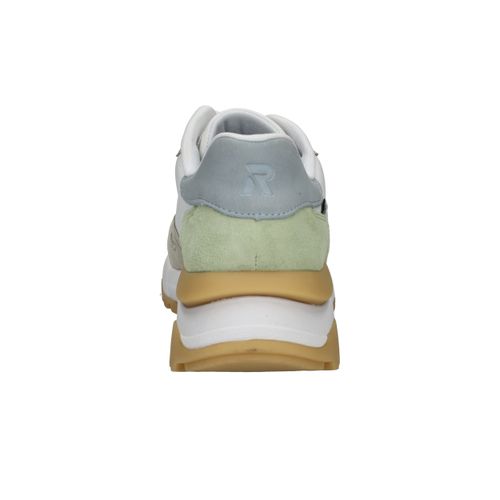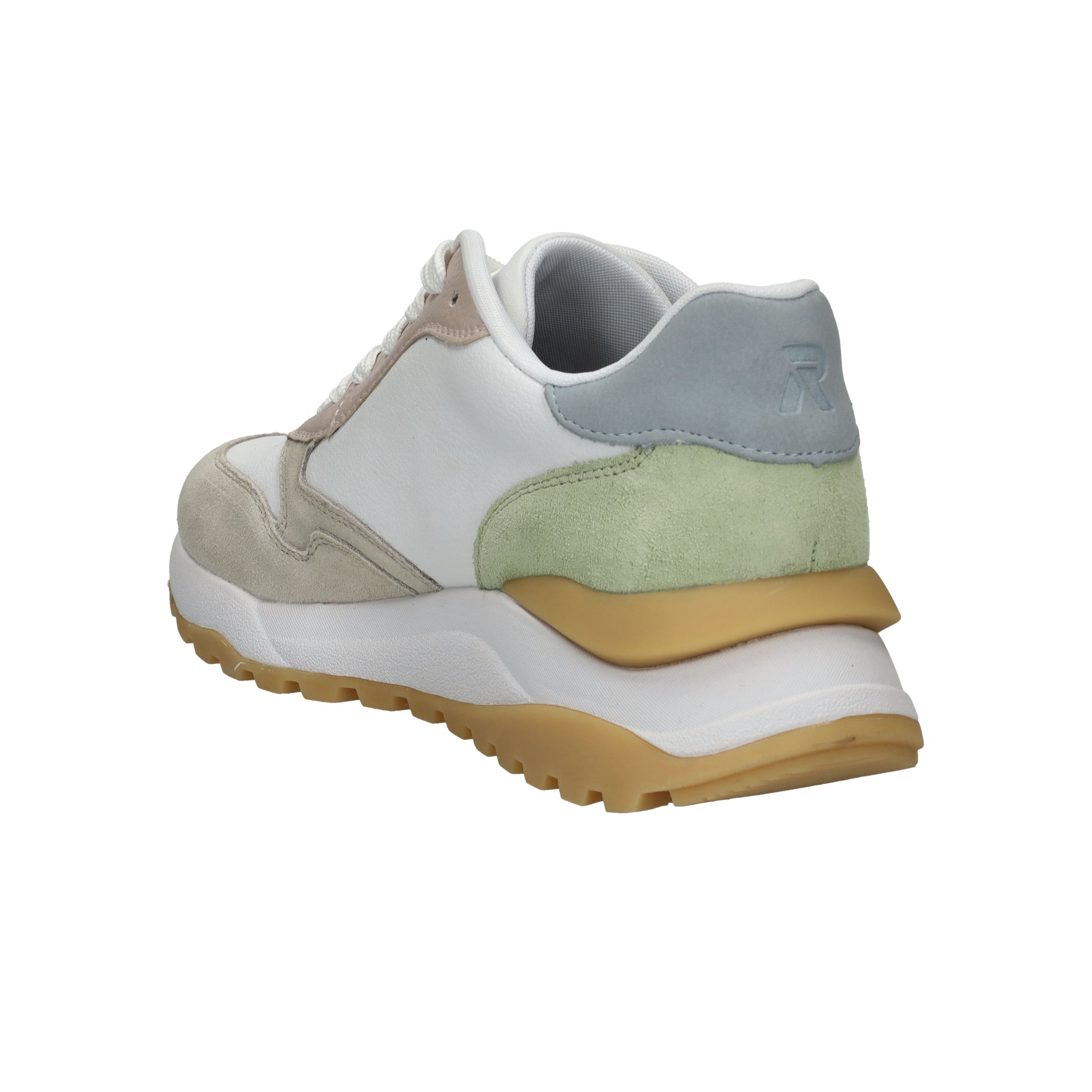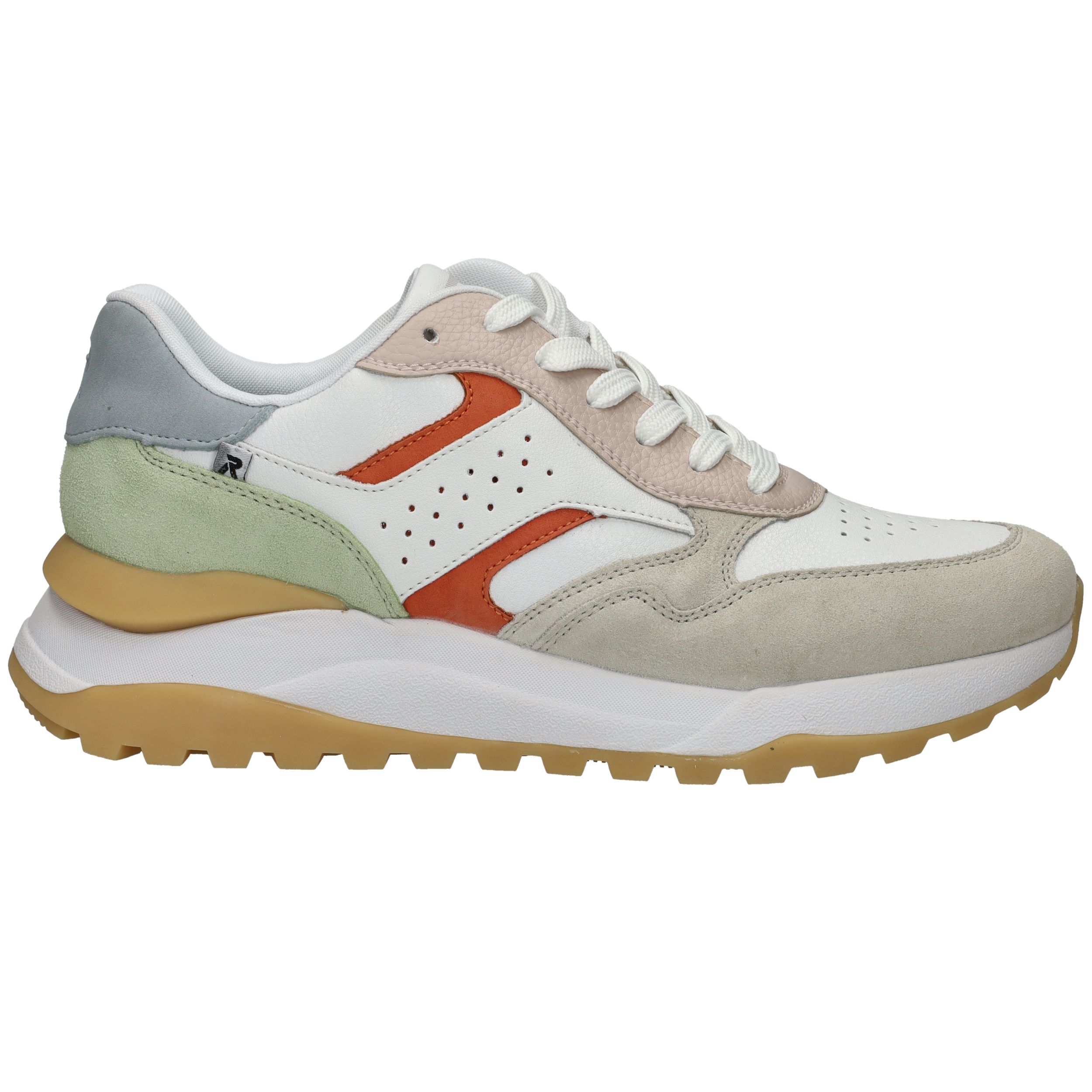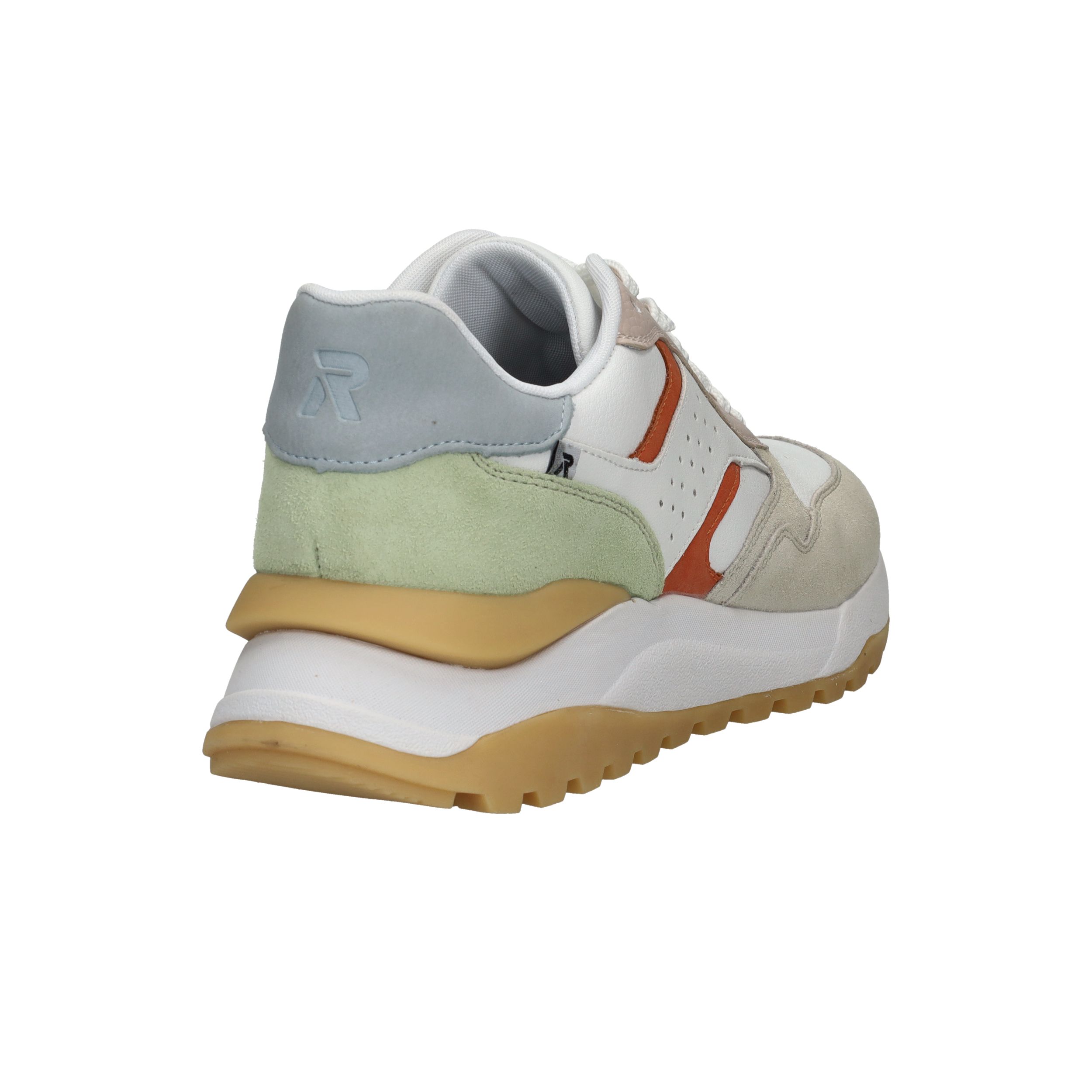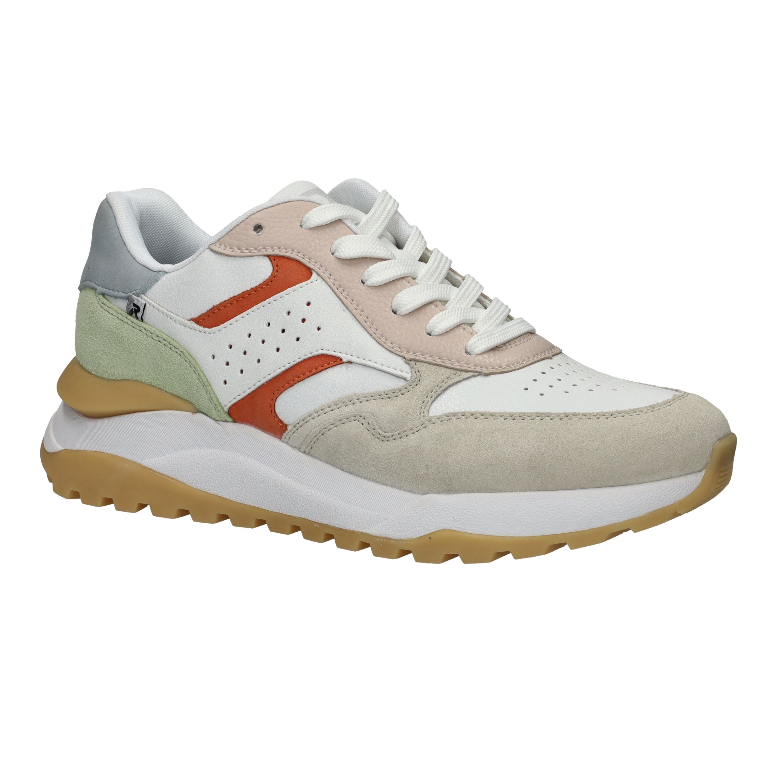 Trendy Rieker sneaker voor dames in het wit met vrolijke kleuren. Ga je voor kleur? Gebruik dan de bijgeleverde zalmroze veter.