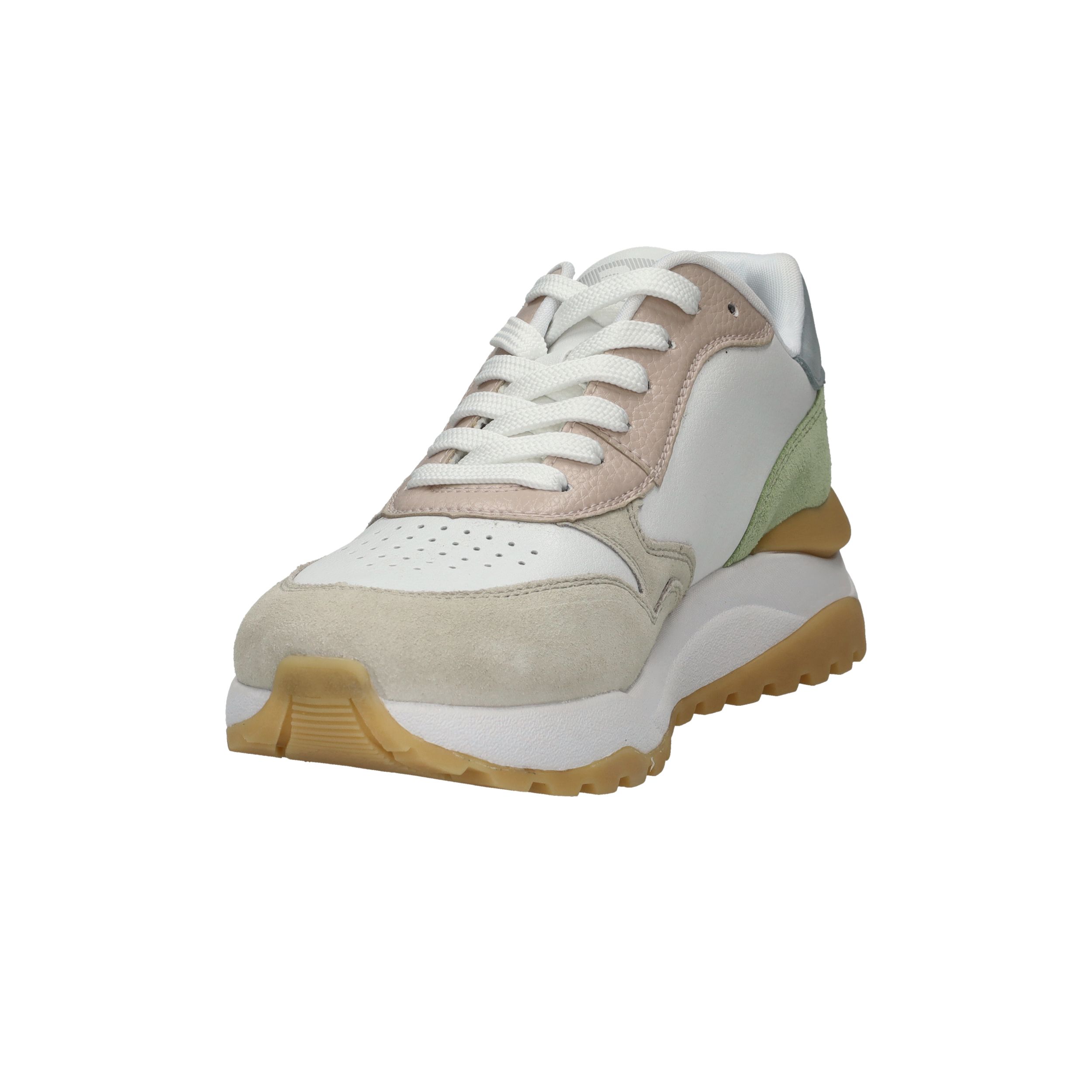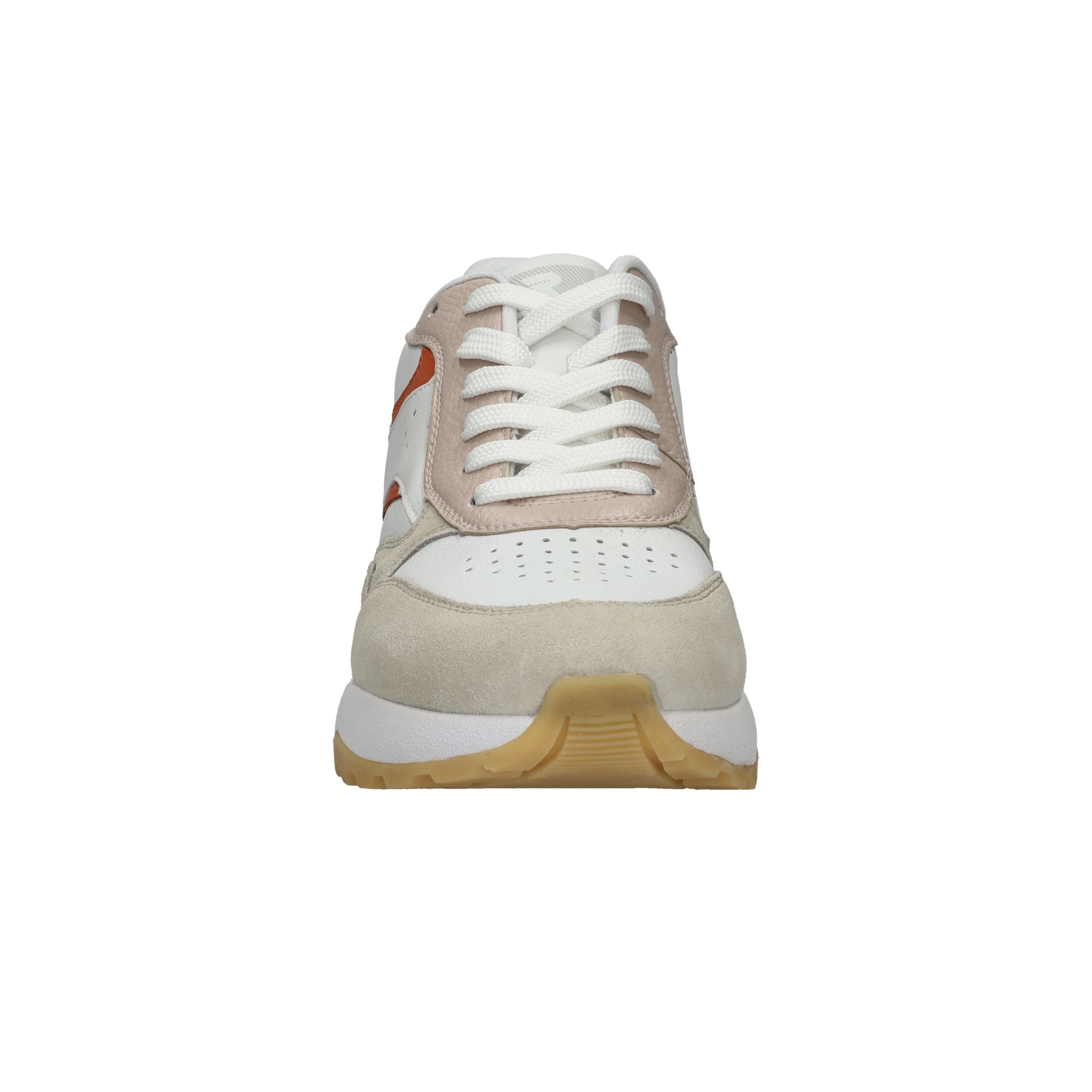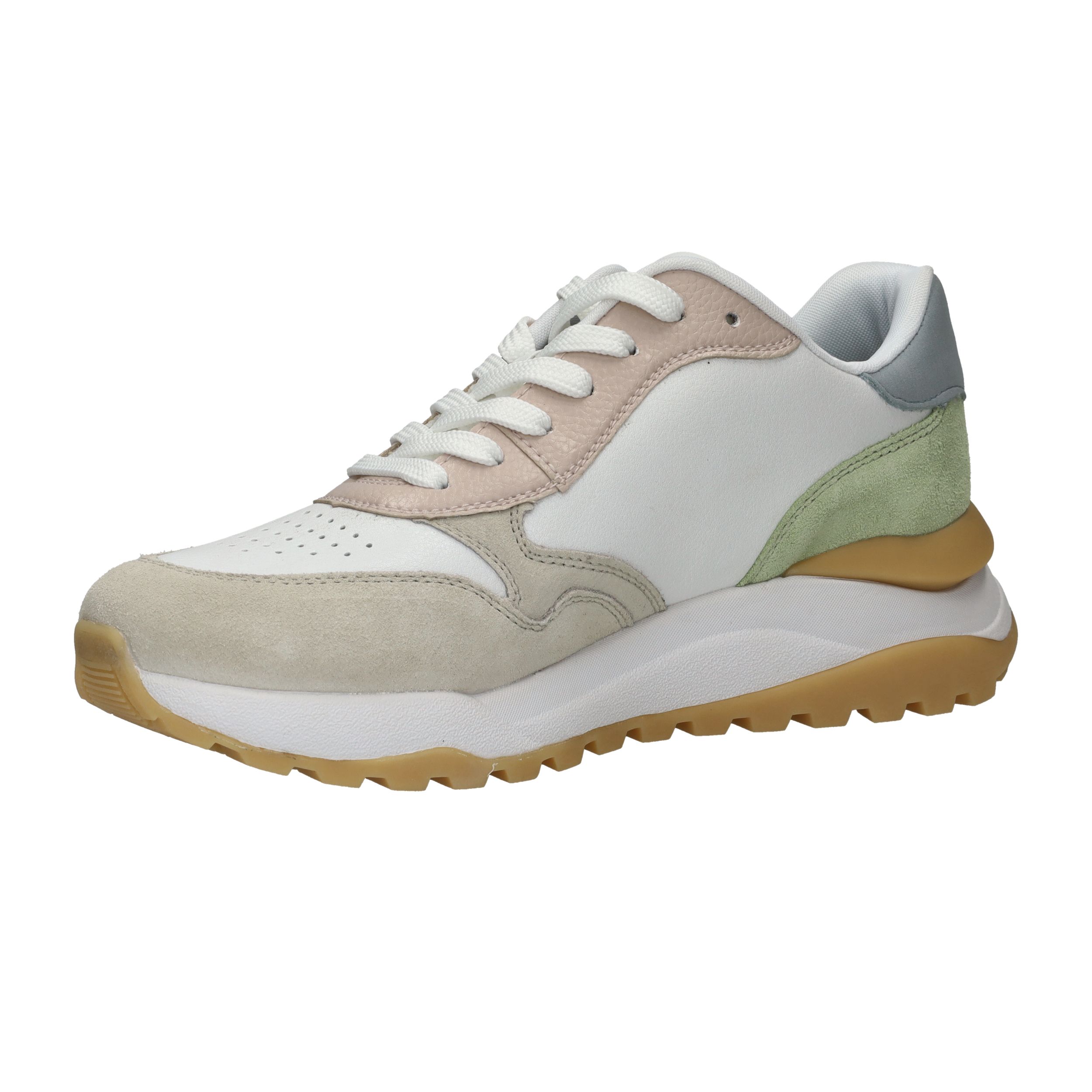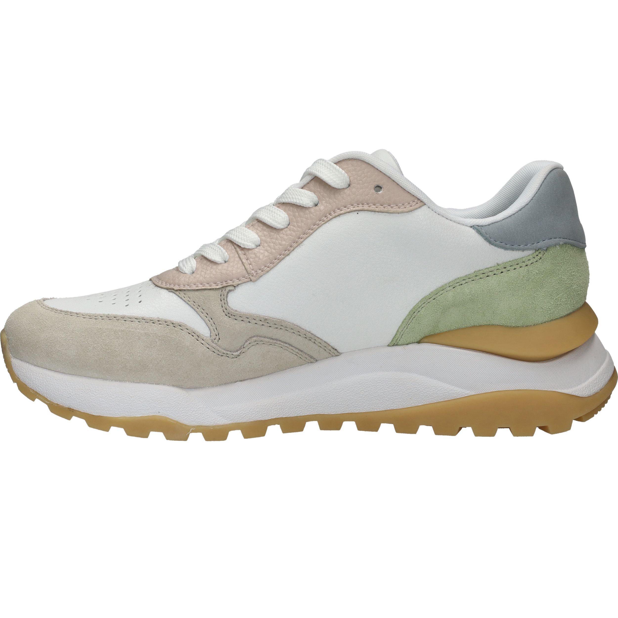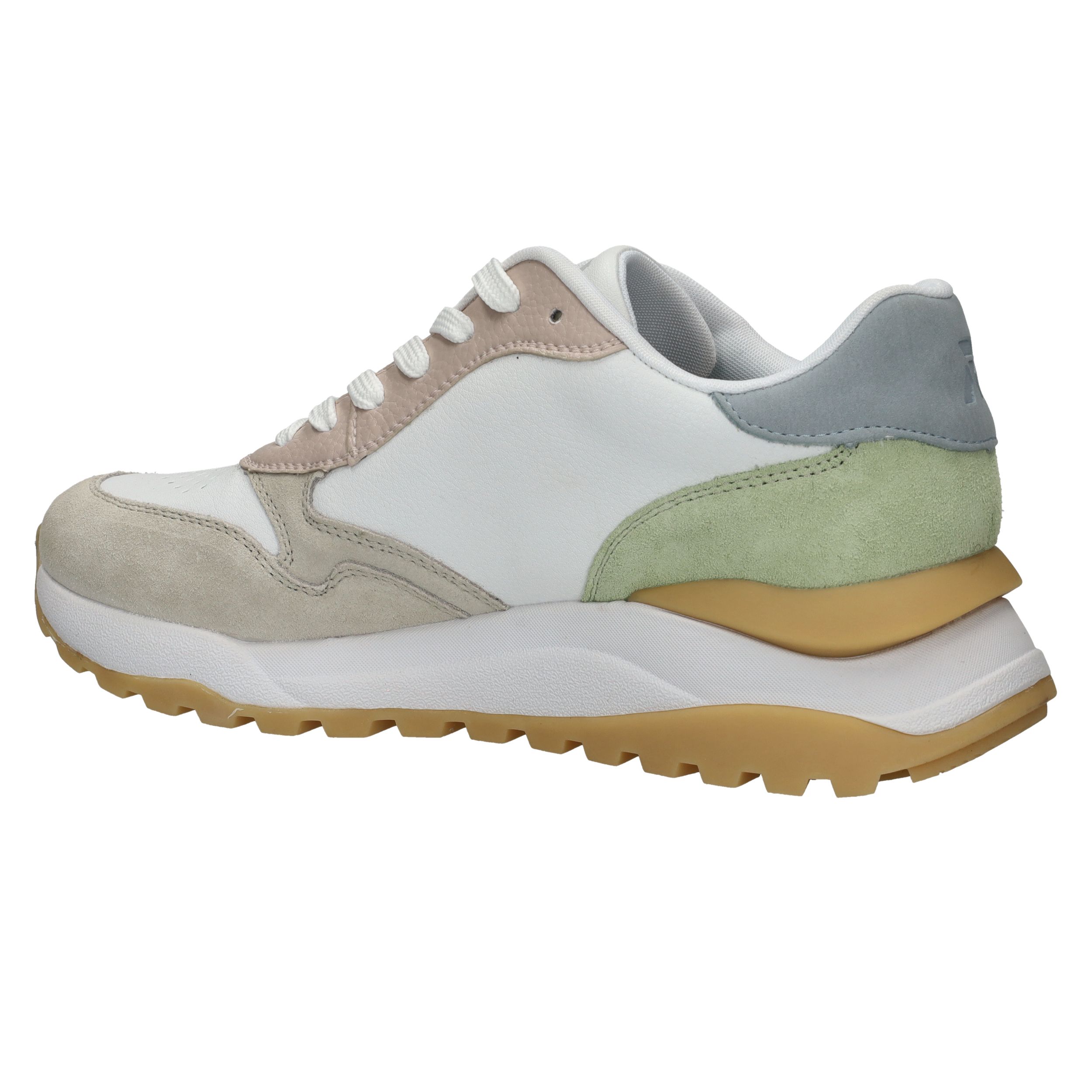 Trendy Rieker sneaker voor dames in het wit met vrolijke kleuren. Ga je voor kleur? Gebruik dan de bijgeleverde zalmroze veter.