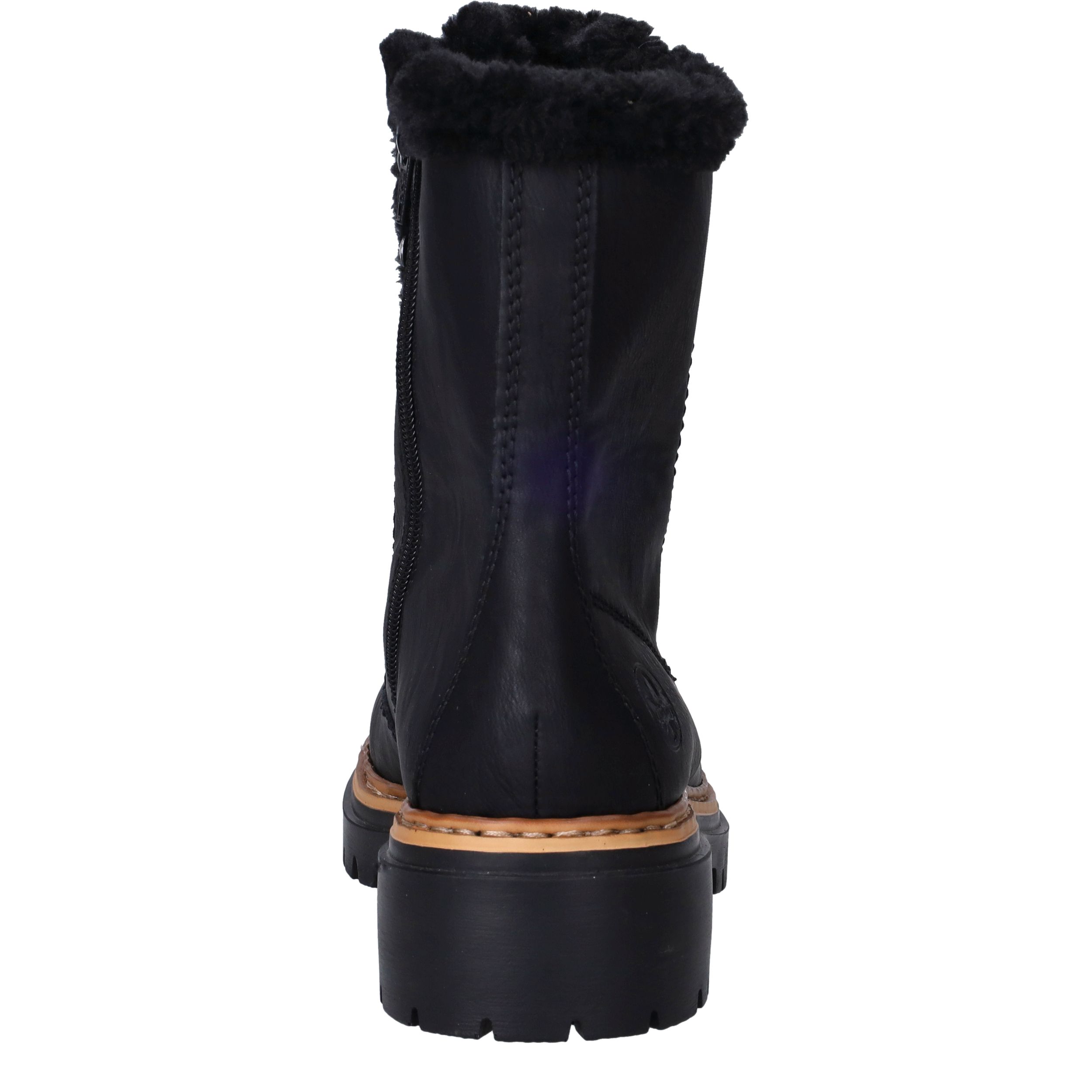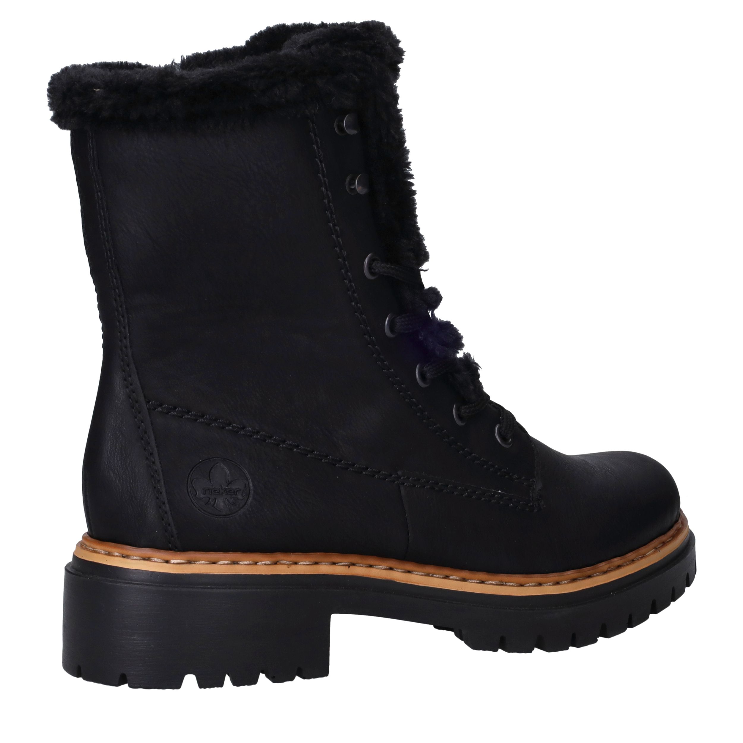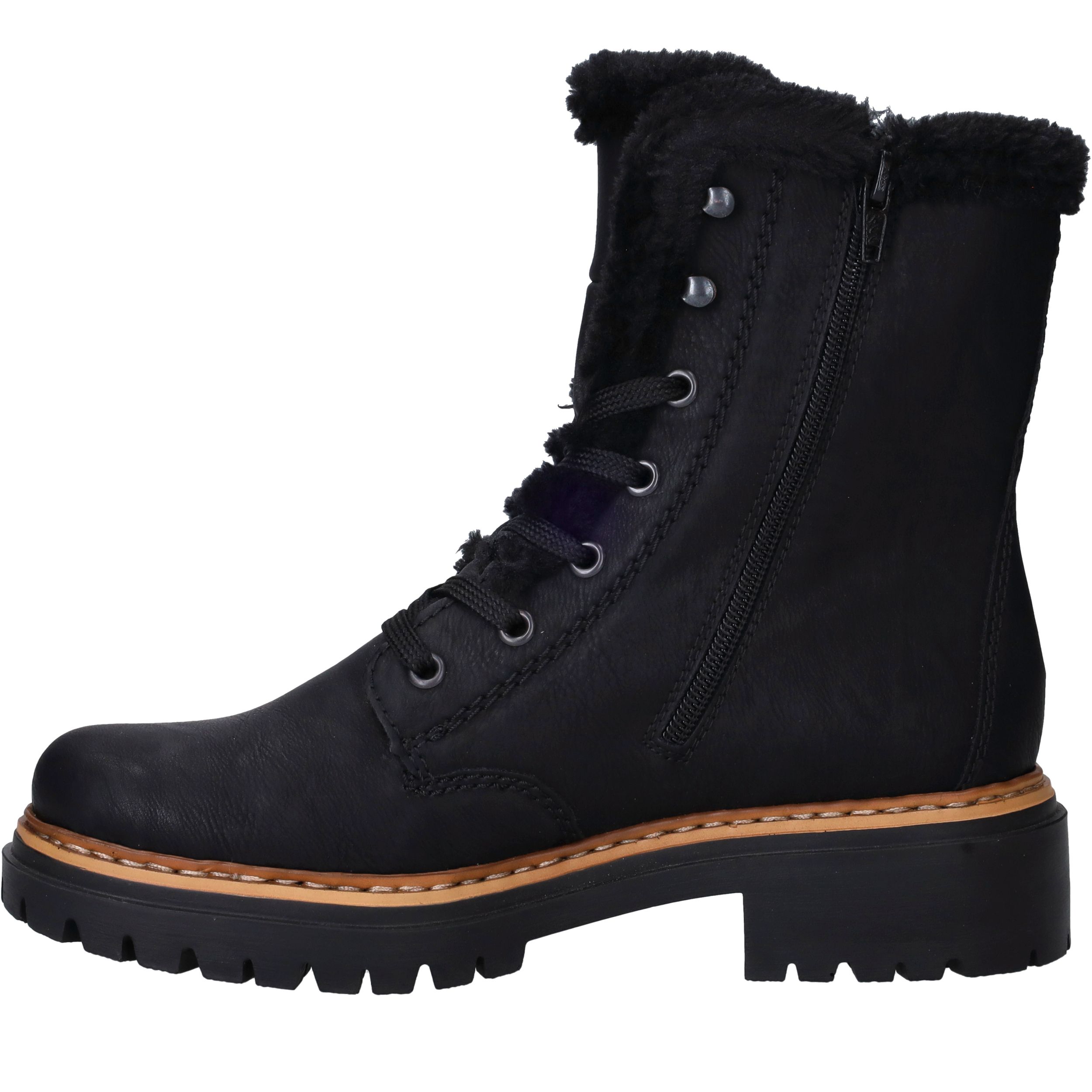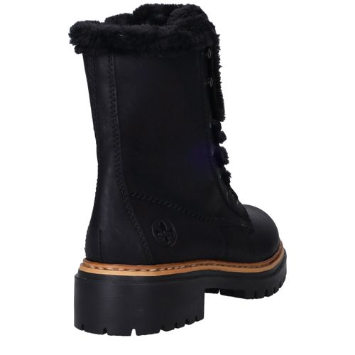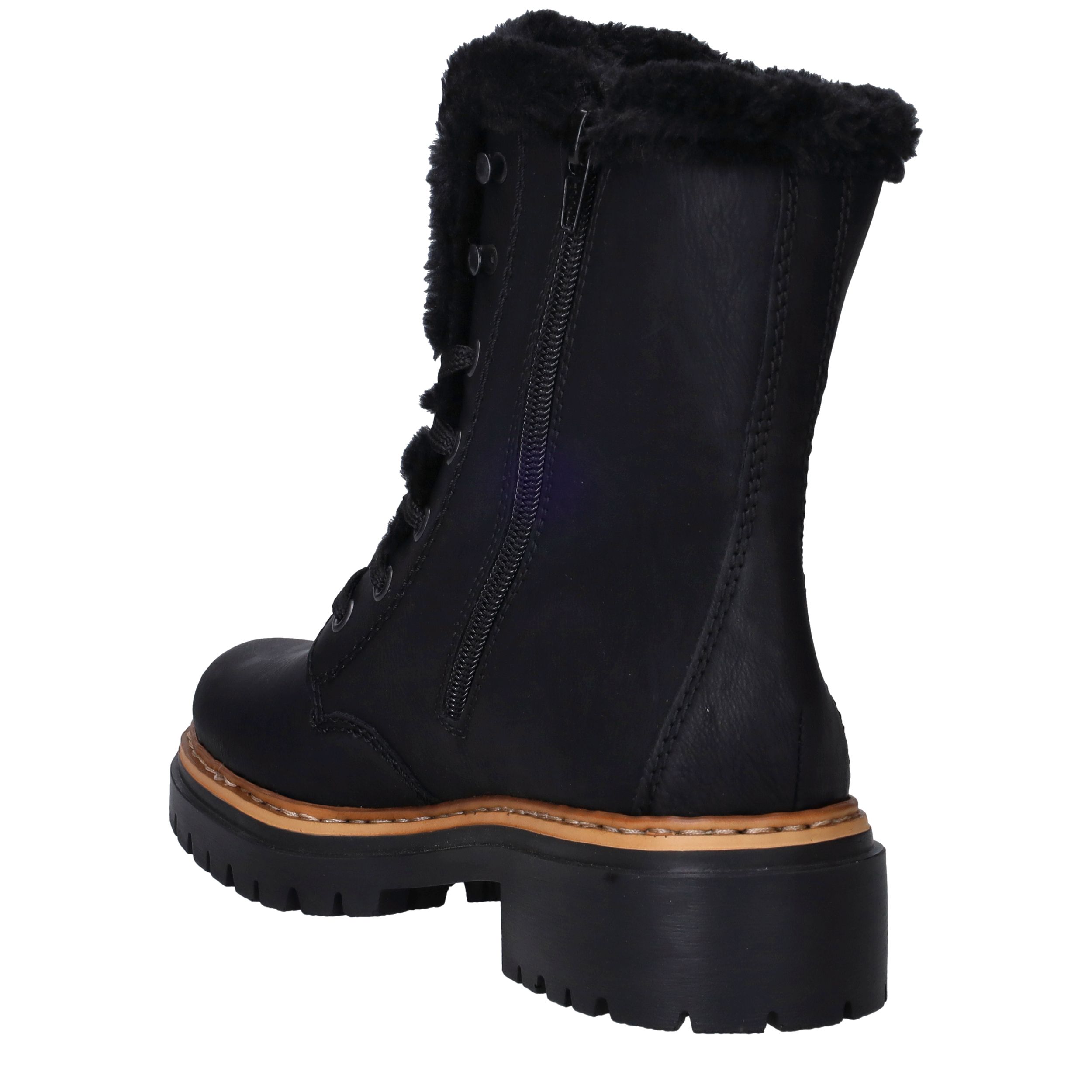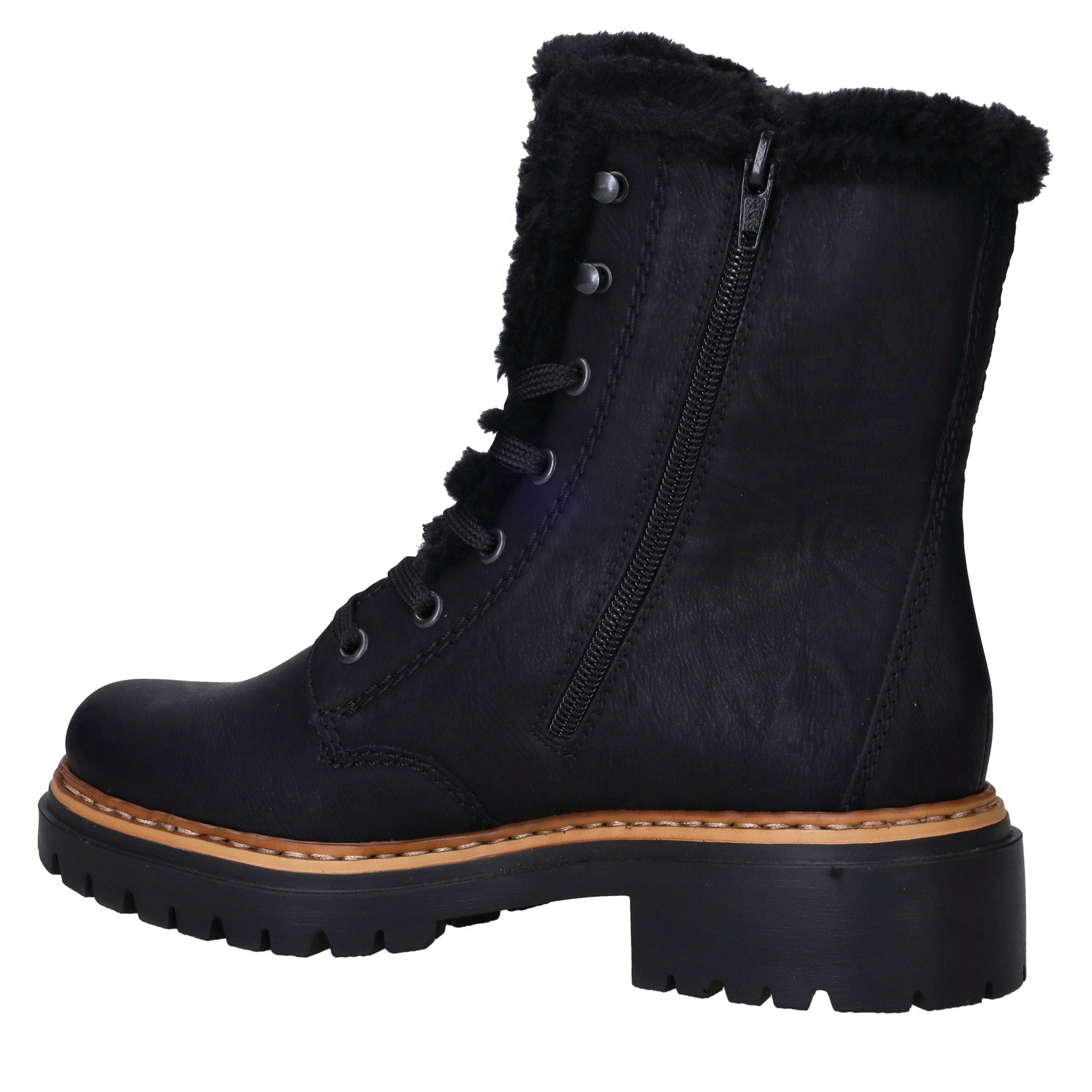 Deze zwarte Rieker veterboots combineren robuuste uitstraling met heerlijk comfort. Dankzij het warme gevoerde binnenwerk blijven je voeten aangenaam warm tijdens koude dagen. Het kunstleer aan de buitenzijde geeft de veterboots een stoere look die makkelijk te combineren is met elke winteroutfit. De combinatie van vetersluiting én rits zorgt voor zowel stijl als gebruiksgemak.