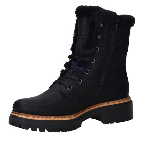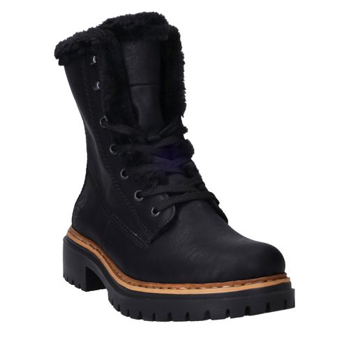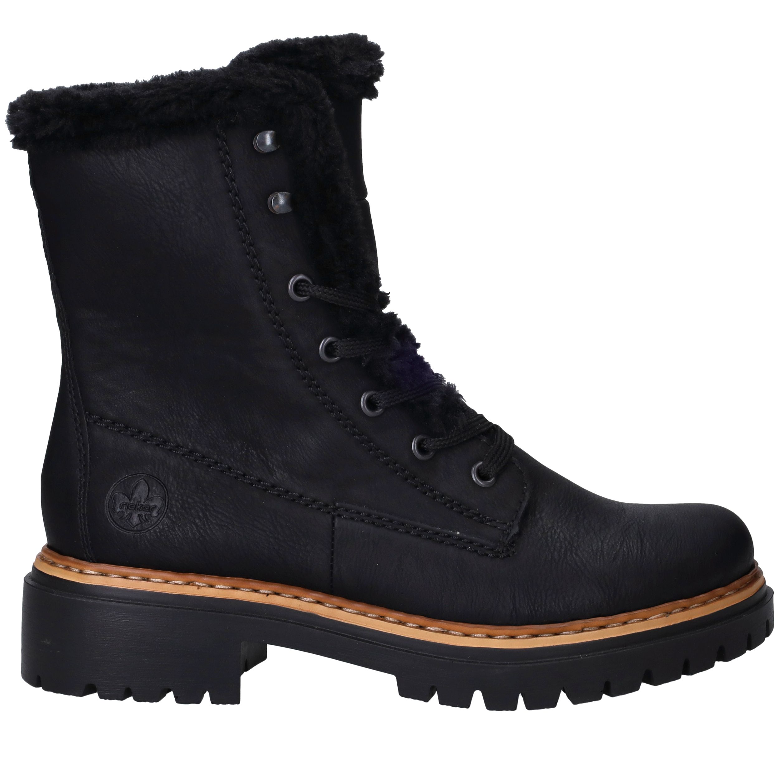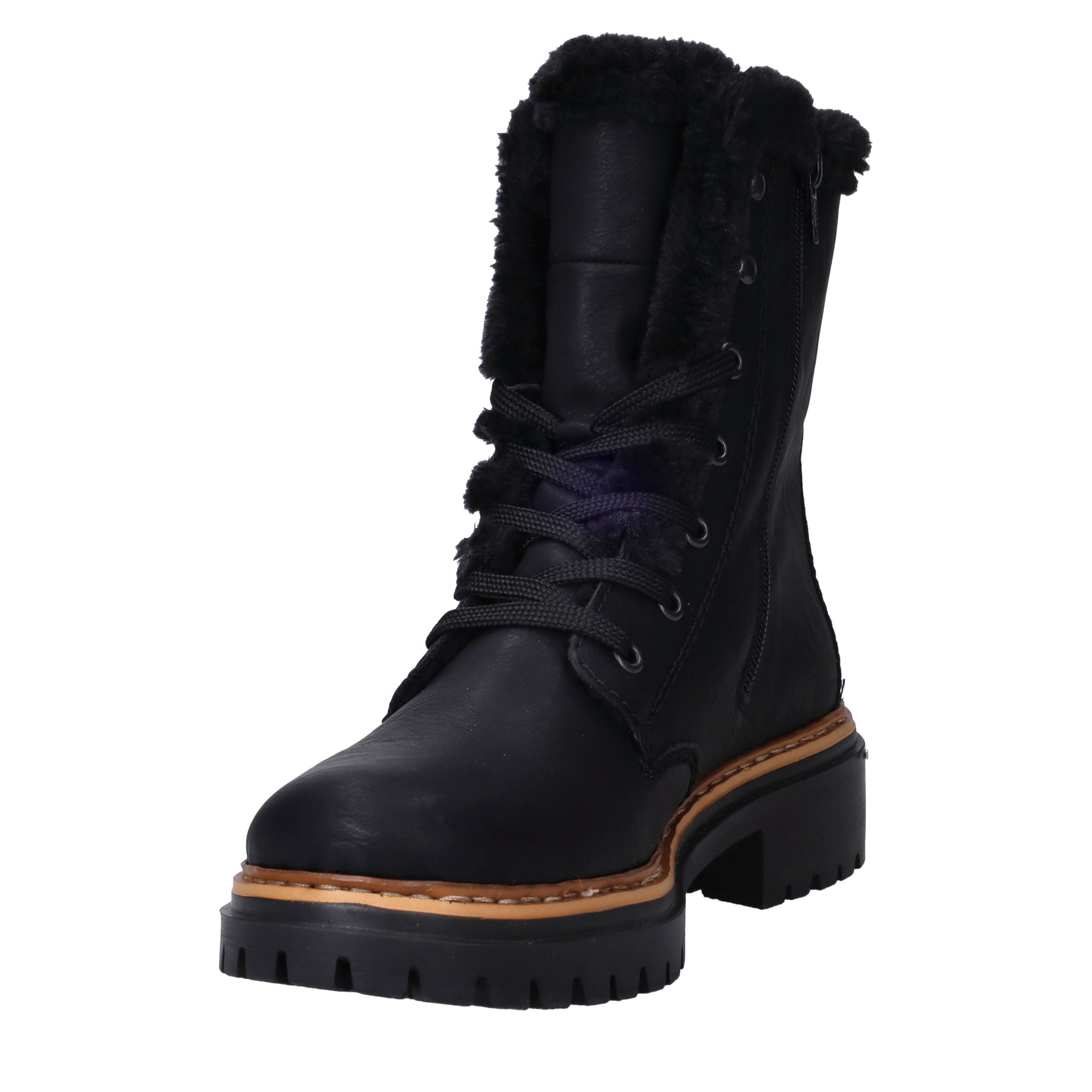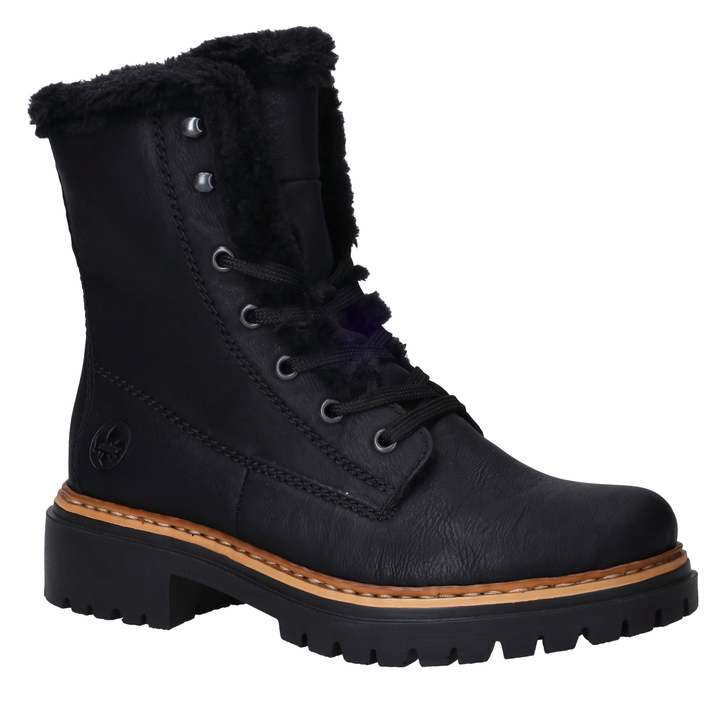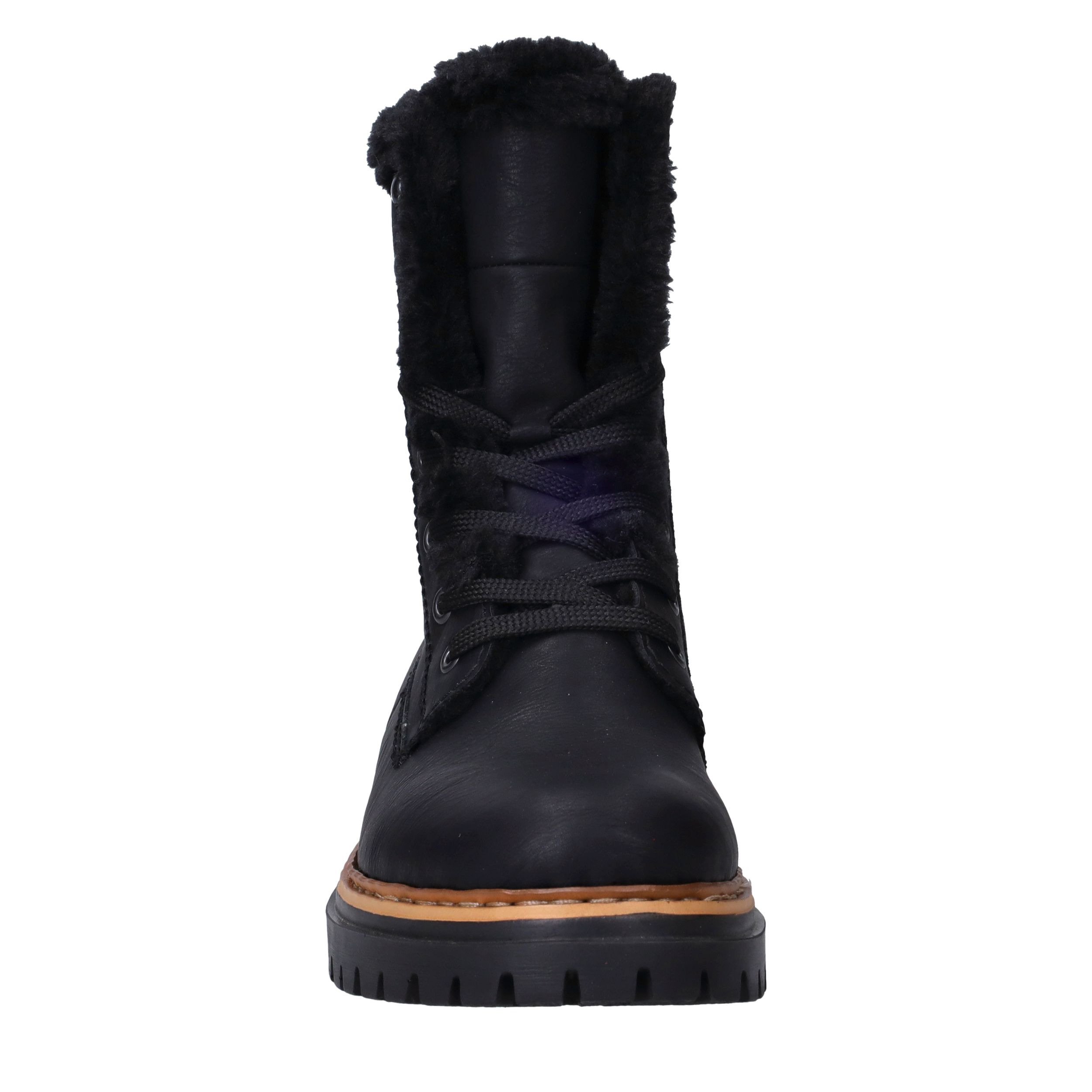 Deze zwarte Rieker veterboots combineren robuuste uitstraling met heerlijk comfort. Dankzij het warme gevoerde binnenwerk blijven je voeten aangenaam warm tijdens koude dagen. Het kunstleer aan de buitenzijde geeft de veterboots een stoere look die makkelijk te combineren is met elke winteroutfit. De combinatie van vetersluiting én rits zorgt voor zowel stijl als gebruiksgemak.